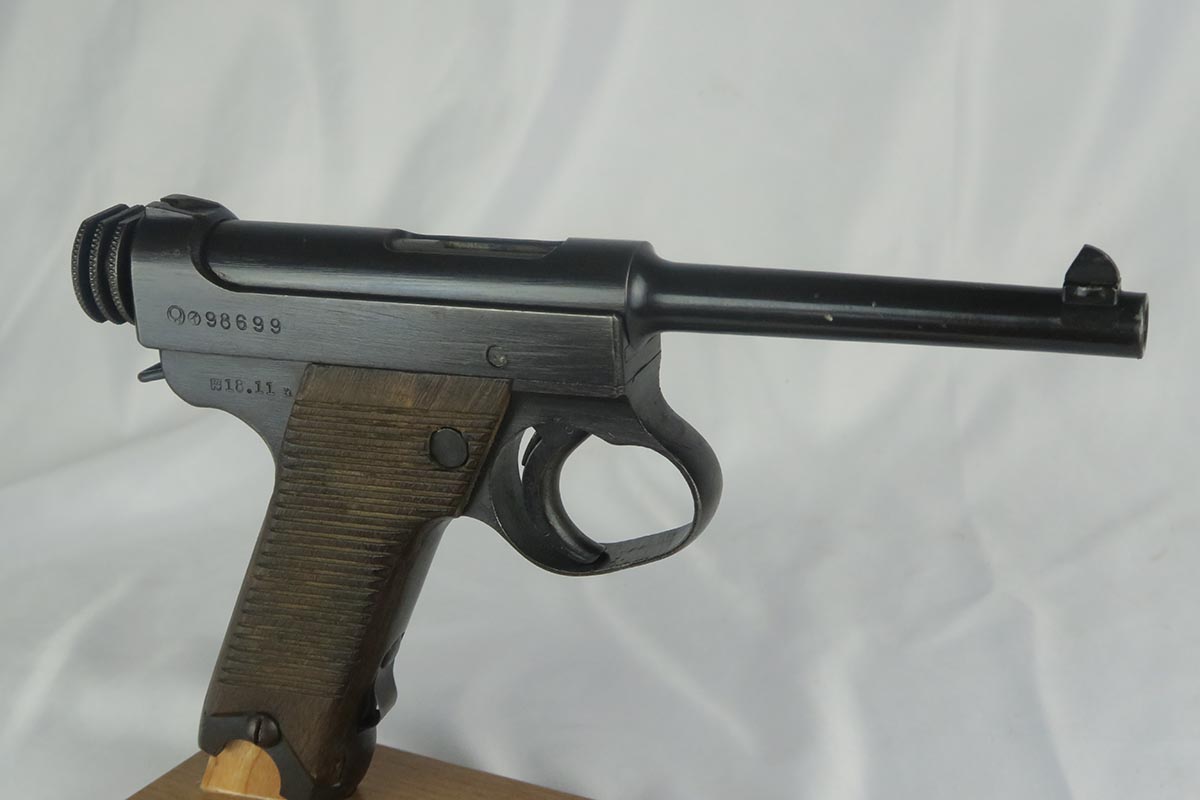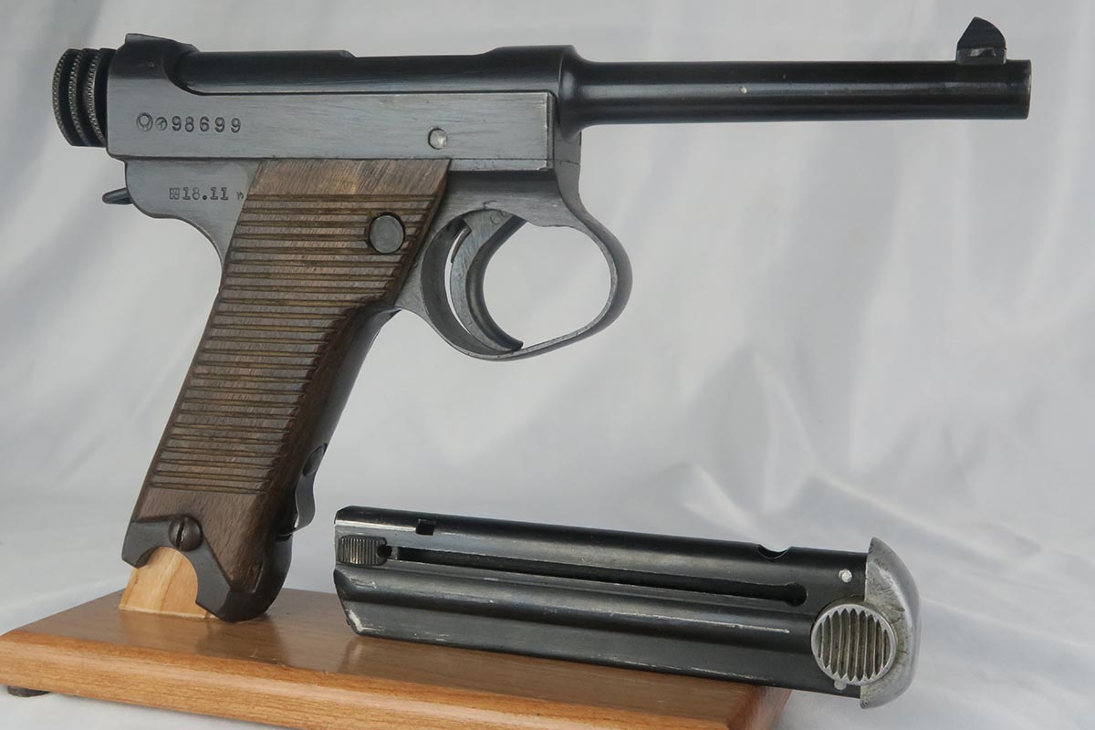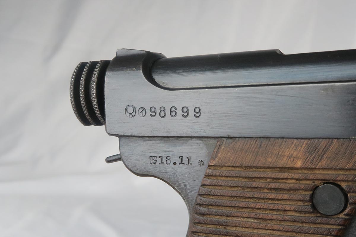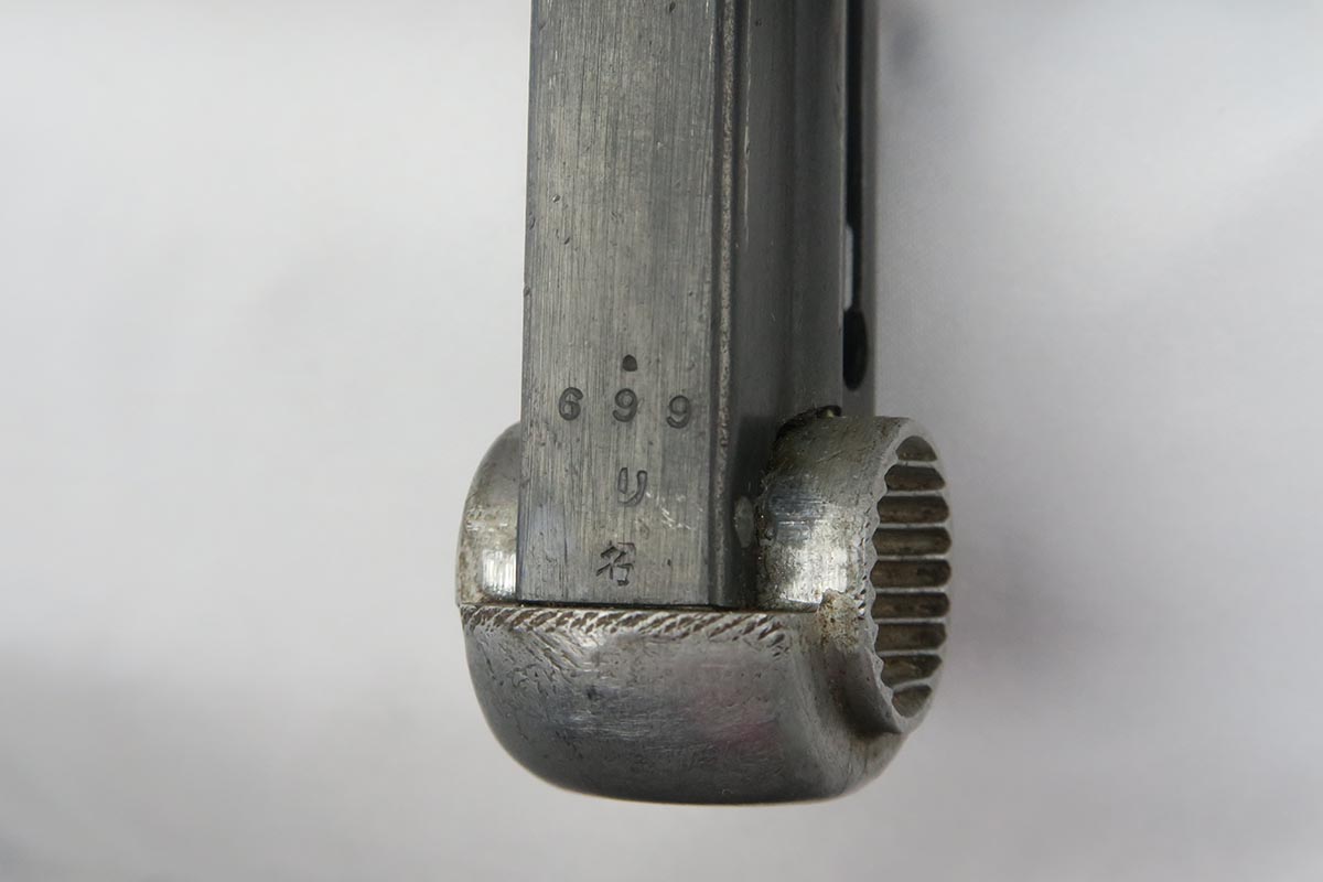 10/23/17 – This is an all original and matching Type 14 Nambu that was manufactured at the Nagoya Army Arsenal in 1943.  This is one of the last of these pistols manufactured there, as the serial range for these pistols ended at 99,999 and this one is 98,699.  This pistol features matching grips and the original matching magazine, with about 95% blue remaining.  Thinning on the straps accounts for the majority of the finish loss.  Bore is MINT.