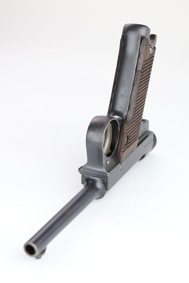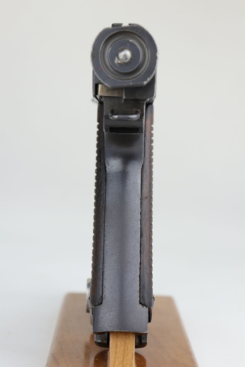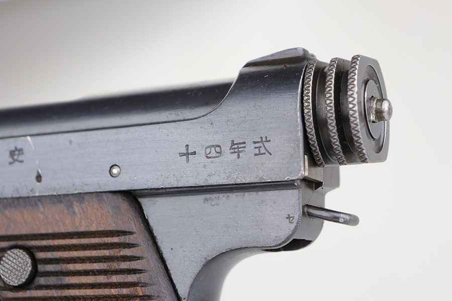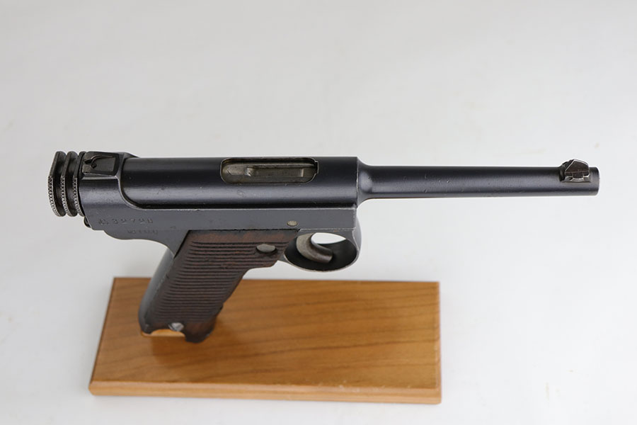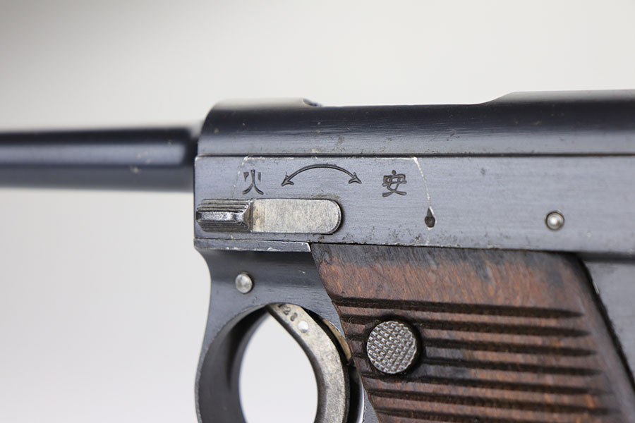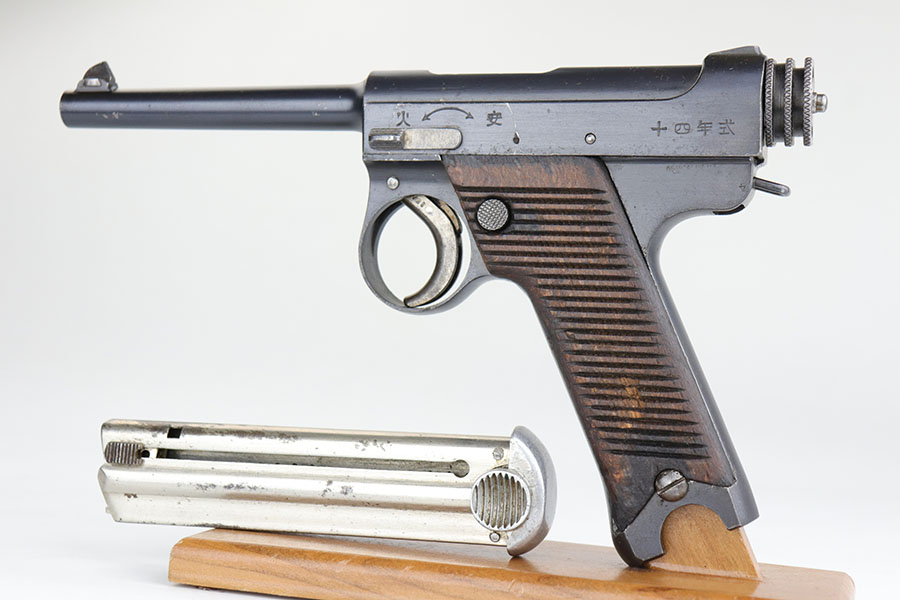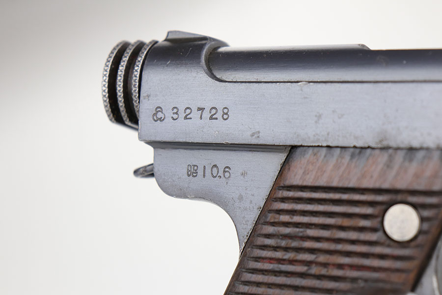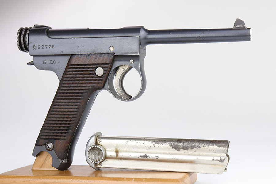 4/18/20 – This is an all matching and original Type 14 Nambu as made at the Tokyo Arsenal in June of 1935. It still has one of the original, matching magazines. The bluing rates at about 97% as there is minimal finish loss, but the straps and right side of frame do show some oxidation/patina. The grips are unmarked and in good condition, though both panels do show a couple of dings/nicks. Mint bore.