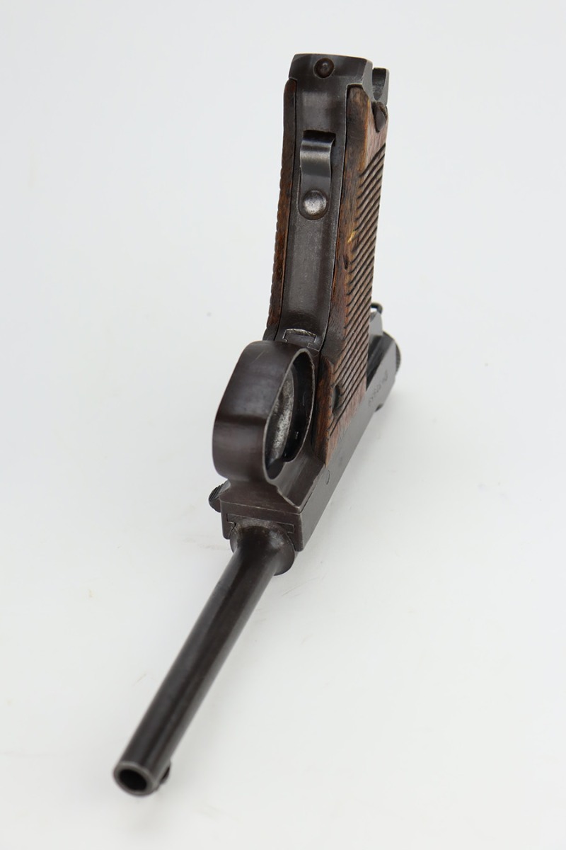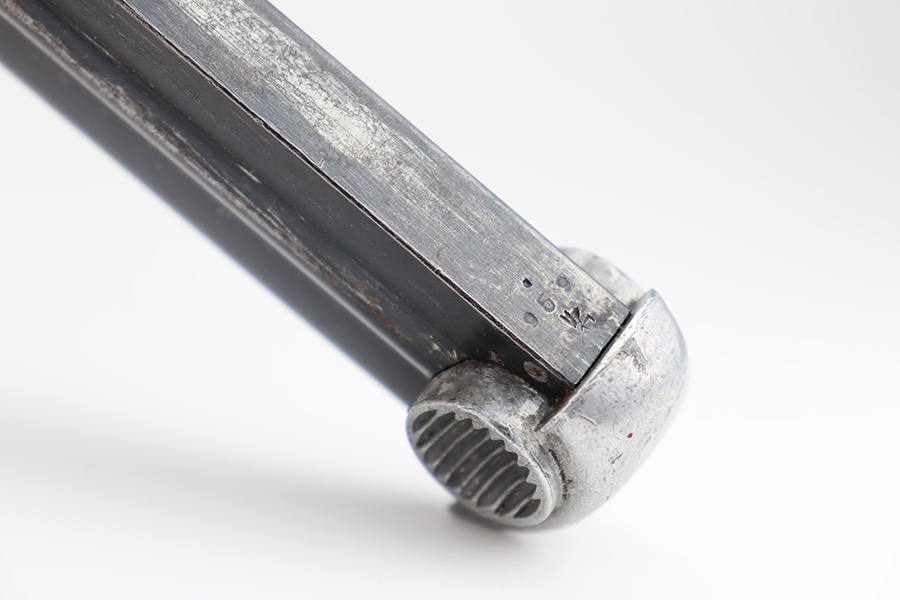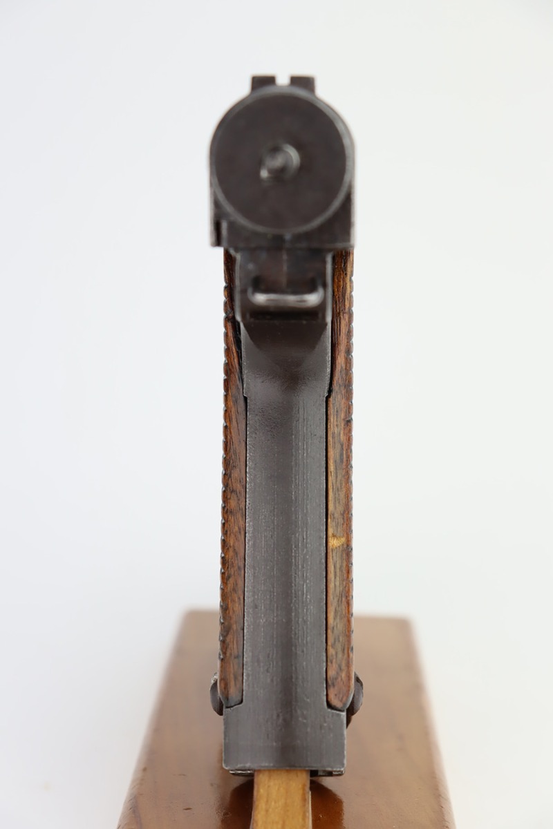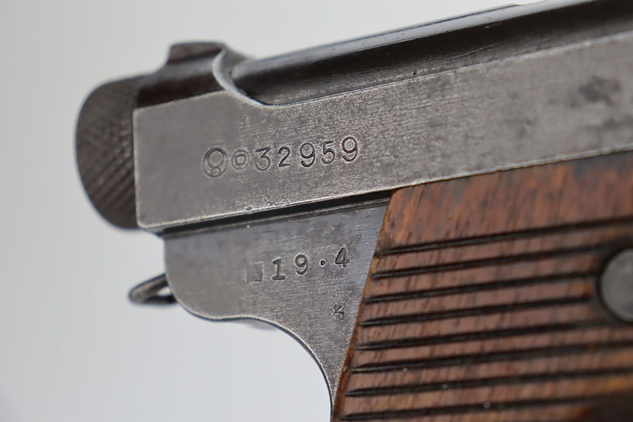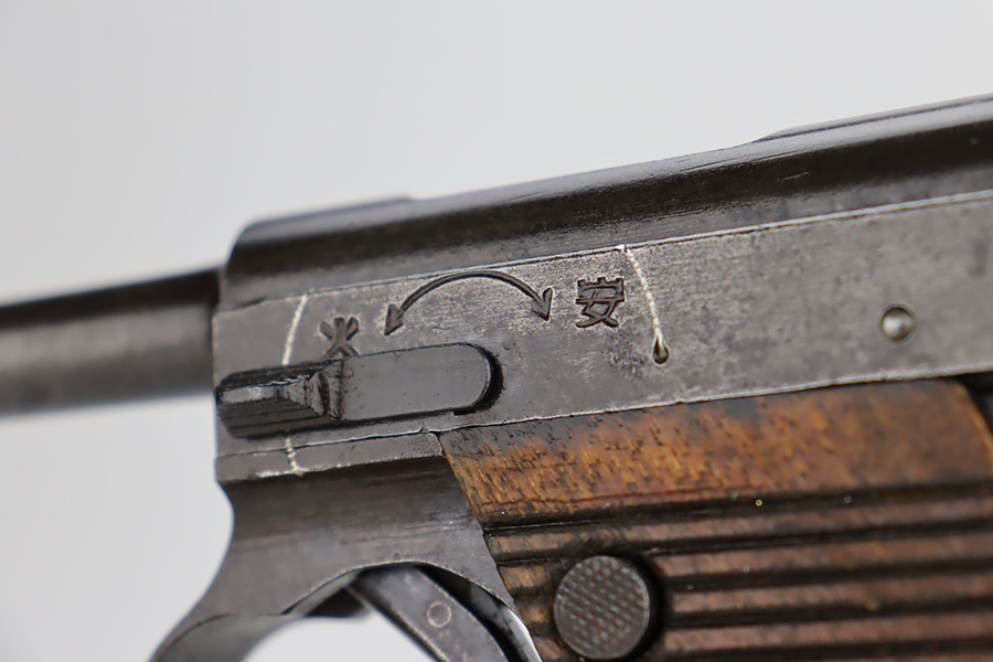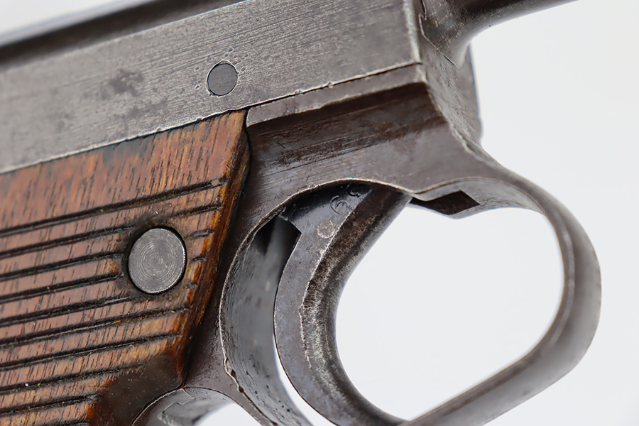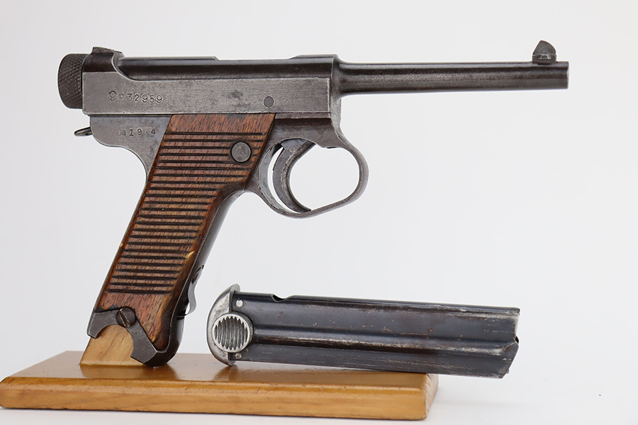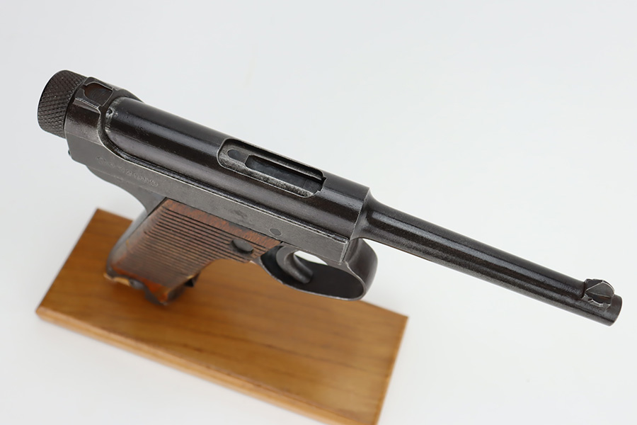 12/3/23 – This is a very nice example of a Type 14 Nambu used by the Imperial Japanese Army. The handgun is in good condition and has the majority of its original finish, but has some prickling of corrosion throughout. The right side of the handgun has more finish loss than the other. This pistol has matching serial numbers on the following parts: receiver, barrel, cocking knob, trigger assembly, both wood grips, magazine, and bolt. The locking block does not match and the firing pin assembly has no serial numbers on it. The bore is bright with great rifling but there is prickling of corrosion at the muzzle.