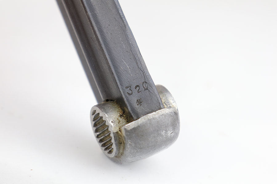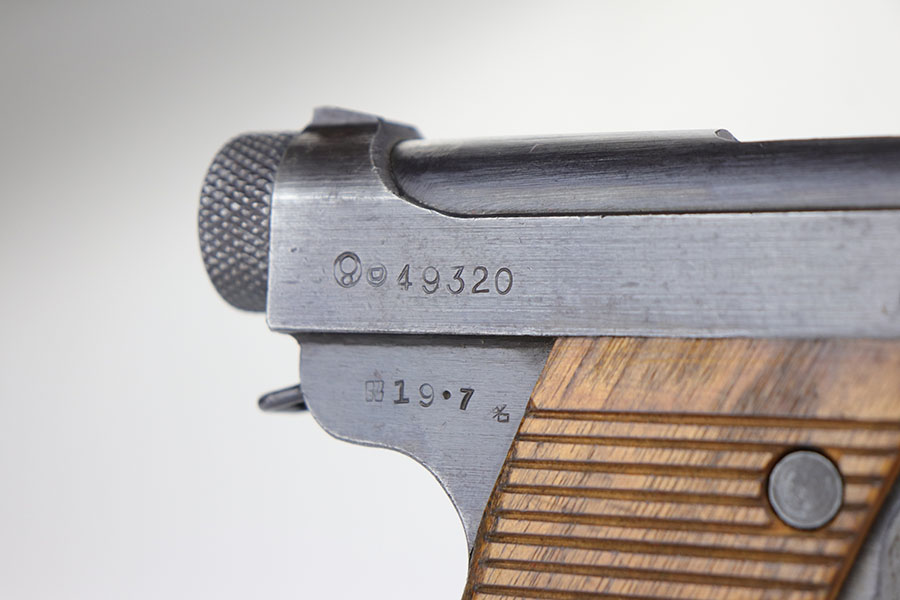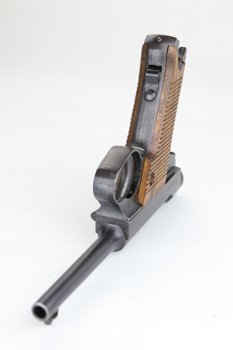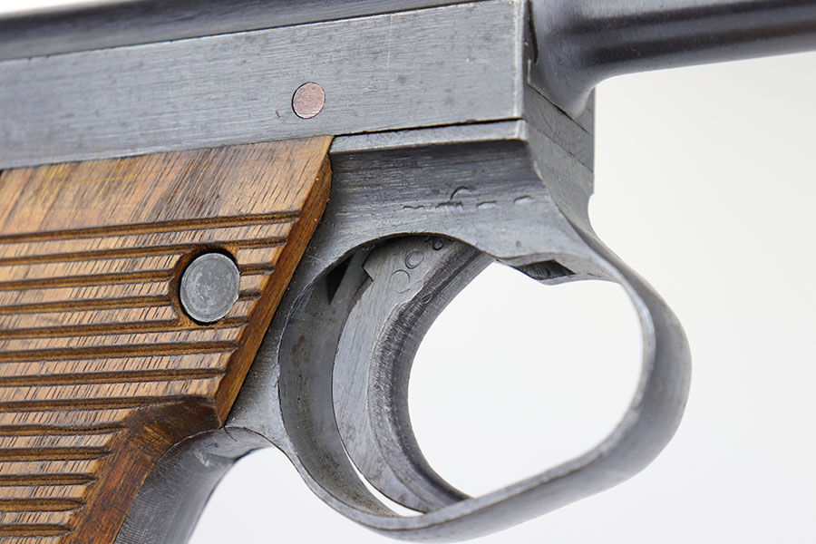 4/18/20 – This is a very nice and all original Type 14 Nambu as produced at the Nagoya Arsenal in July of 1944. It is all matching, including the magazine and grips. Original blue shows some edge wear on rear edges of frame, and there’s a little bit of thinning on the straps. Bore is mint. Grips are excellent, as well.