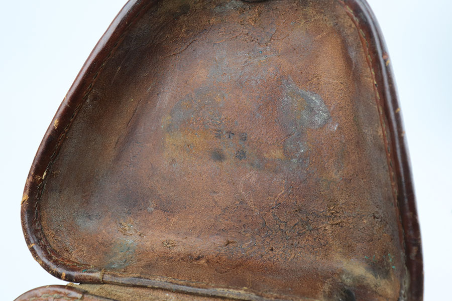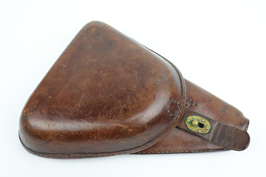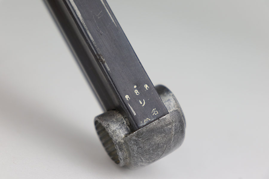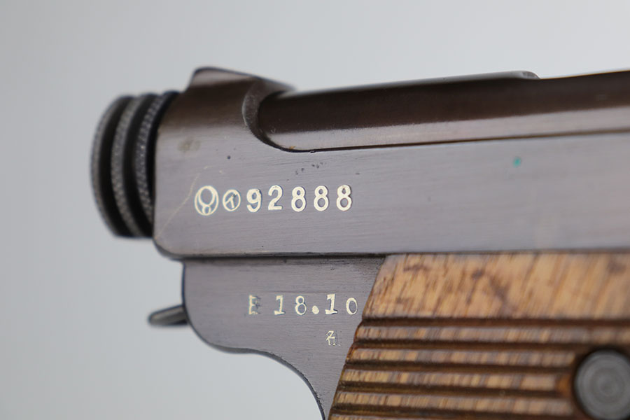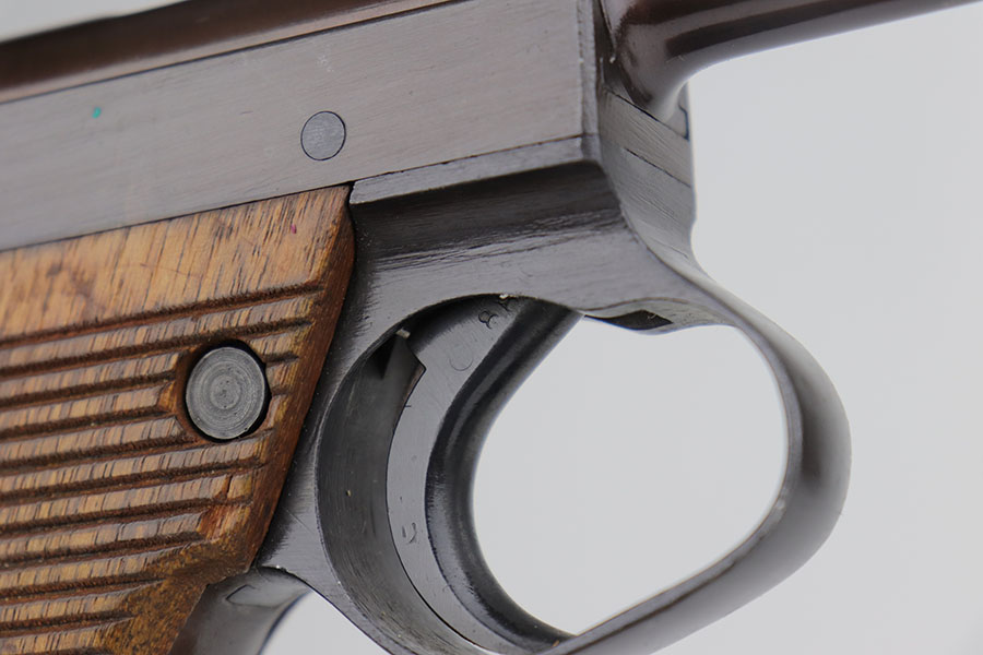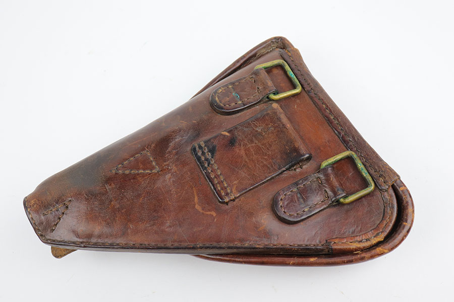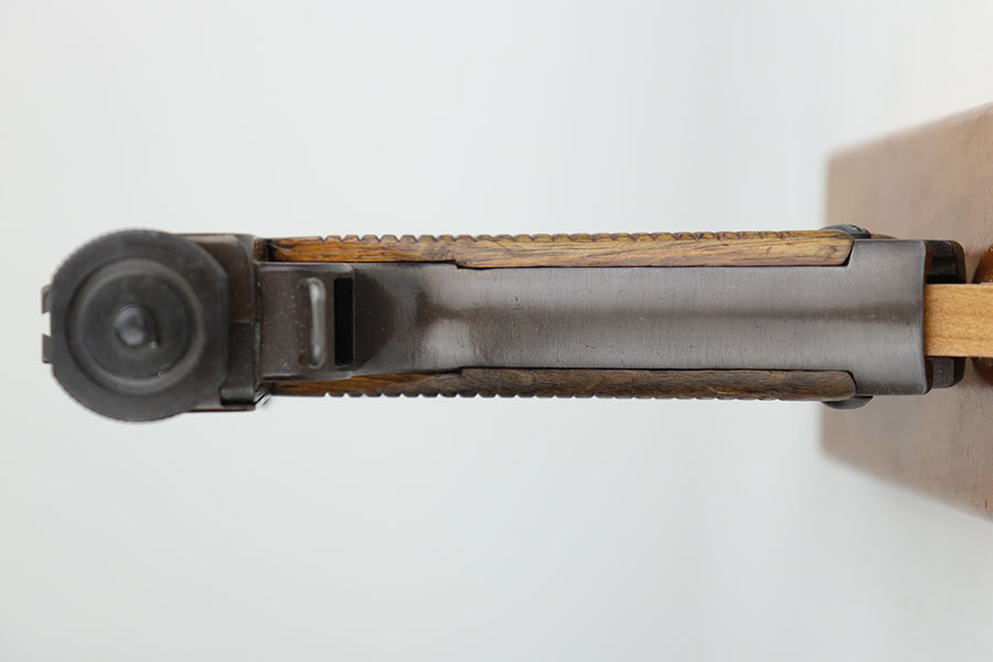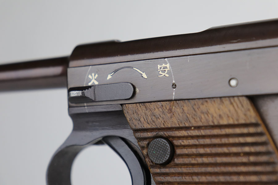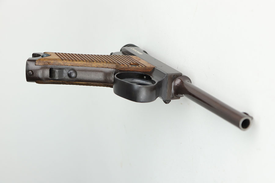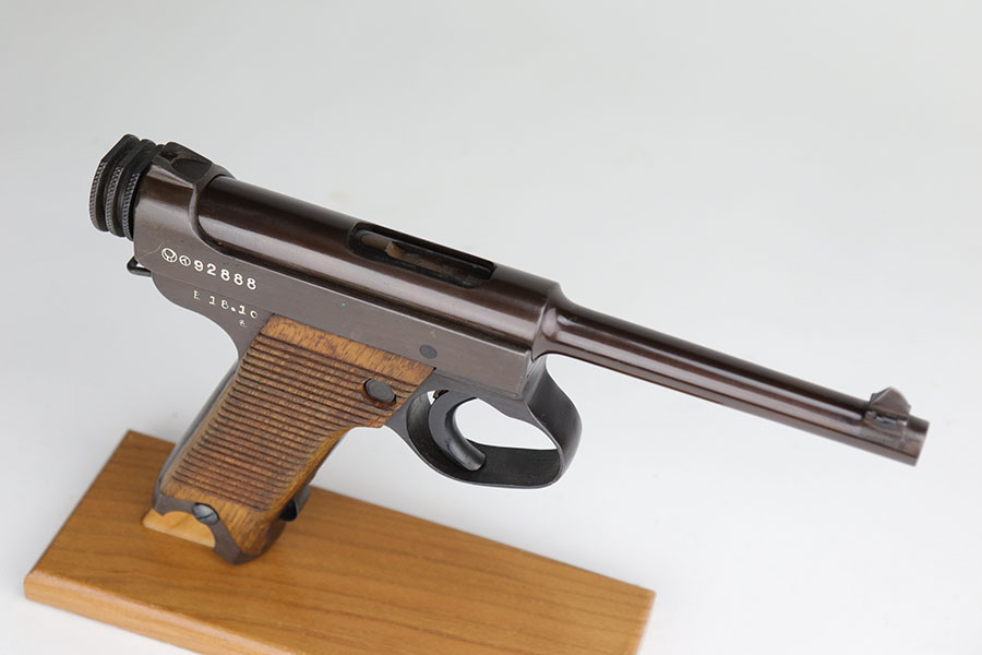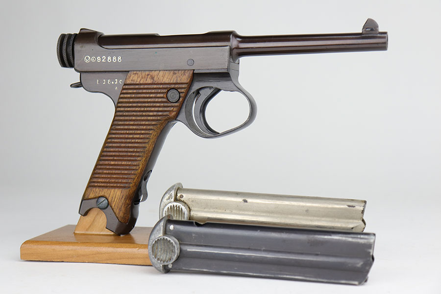 9/30/20 – This is a Japanese Type 14 rig that was made in October of 1943 at the Torimatsu branch of the Nagoya Arsenal. It comes with one of the original, matching magazines, as well as a mismatched spare, holster, firing pin and cleaning rod. The pistol finish rates at 98-99% but does appear to be an arsenal refinish. The grips are numbered and matching to the gun and in excellent condition. Mint bore. The leather holster is in very good condition with some edge handling wear but no major defects. The rig includes an original spare firing pin and cleaning rod.