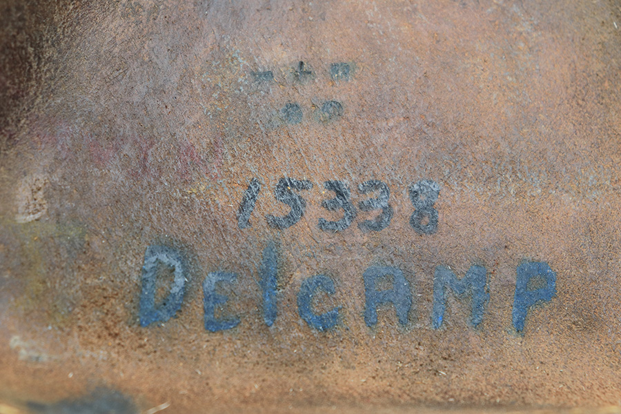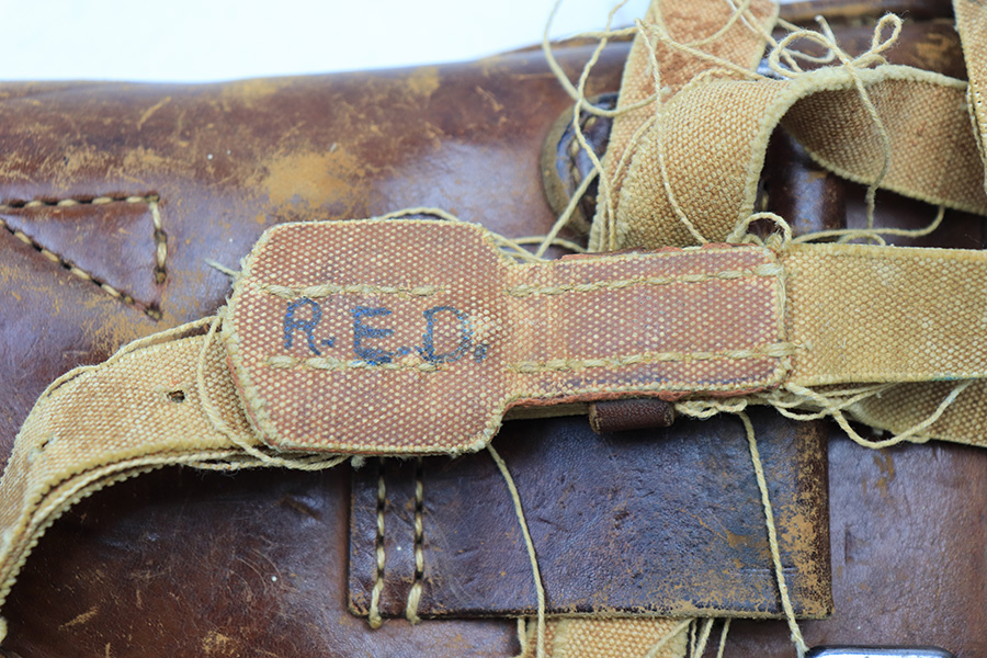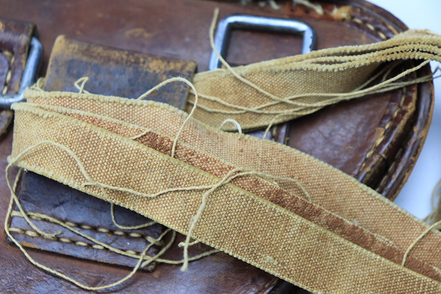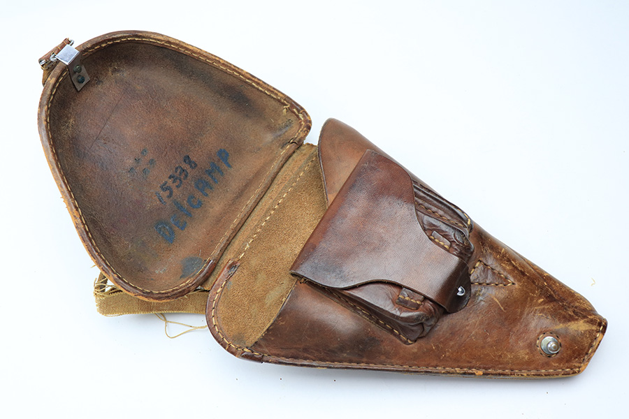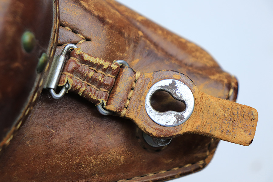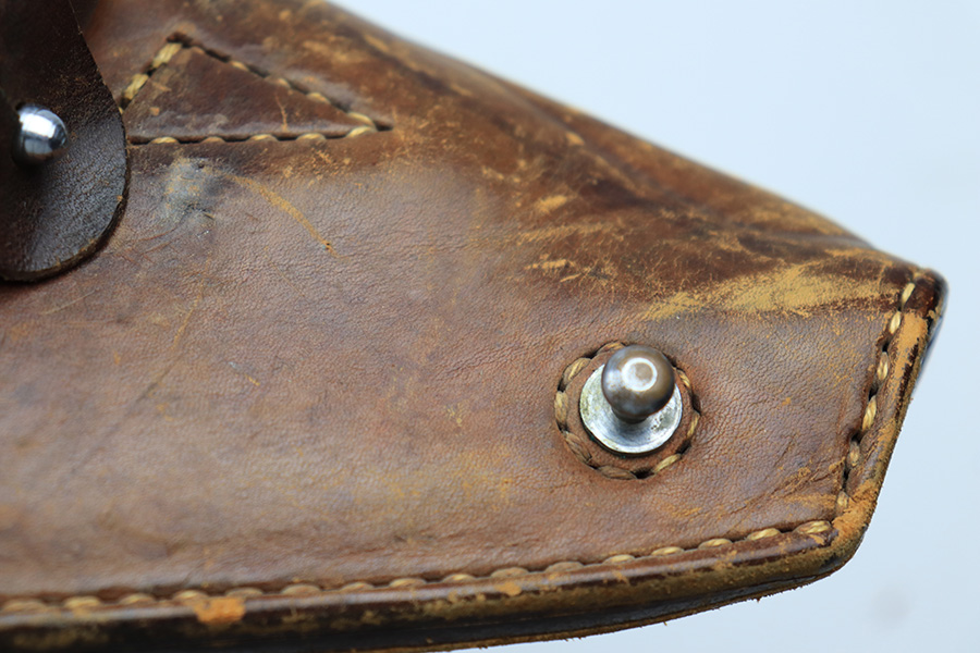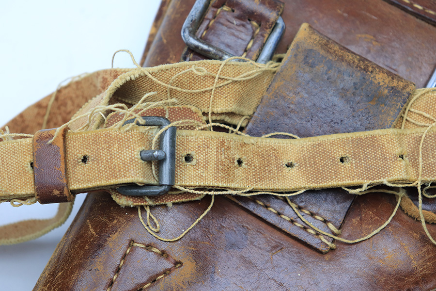 4/5/22 – This is an original leather Type 14 Nambu holster from WW2. The all-leather construction holsters are fairly scarce as Japan only had resources for these during the early years of WW2. The holster is in good overall condition despite some scuffing and surface wear throughout. The lid has some missing stitches, but is still attached without issue to the body of leather. The interior leather is ink stamped from the Japanese factory but also has some hand-writing as shown. The back belt loop has a later WW2 production canvas / leather shoulder strap. This is fairly tattered but all original.