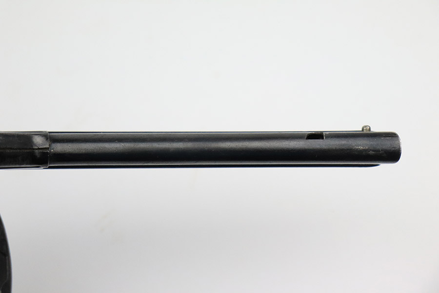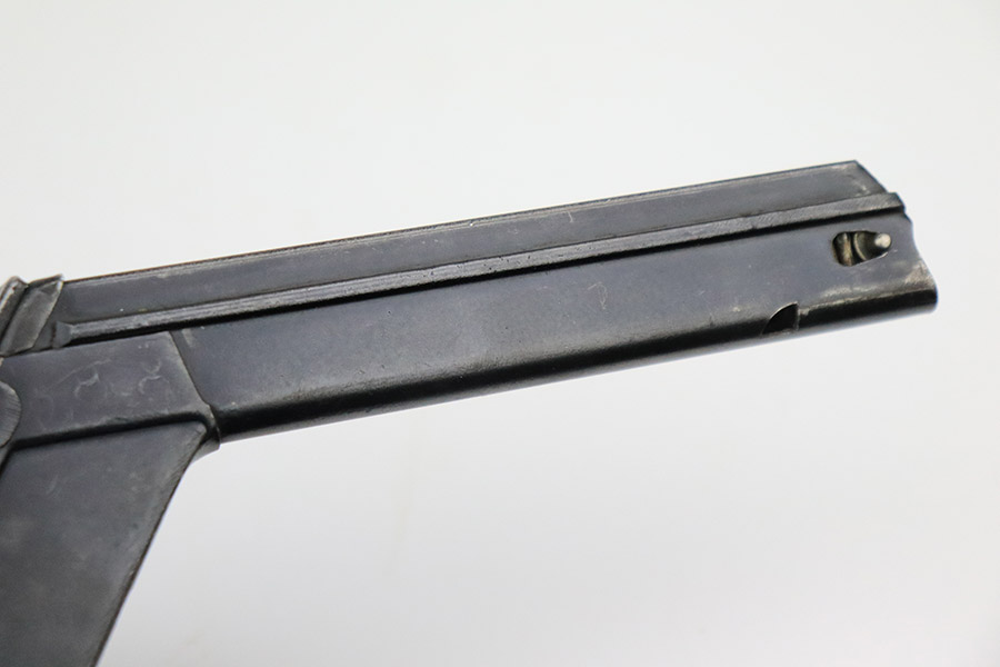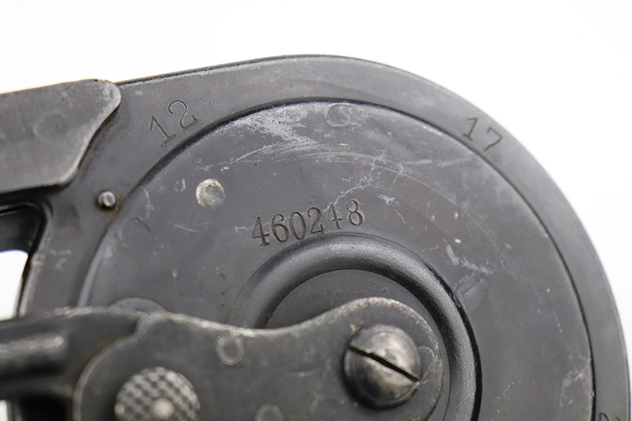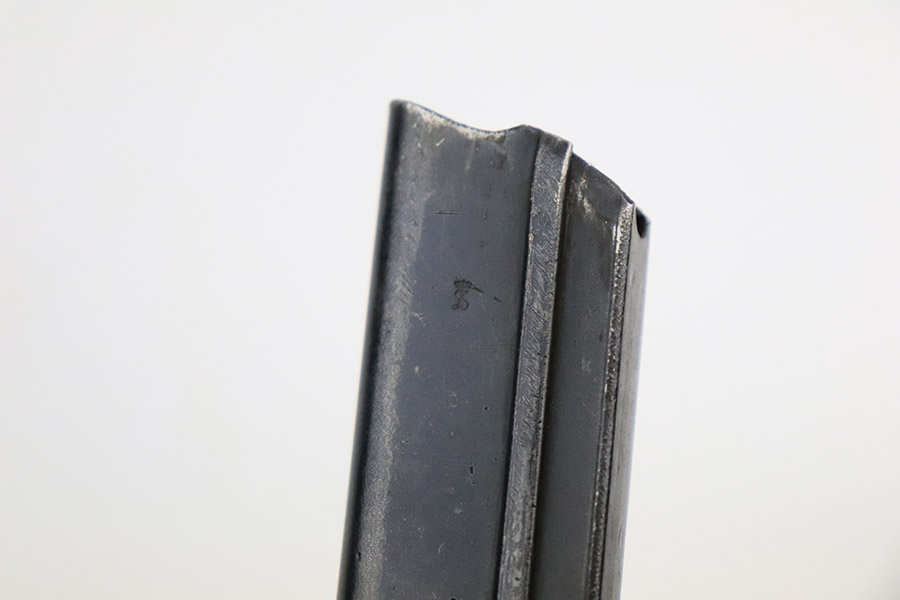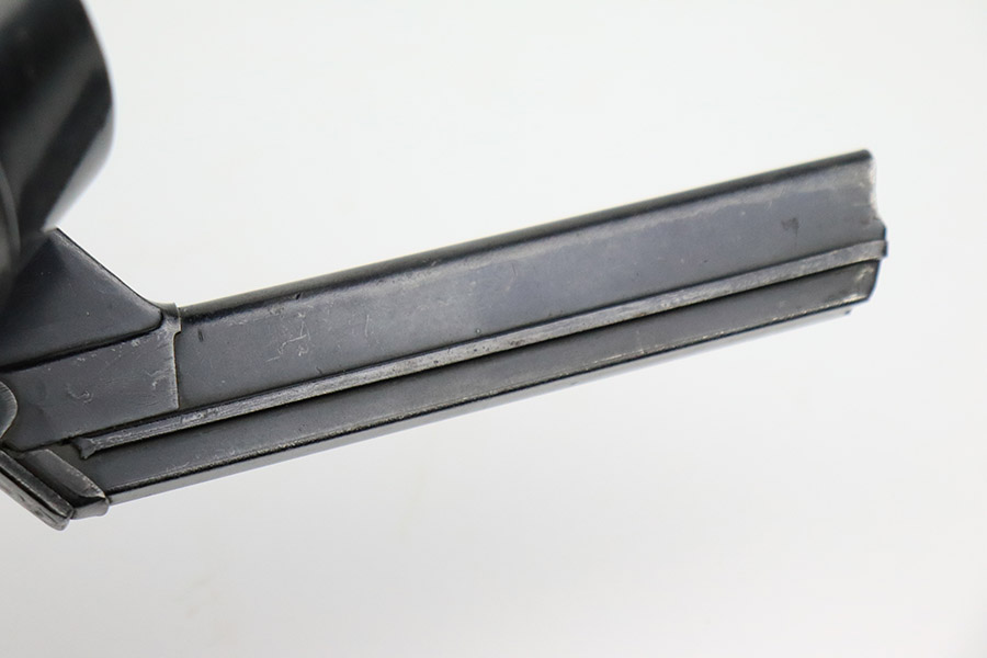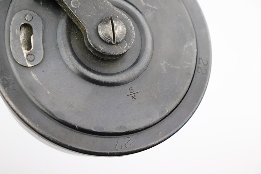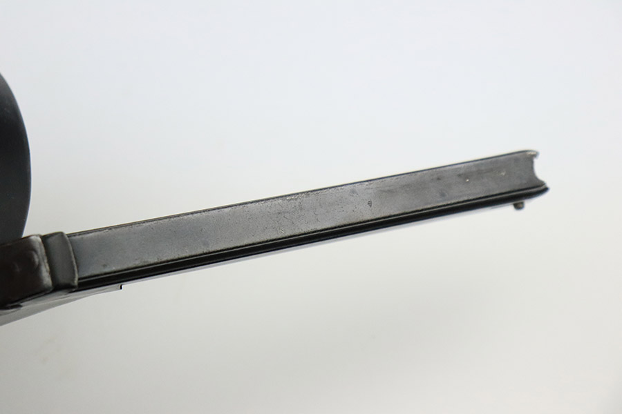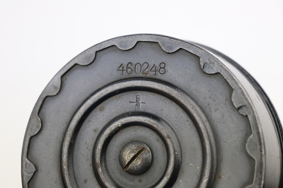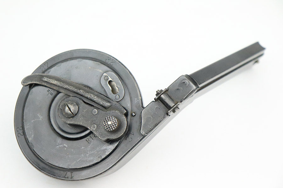 10/25/22 – This is an excellent example of an original type 2 snail drum magazine for a WW1 Artillery Luger. The magazine has retained a majority of its blued finish, showing almost no signs of use wear/finish loss. There are small areas of patina as well as oxidation on the front and back of the magazine’s drum. The left-hand side of the magazine tube features an imperial crown/s proof near the follower. The front and back of the magazine’s drum are marked with serial number “460248” and Bing maker markings. The spring and loading arm strong and functional.
