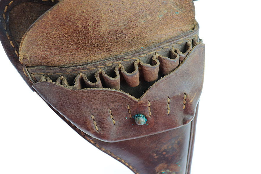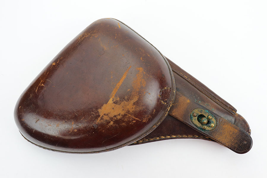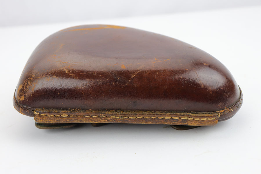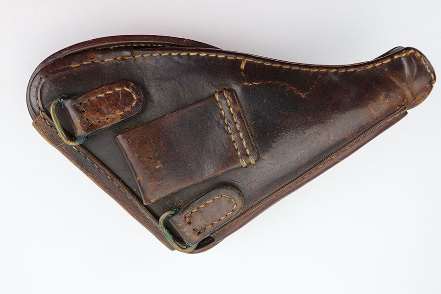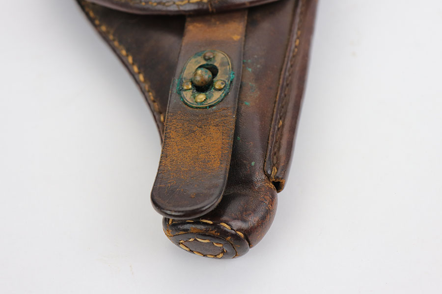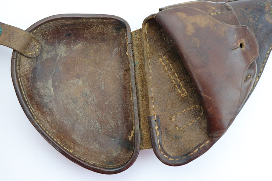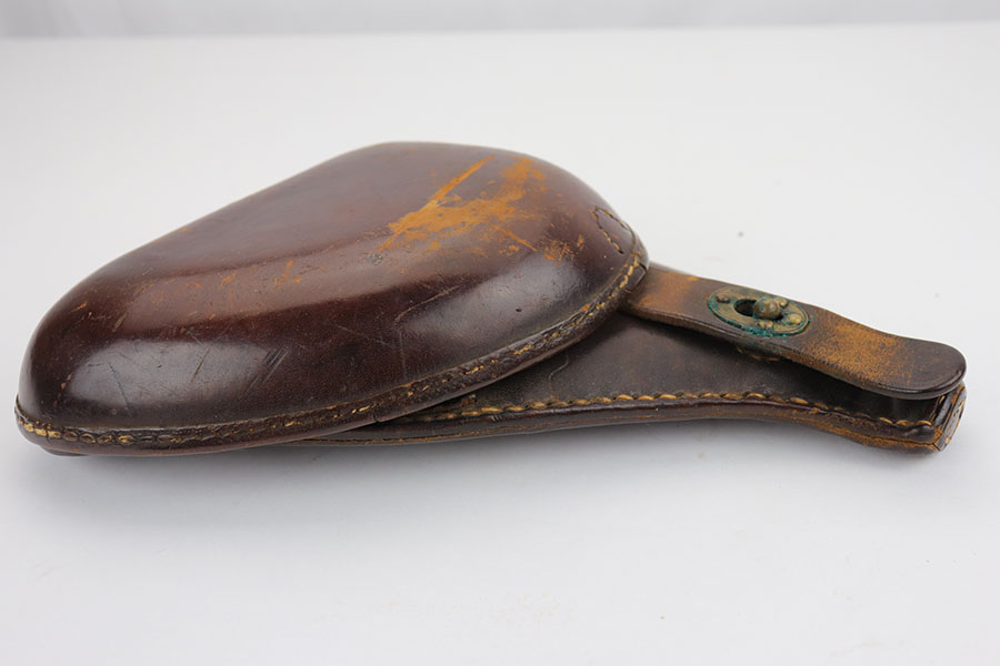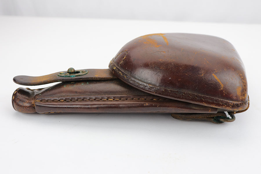 1/10/20 – This is an original early WW2 era production (1930s) Type 26 Nambu revolver holster. The holster is all leather with brass fixtures. There is some scuffing on the front / lid of the holster, but generally the leather is in great condition with no major issues and completely in tact. All original stitching is in tact as well. Internal pouch holds individual rounds of ammo, and is completely in tact as well.