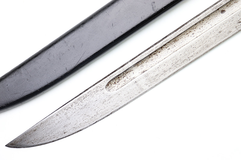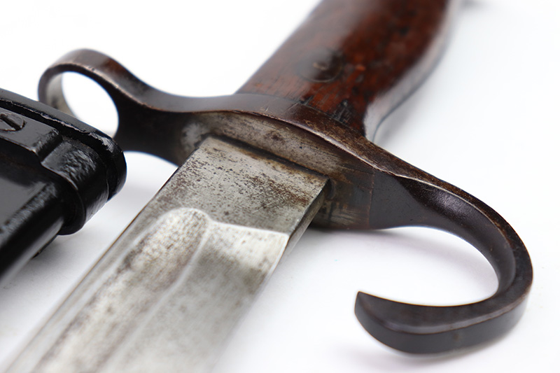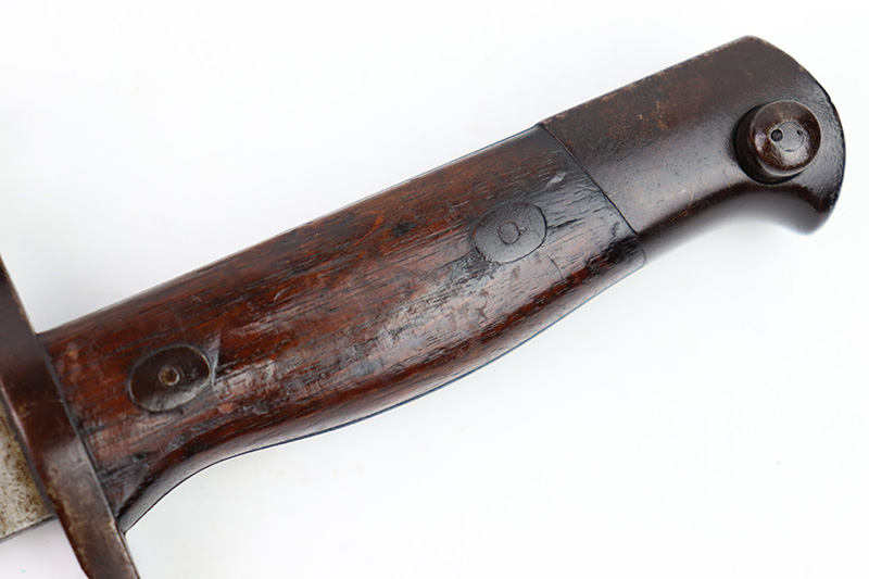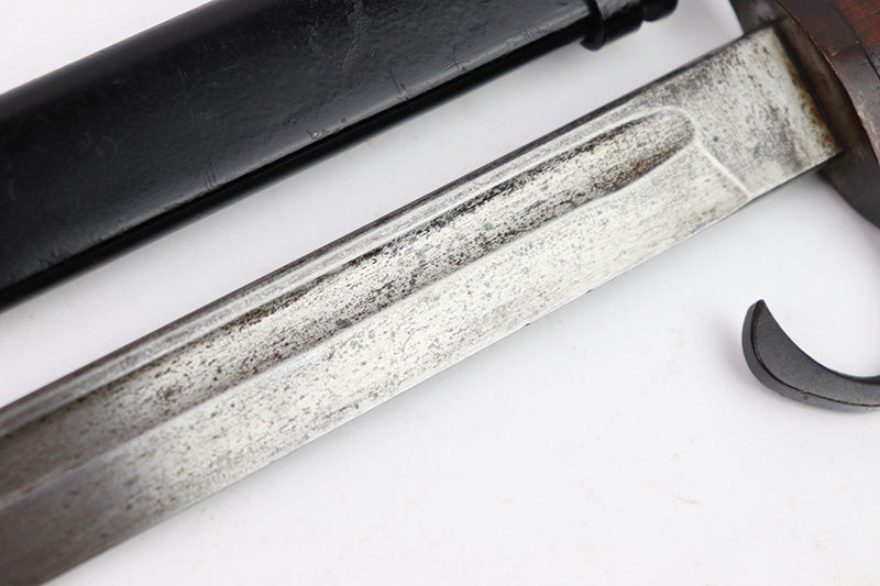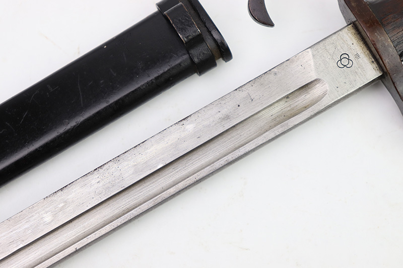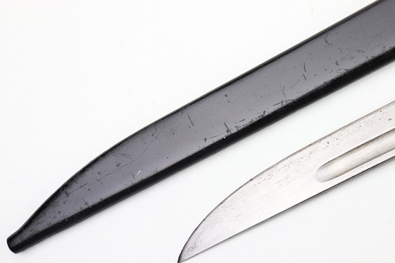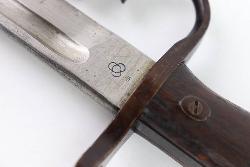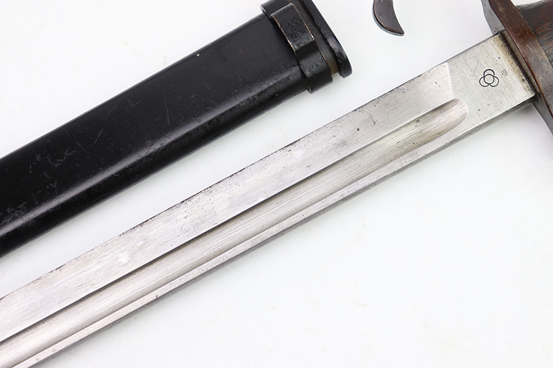 8/24/22 – This is an original WW2 production Type 30 bayonet for the Arisaka Type 38 and Type 99 rifles. The bayonet is in great overall condition with some spotty oxidation and surface discoloration on the blade. The ricasso is maker stamped on one side as shown. There’s some mild signs of sharpening that goes about halfway down the blade from the tip. The wood handle, hand guard, and pommel all have surface wear, patina, and signs of aging but no major issues. Come with an original scabbard in excellent condition.