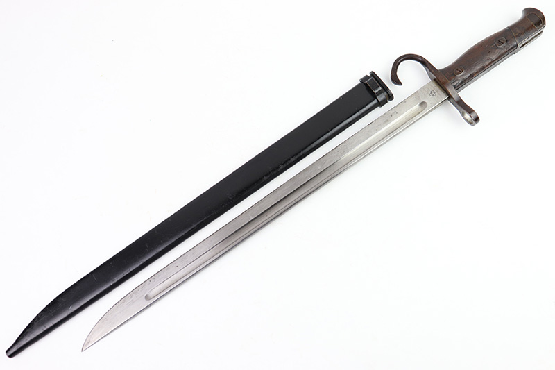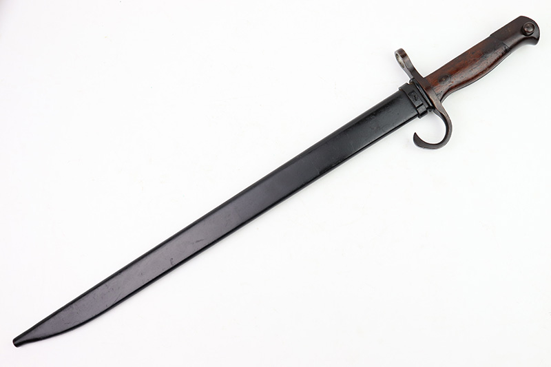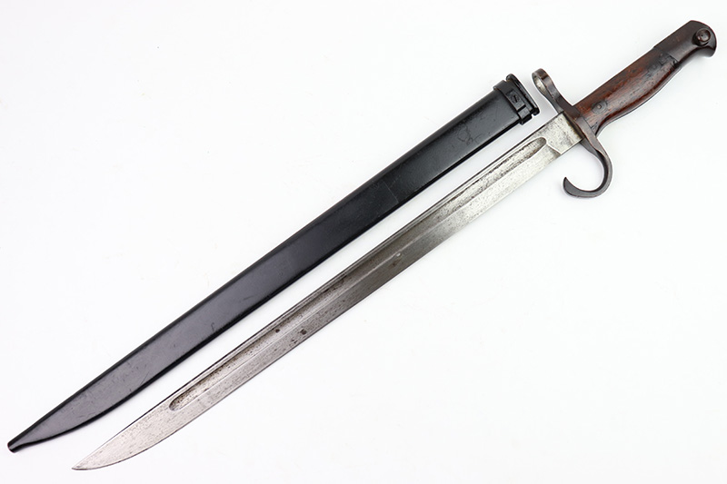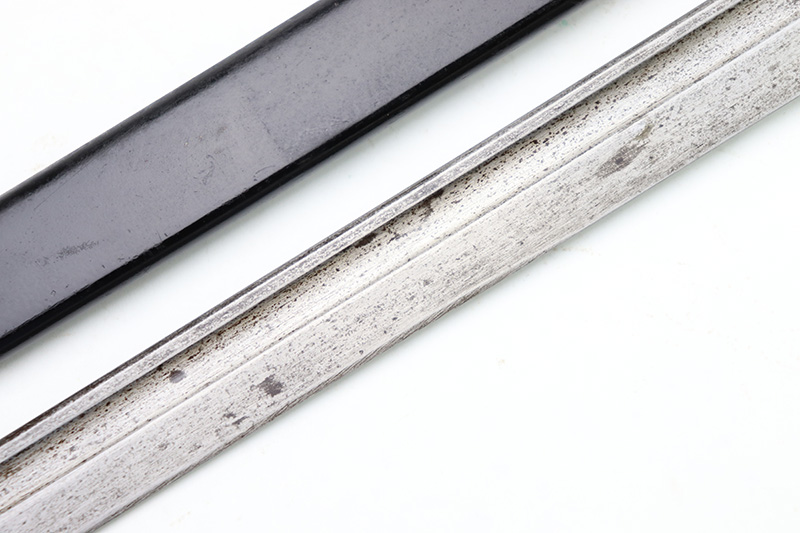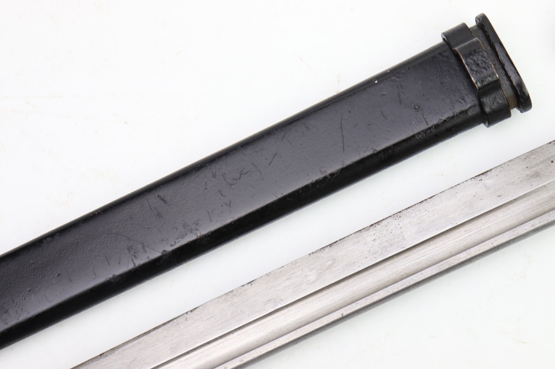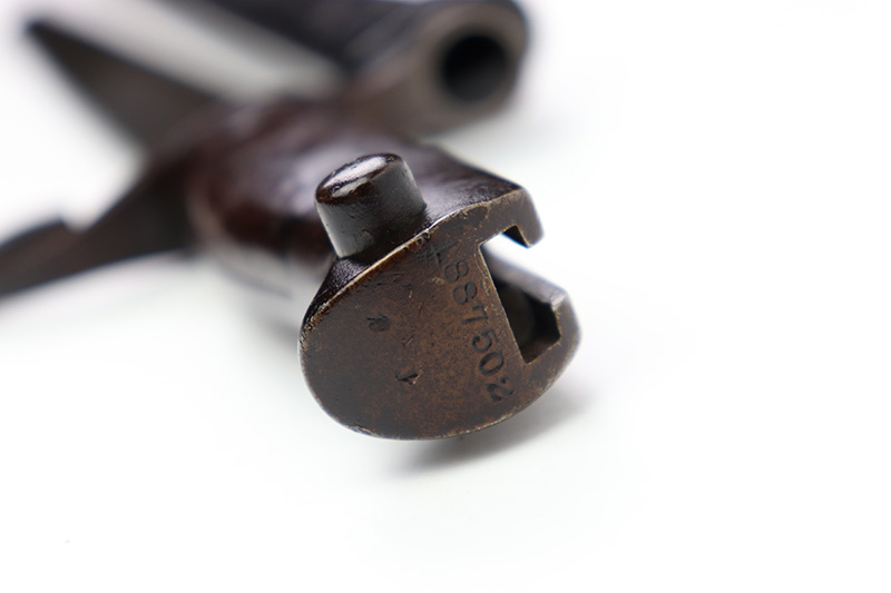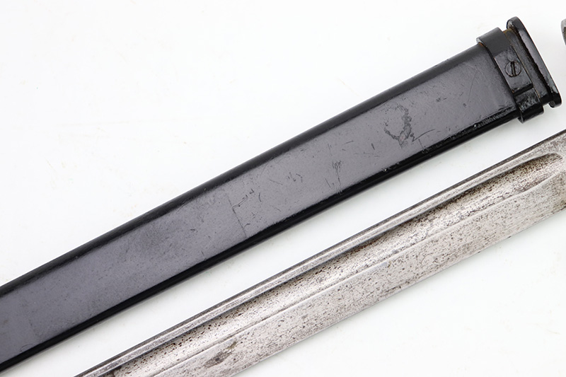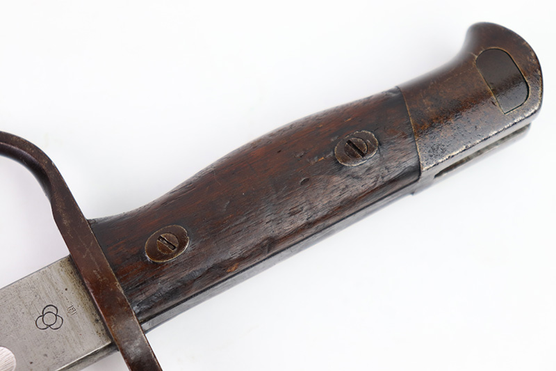 8/24/22 – This is an original WW2 production Type 30 bayonet for the Arisaka Type 38 and Type 99 rifles. The bayonet is in great overall condition with some spotty oxidation and surface discoloration on the blade. The ricasso is maker stamped on one side as shown. There’s some mild signs of sharpening that goes about halfway down the blade from the tip. The wood handle, hand guard, and pommel all have surface wear, patina, and signs of aging but no major issues. Come with an original scabbard in excellent condition.
