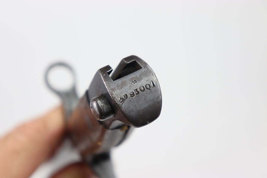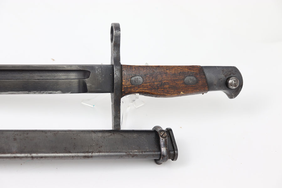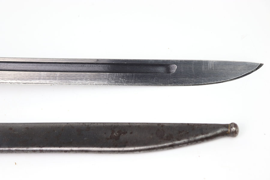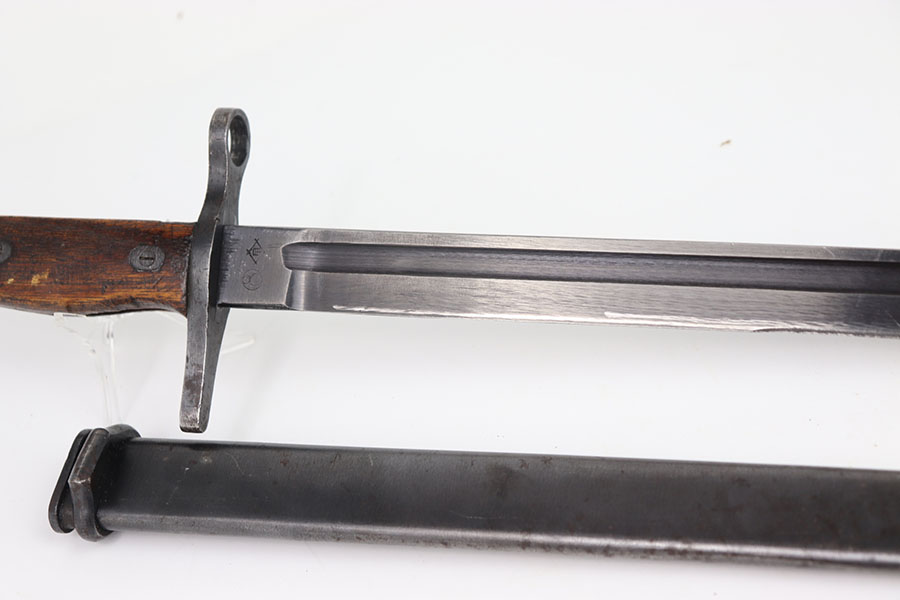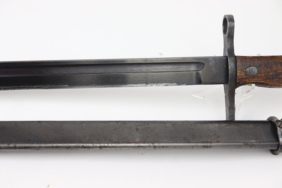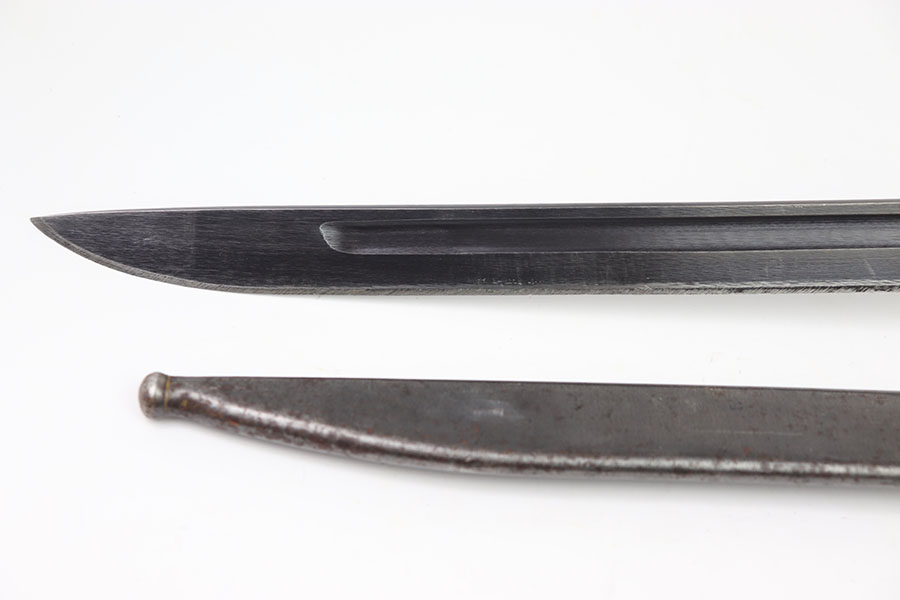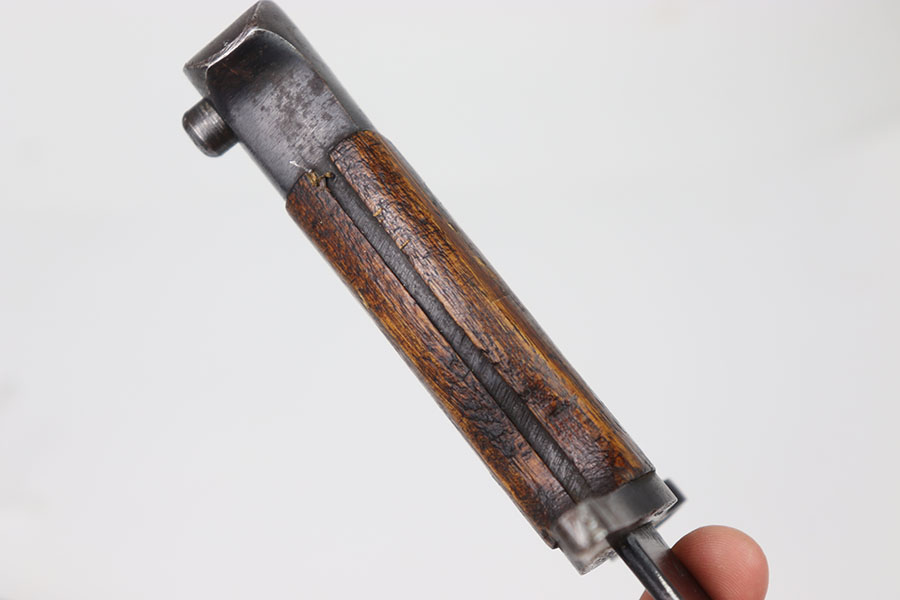 7/11/24 – This is an original Type 30 Japanese Rifle bayonet from WW2. This example is cited in Labar’s book as LB-126, Variation D. The bayonet features a blued, fullered blade that’s in excellent condition. Light sharpening along the edge and some mild thinning but no major issues. Maker stamped on the base of the blade. Natural patina on the straight crossguard and rounded bird’s head pommel. Nice two piece wood handles with screws and washers. Serial numbered on the pommel as shown. Comes with a metal cone tipped sheath that has small areas of light surface patina and no major dents or issues.