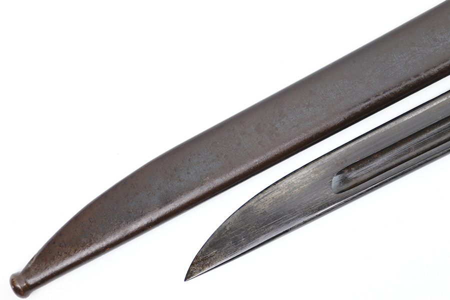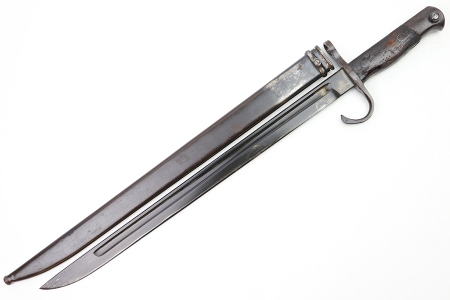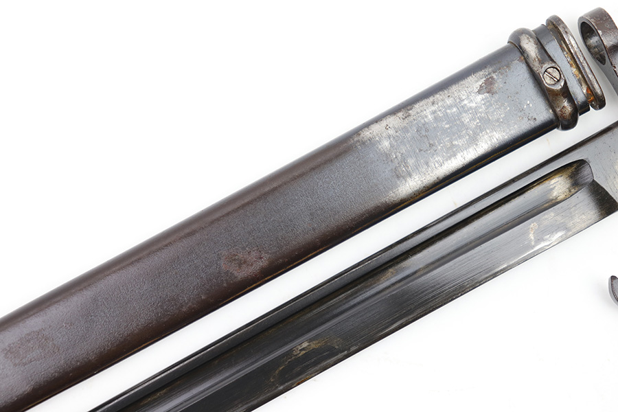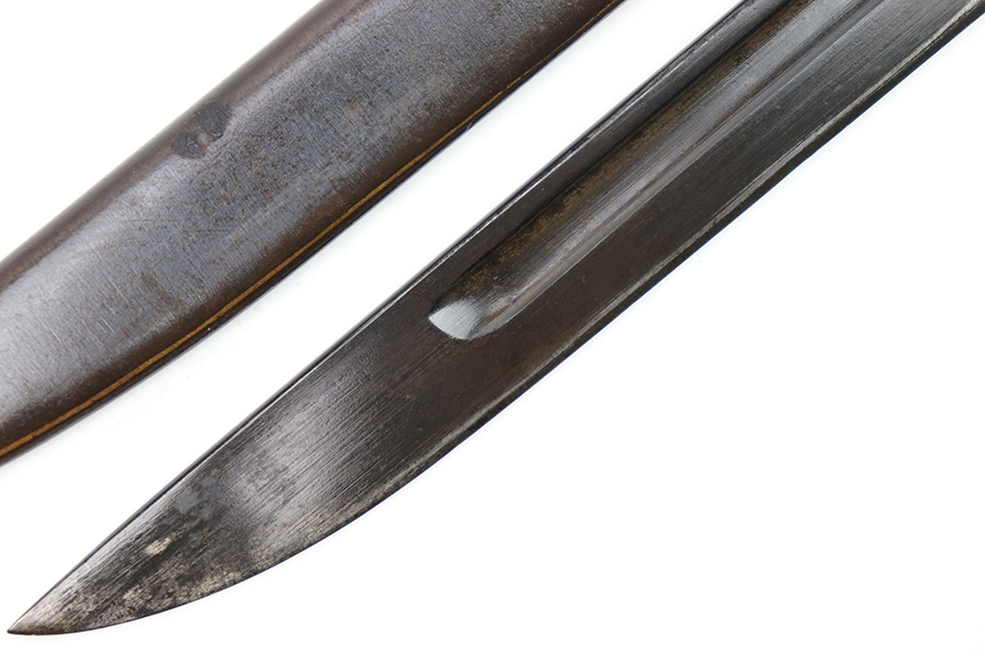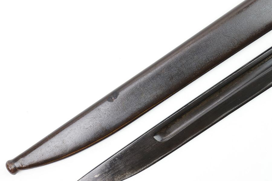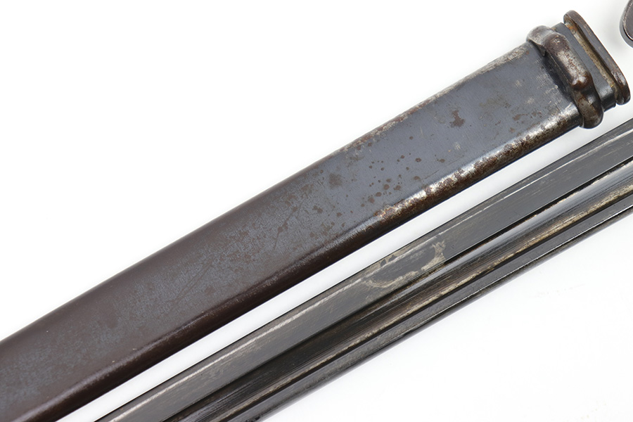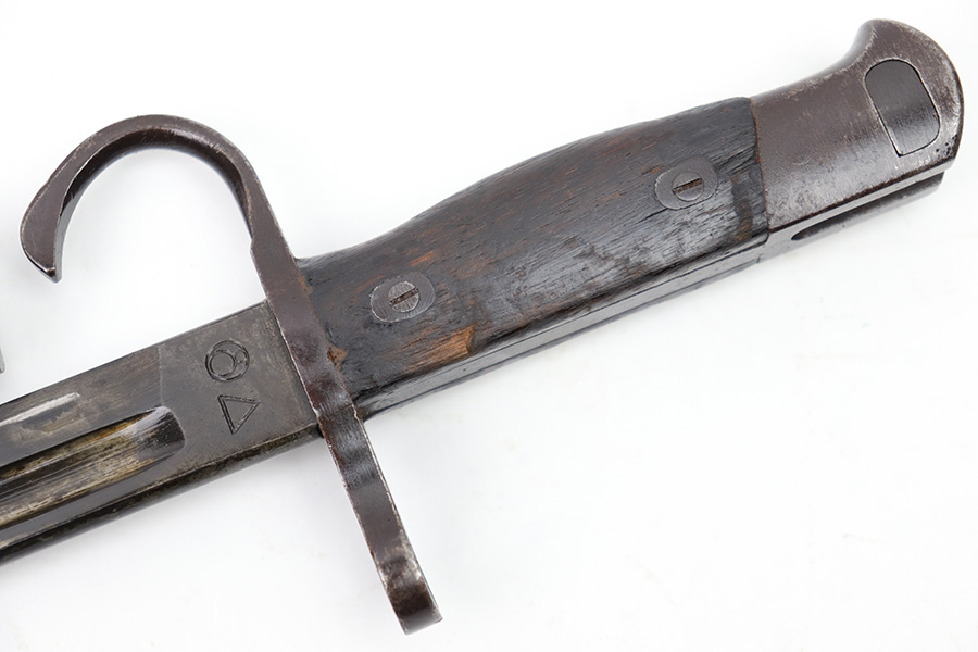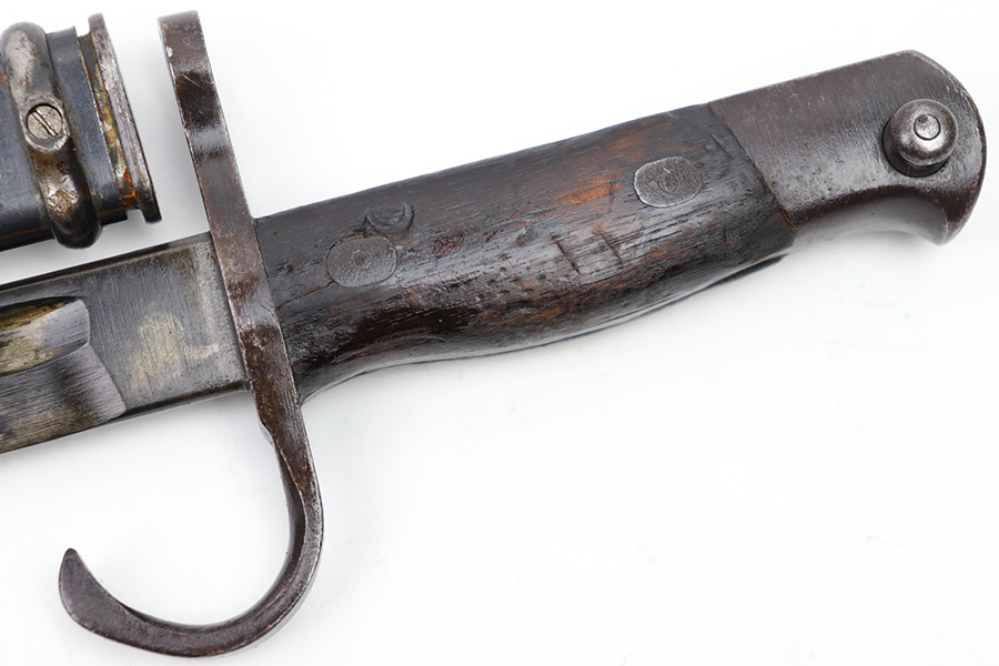 1/26/23 – This is an original Type 30 Arisaka rifle bayonet by Aisan Arsenal. The bayonet has earlier wartime features, such as a contoured wood grip with screws and washers, bird’s head pommel, hooked crossguard, and a blued, fullered blade. The blade has dark surface patina and light finish loss. The edge is in great shape with no signs of misuse. The crossguard and pommel have dark patina and edge wear, but no rust or pitting. The wood grips have a few dents and imperfections but are still in very good condition. Serial numbered and inspection stamped on the pommel. Comes with a metal ball-tipped scabbard that has dark patina throughout, as shown. Variation B, LB-137 in Labar’s book.