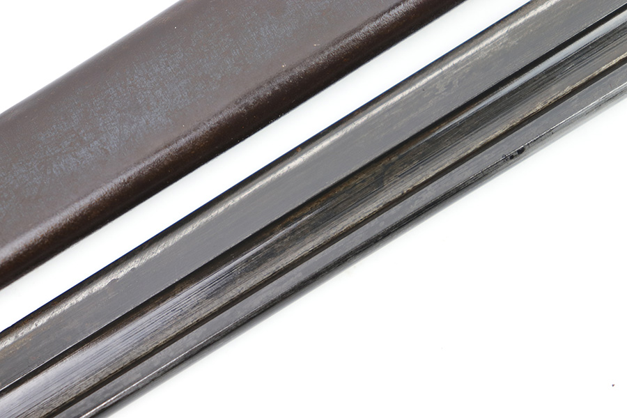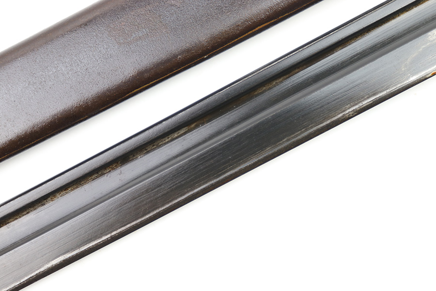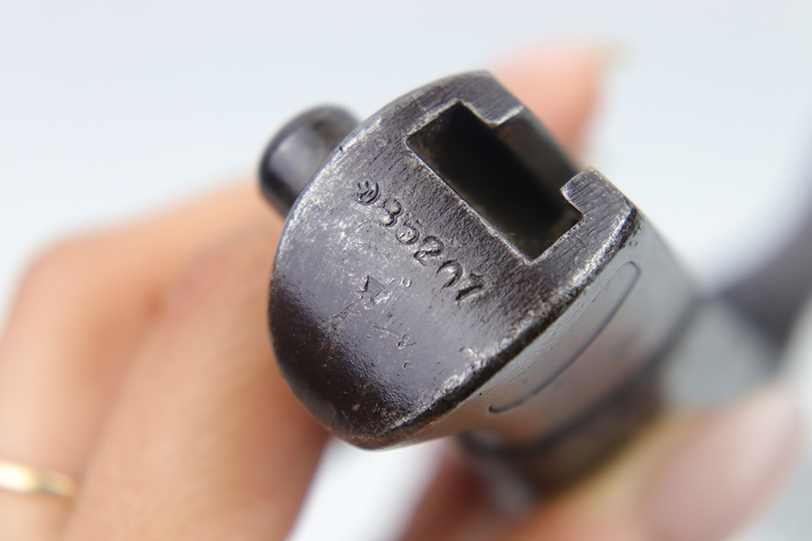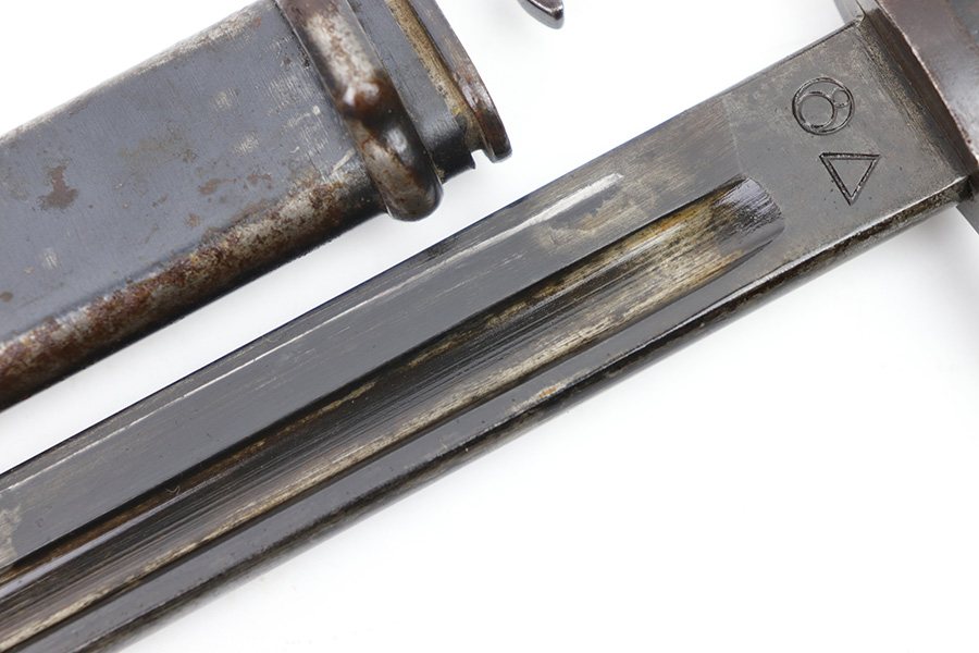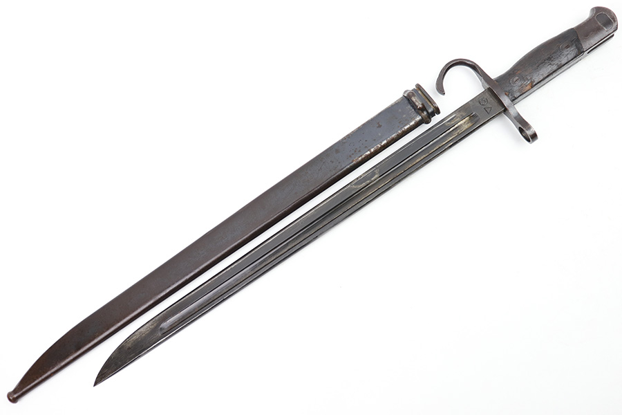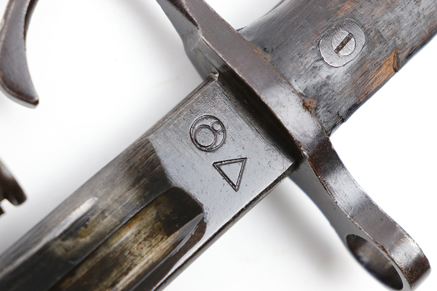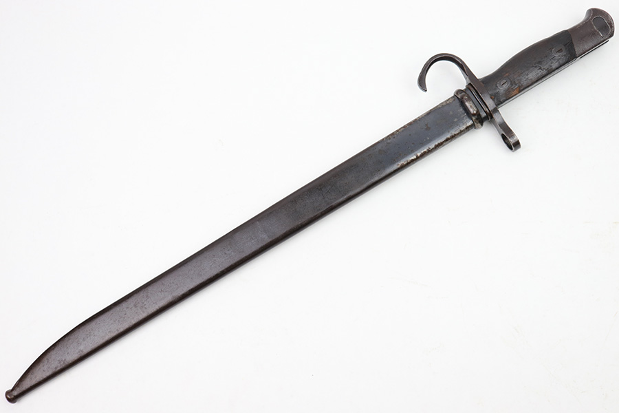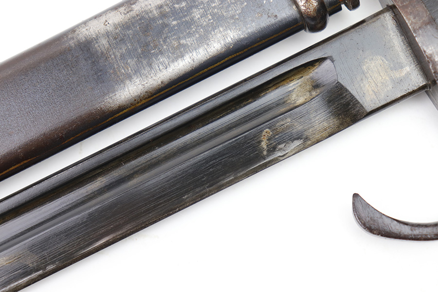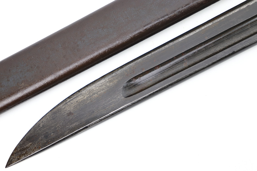 1/26/23 – This is an original Type 30 Arisaka rifle bayonet by Aisan Arsenal. The bayonet has earlier wartime features, such as a contoured wood grip with screws and washers, bird’s head pommel, hooked crossguard, and a blued, fullered blade. The blade has dark surface patina and light finish loss. The edge is in great shape with no signs of misuse. The crossguard and pommel have dark patina and edge wear, but no rust or pitting. The wood grips have a few dents and imperfections but are still in very good condition. Serial numbered and inspection stamped on the pommel. Comes with a metal ball-tipped scabbard that has dark patina throughout, as shown. Variation B, LB-137 in Labar’s book.