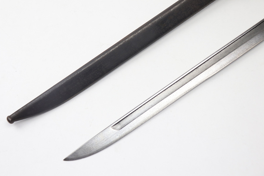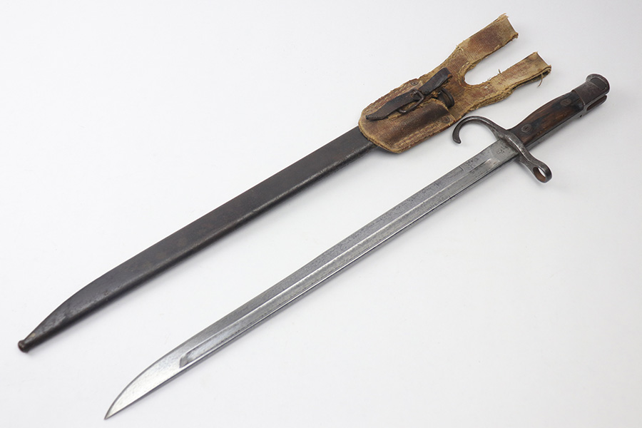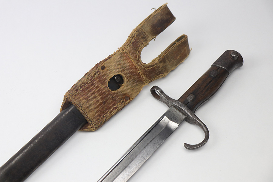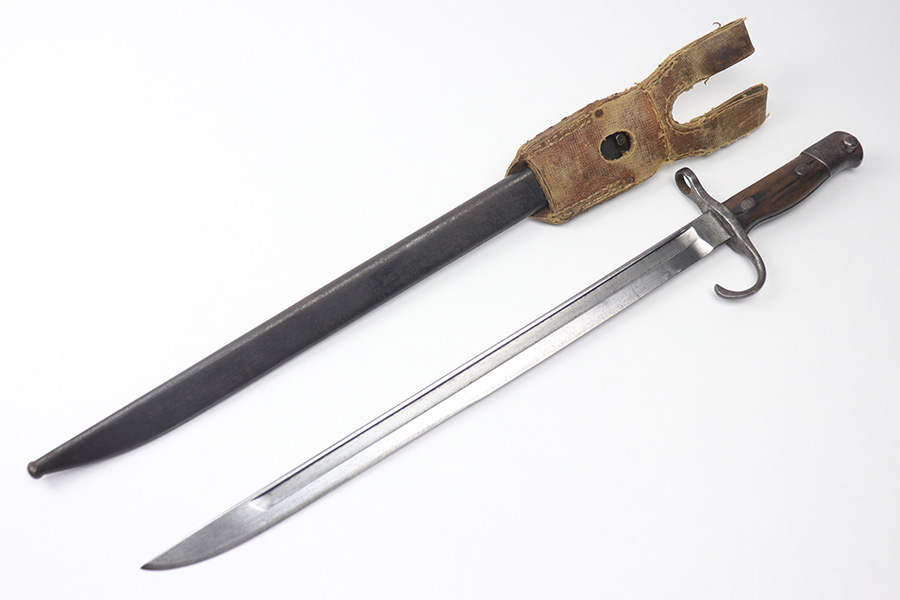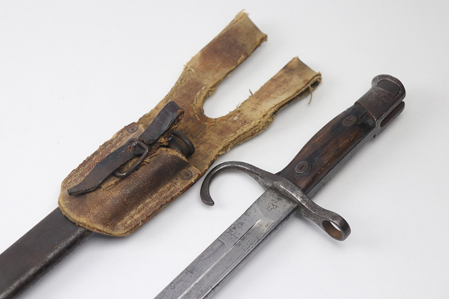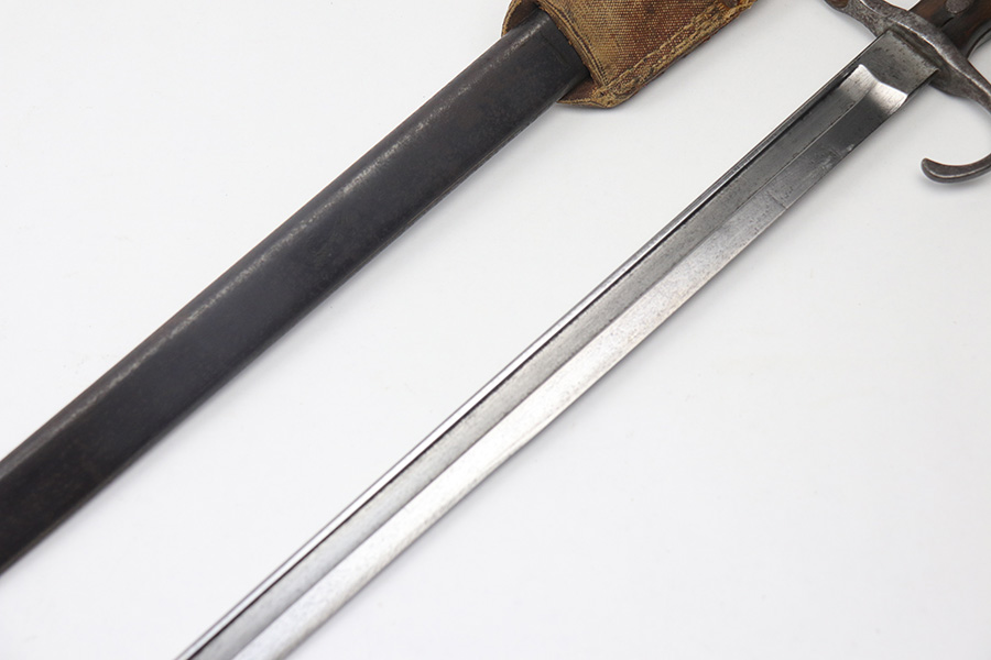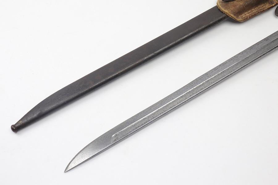11/17/21 – This is a Type 30 Japanese rifle bayonet with scabbard and a hardened canvas frog. The bayonet blade is unsharpened with surface oxidation and mild discoloration throughout. Arsenal / maker stamped on one side. The wood handle has a few minor flaws and small chips, but is in good overall condition. The scabbard has patina and light surface rust throughout. No major dents. The scabbard has signs of aging and wear but no major issues.
