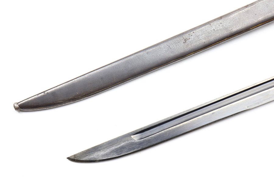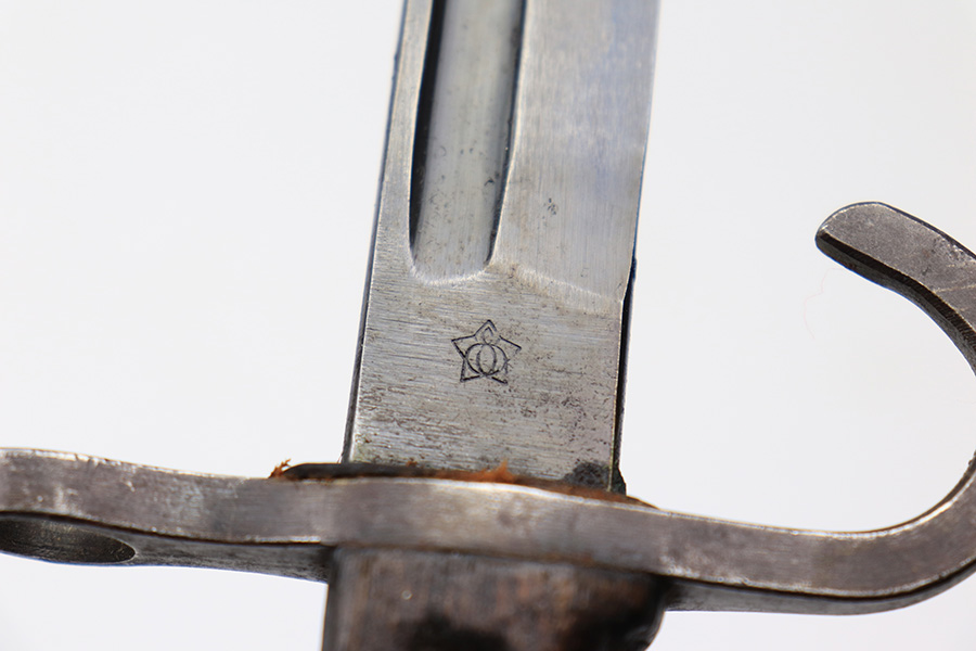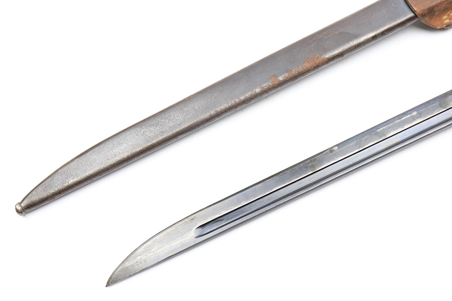 4/11/22 – This is an original WW2 production Type 30 bayonet for a T38 or T99 Arisaka rifle. The bayonet blade has great bluing throughout with some mild surface wear in a few spots, but no signs or sharpening, nor any rust or pitting. There’s a maker stamp on one side of the ricasso, and there’s some of the original leather stopper still intact. The wood handle has a few mild surface dings and typical signs of aging. The metal portion of the hilt has patina throughout, mixed with the original finish. The metal scabbard has no dents, but there is mild surface patina throughout, as well as some rust along one side and somewhat on the front of the scabbard. Comes with a nice canvas/leather frog.