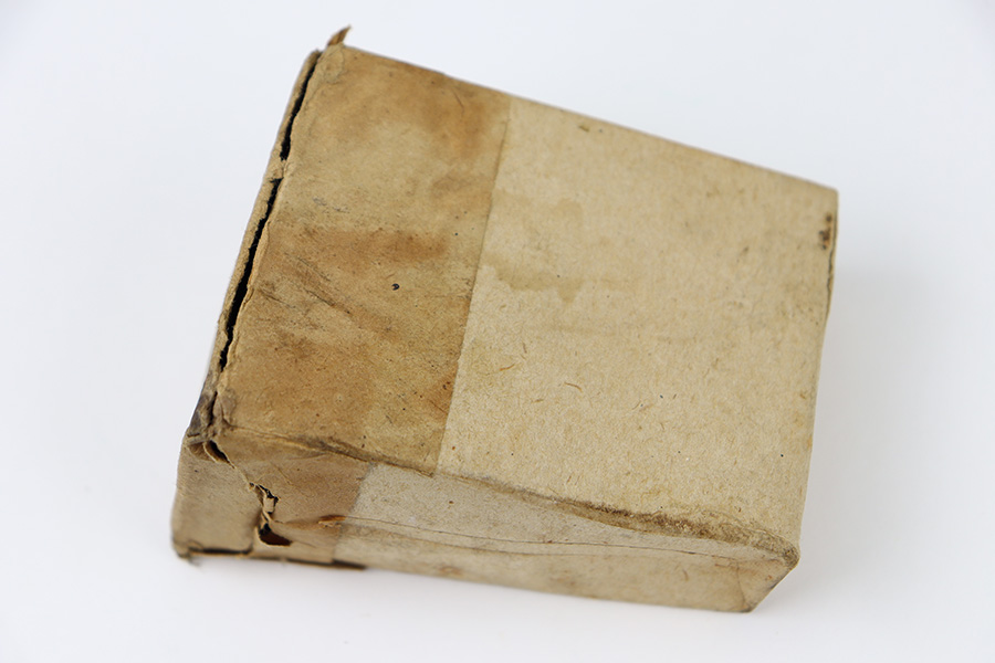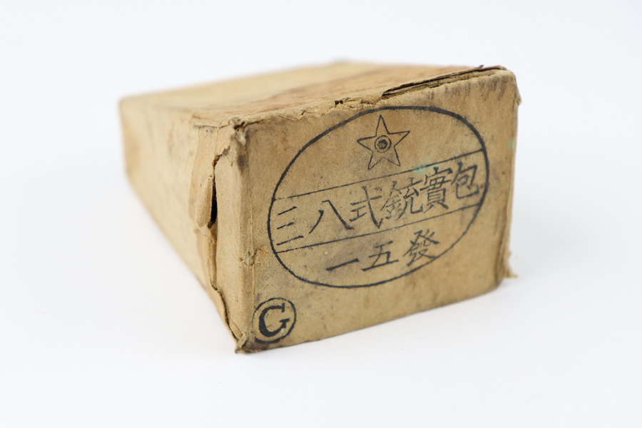 9/29/23 – This is WW2 original 6.5mm Arisaka rifle ammo. 15 rounds on stripper clips, as shown in the original box. Note the lid of the original box is detached from the rest of the box, but the original label is still clearly visible. Some light surface wear and aging on the rounds, but very good overall condition.