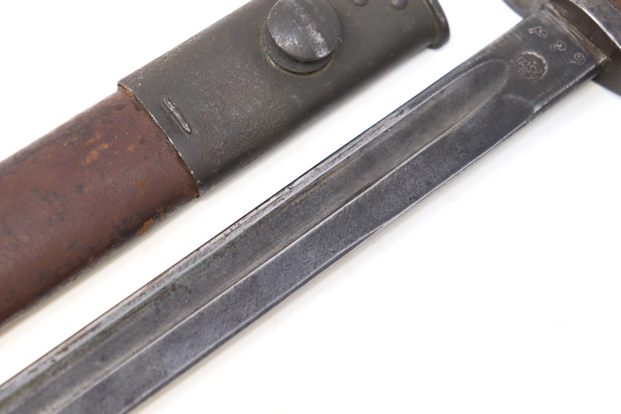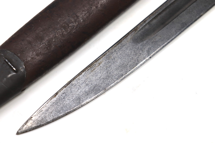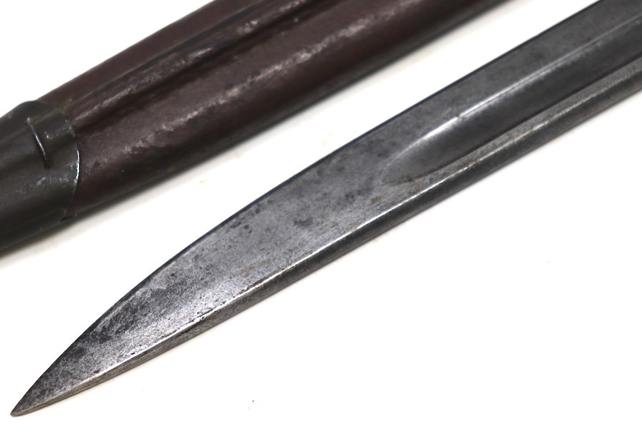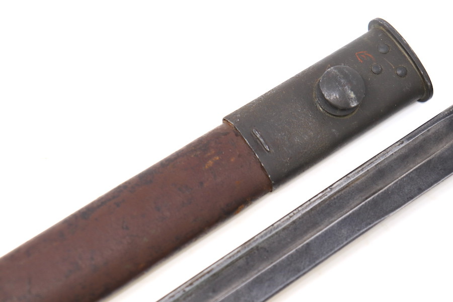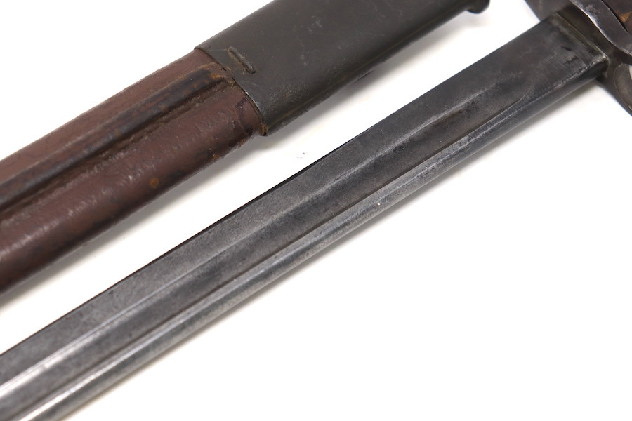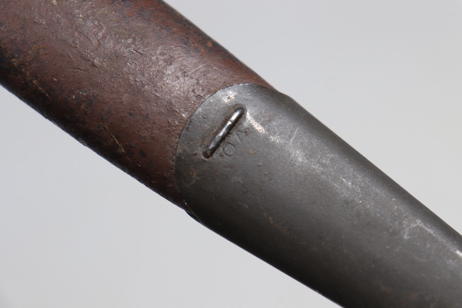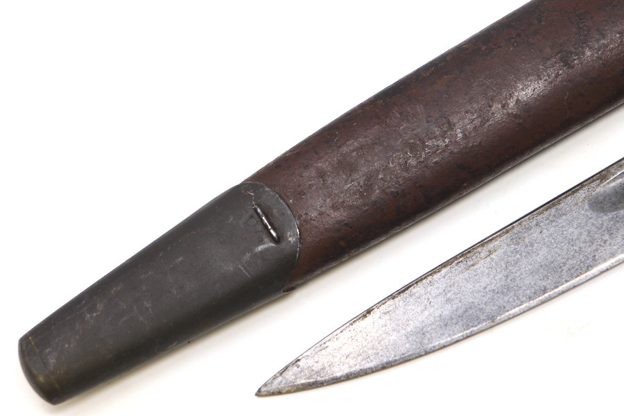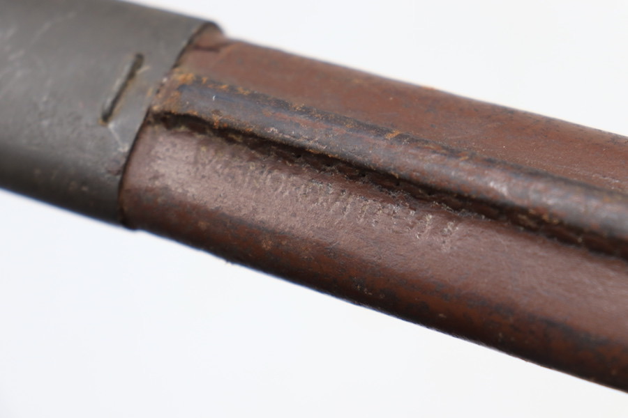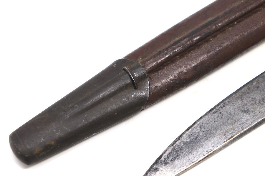 9/1/23 – This is a good condition Type 62 Wild Tiger Corp bayonet with leather scabbard. This bayonet retains 40% of its original blued finish and has no rust or pitting. The blade edge has been sharpened. The ricasso shows the symbol of the Wild Tiger Corps and some writing in Siamese. The cross guard and pommel show minor finish loss but have no significant issues. Wood grips are without cracks or splits and show minor handling wear. The leather body of the scabbard has tight and complete stitching, with the metal mounts on the ends showing minor pitting without surface rust.
