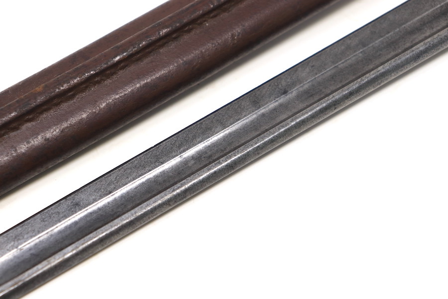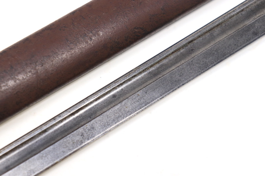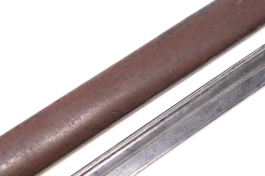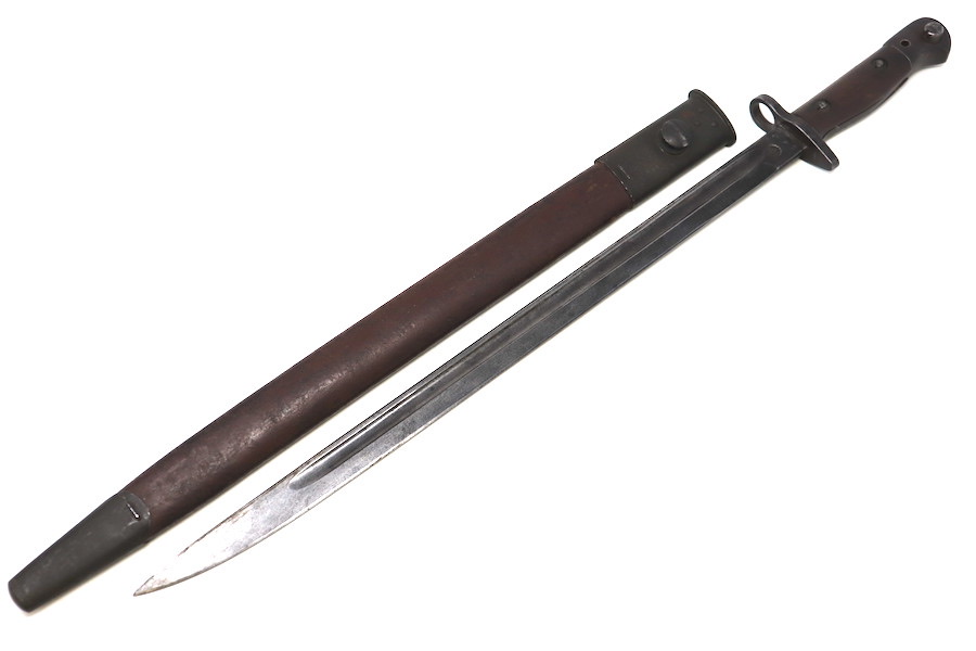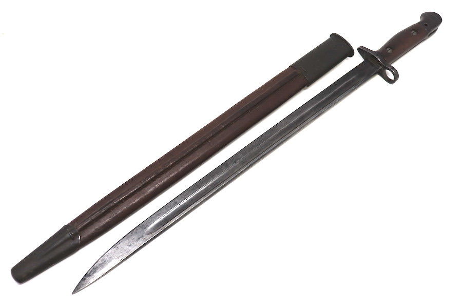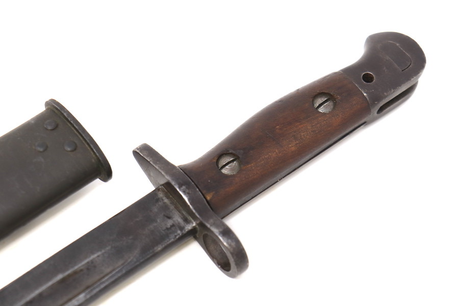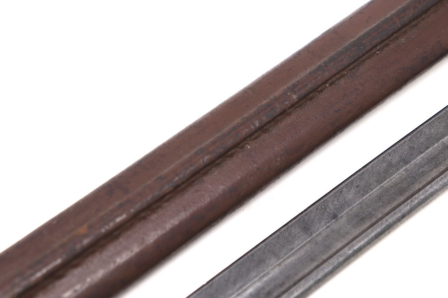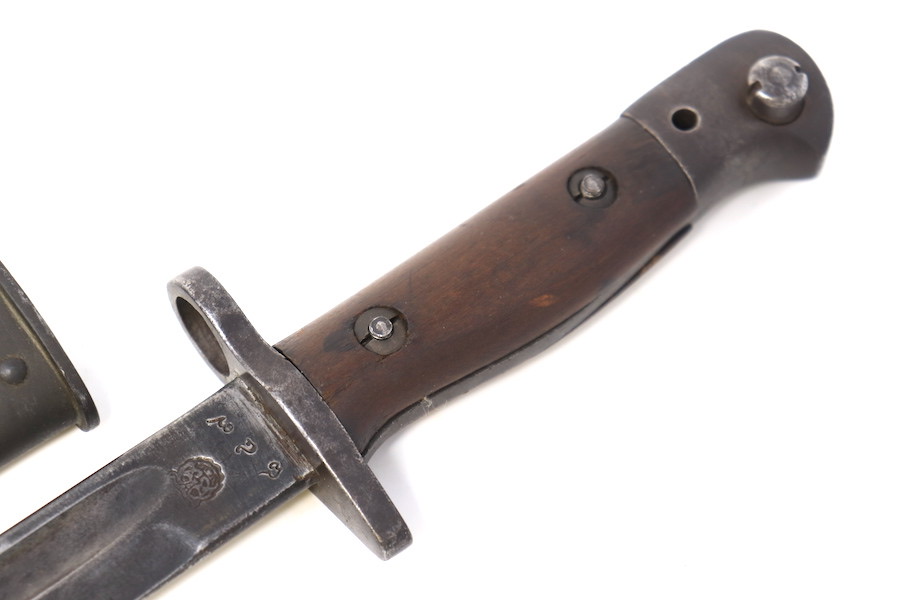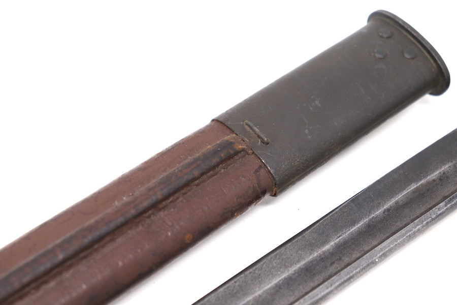 9/1/23 – This is a good condition Type 62 Wild Tiger Corp bayonet with leather scabbard. This bayonet retains 40% of its original blued finish and has no rust or pitting. The blade edge has been sharpened. The ricasso shows the symbol of the Wild Tiger Corps and some writing in Siamese. The cross guard and pommel show minor finish loss but have no significant issues. Wood grips are without cracks or splits and show minor handling wear. The leather body of the scabbard has tight and complete stitching, with the metal mounts on the ends showing minor pitting without surface rust.