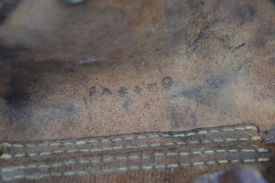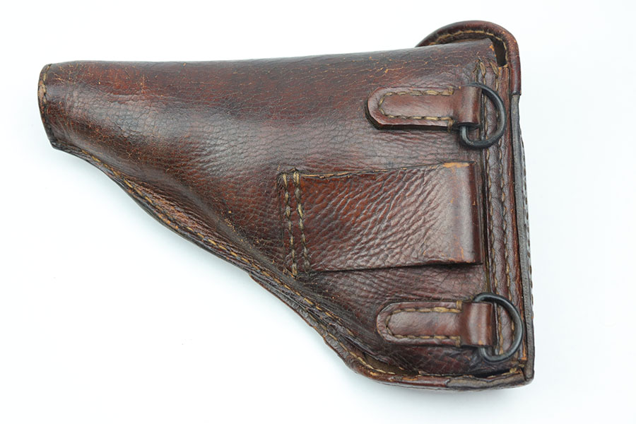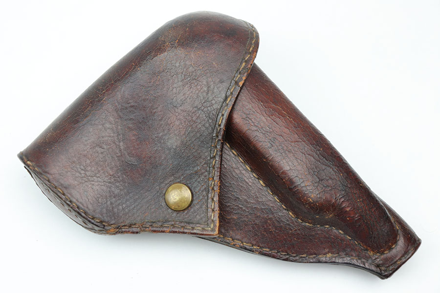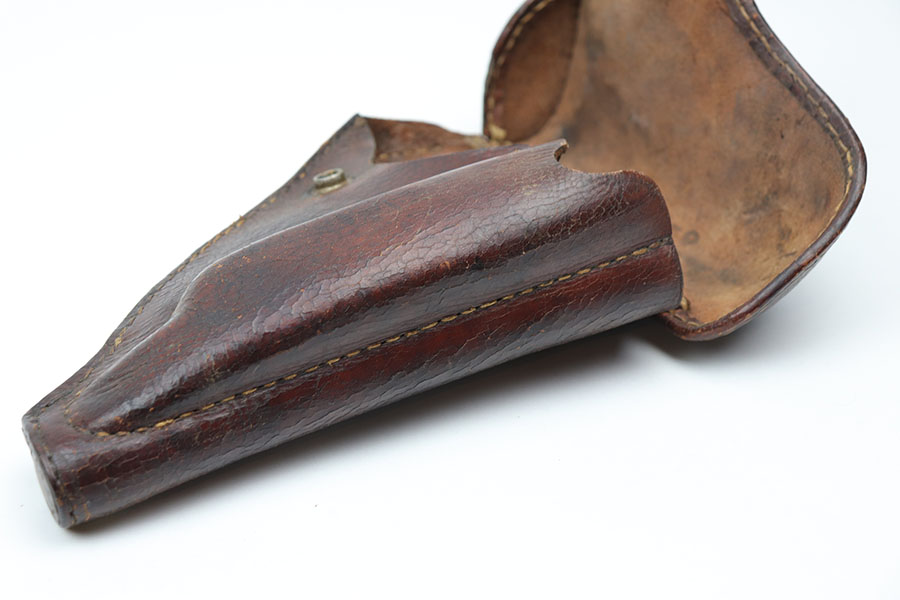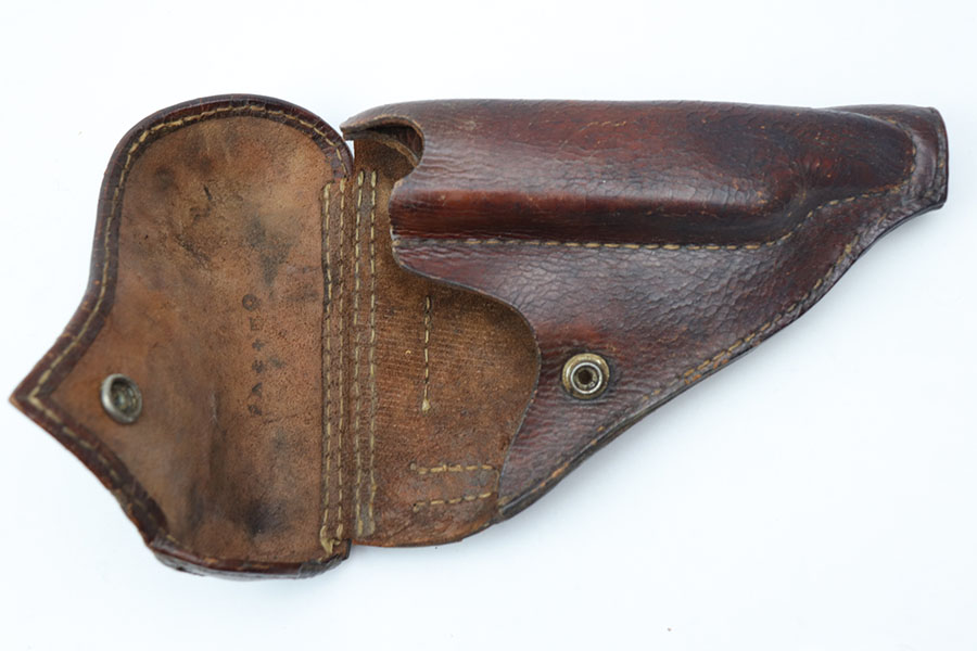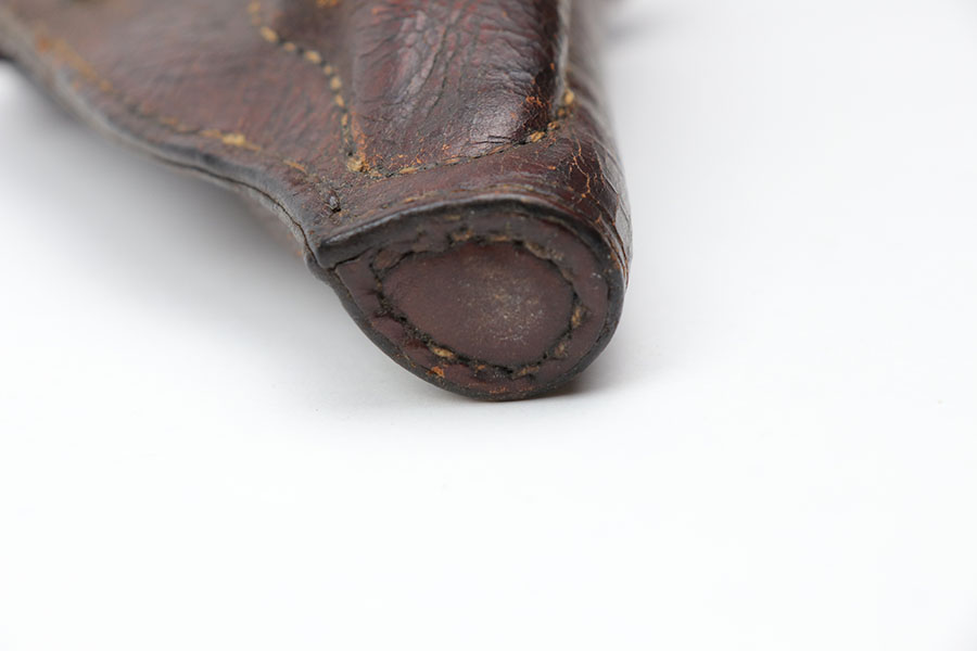 11/10/20 – This is an original Type 94 Nambu holster. The holster has nice reddish brown leather with some surface wrinkling and minor cracking, as shown. The leather is completely in tact however, with normal pliability. Stitching is tight and all original. Stamped on the interior of the lid, as shown. All original and authentic.