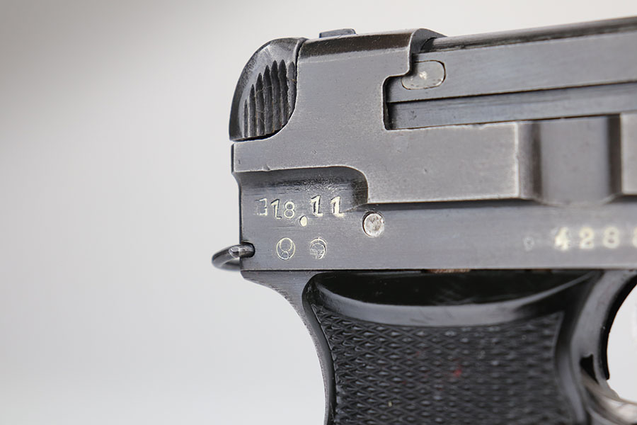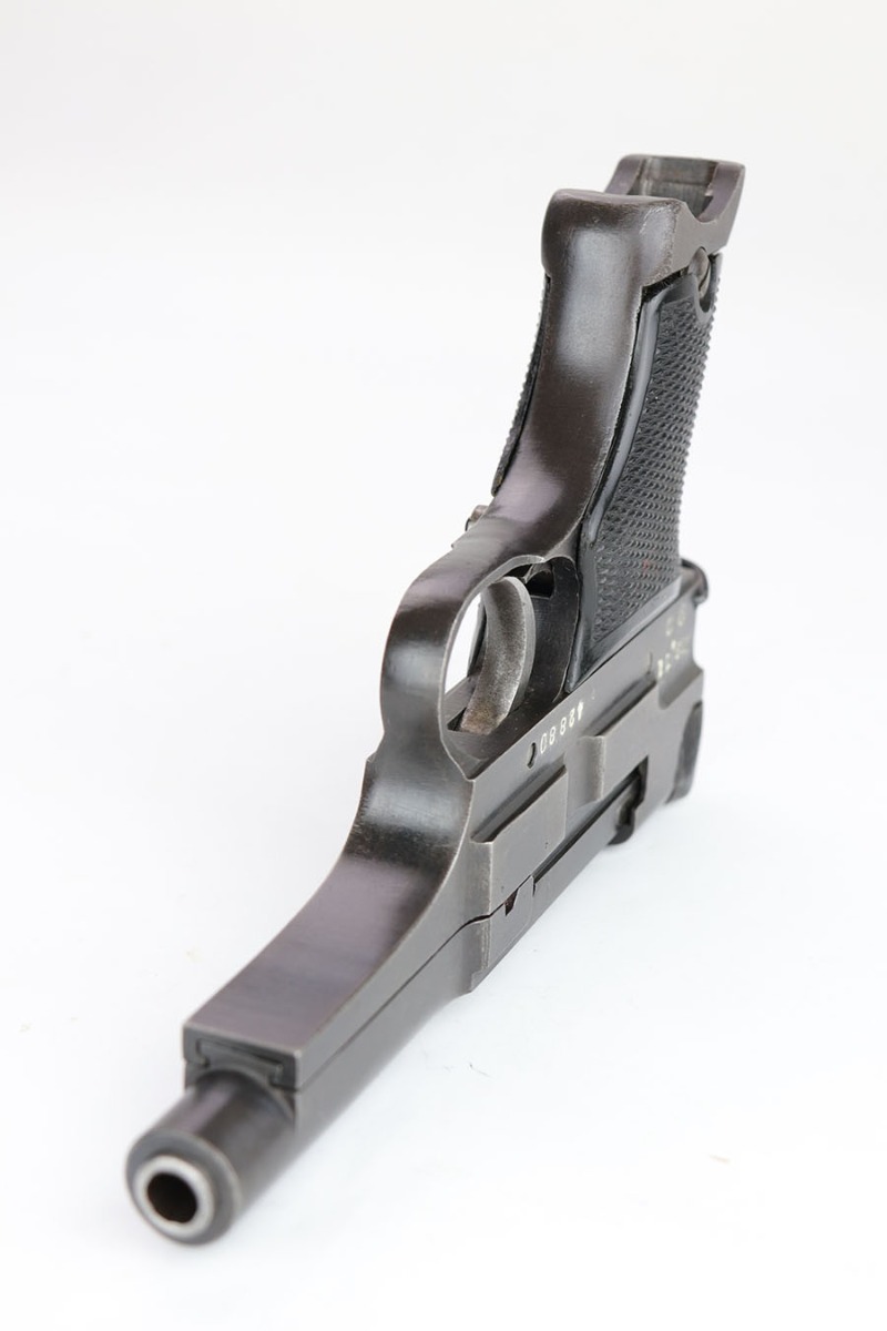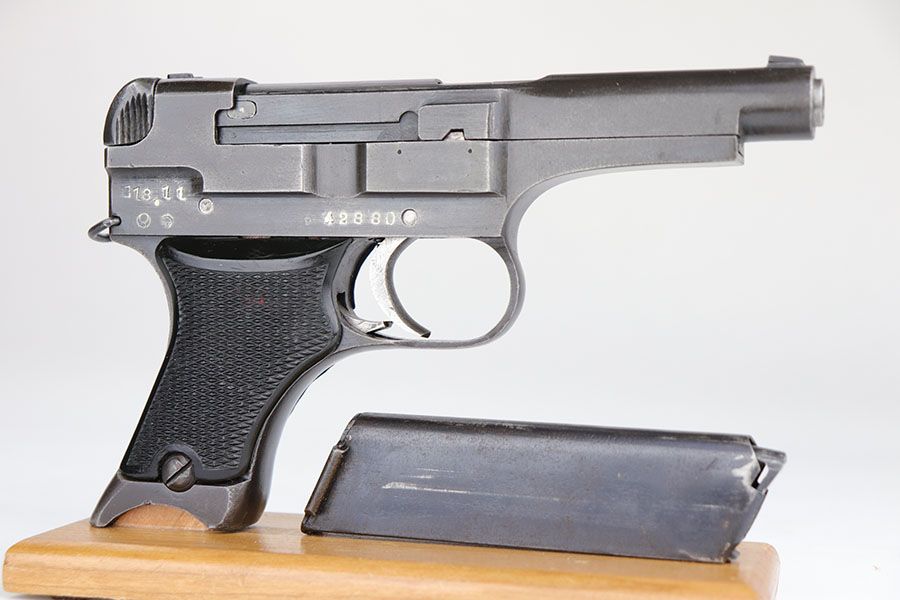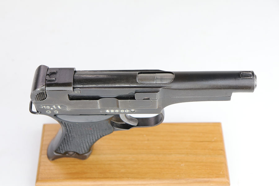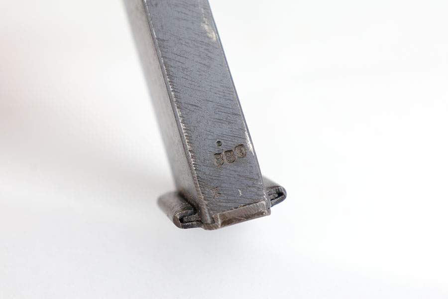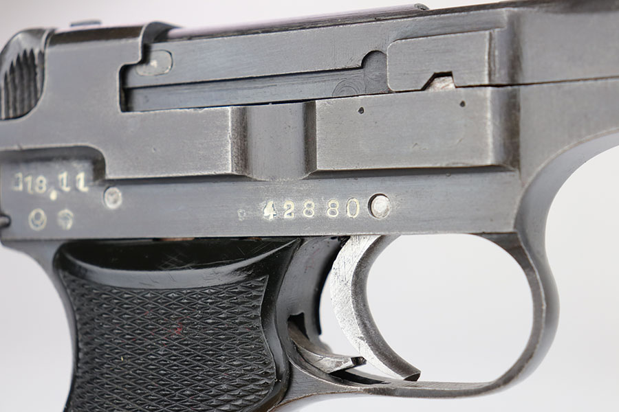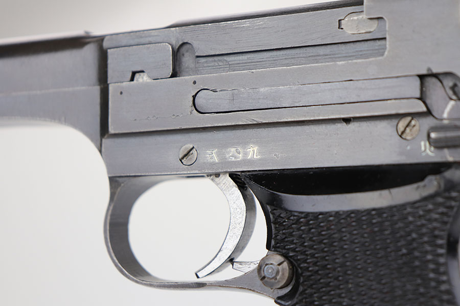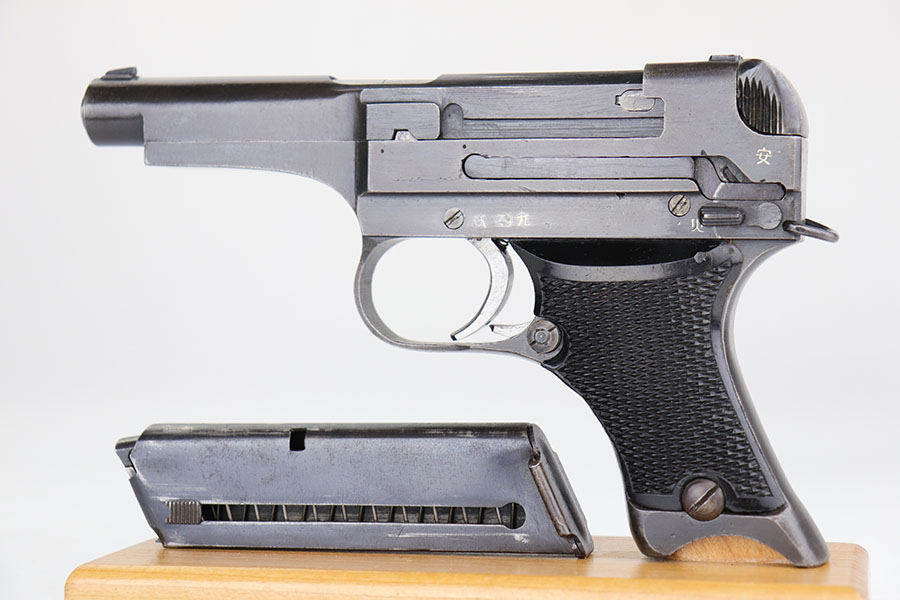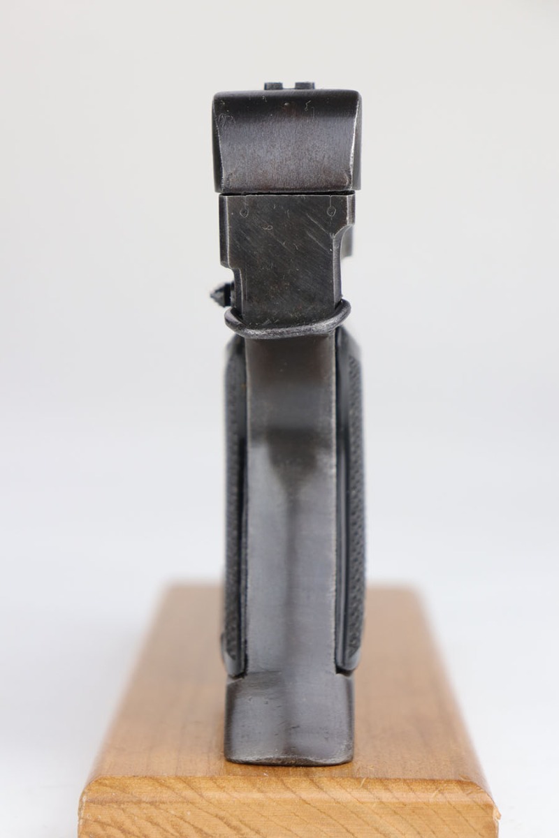 4/18/20 – This is an all matching and original Type 94 Nambu as produced at the Nagoya Arsenal in November of 1943. The pistol has a nice profile with only minor high edge wear, but most finish loss is on the straps. Minty bore and excellent grips. Original matching magazine.
