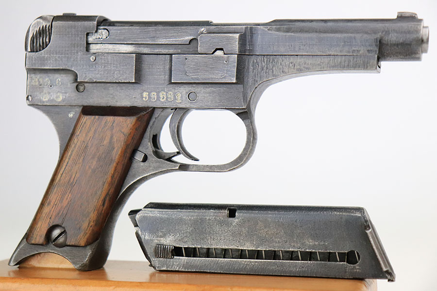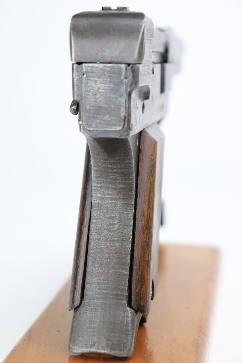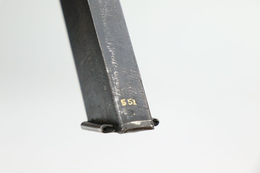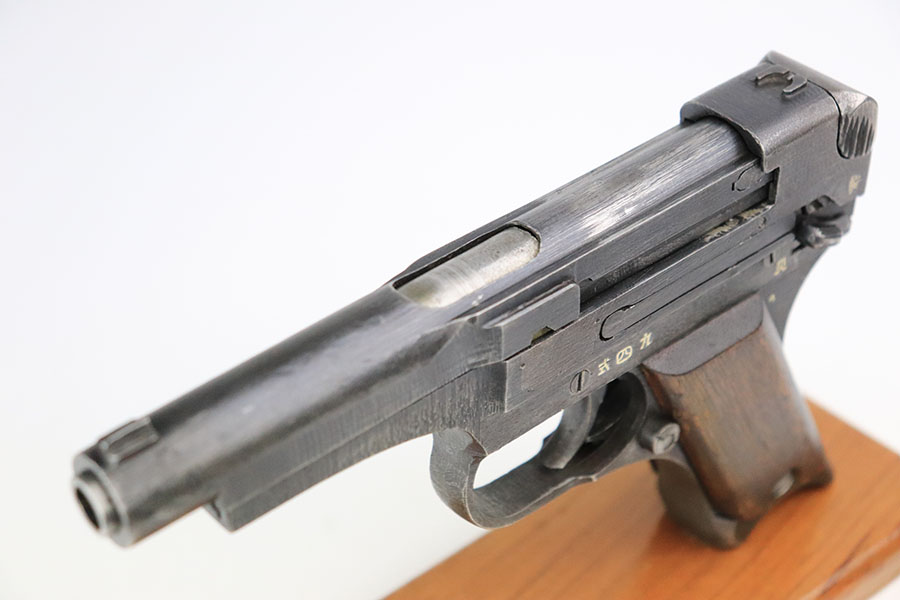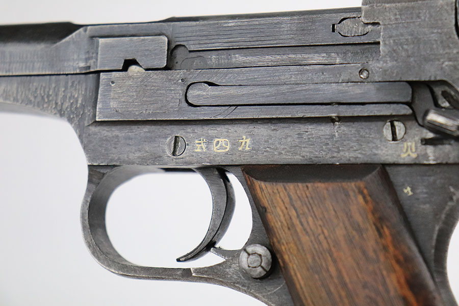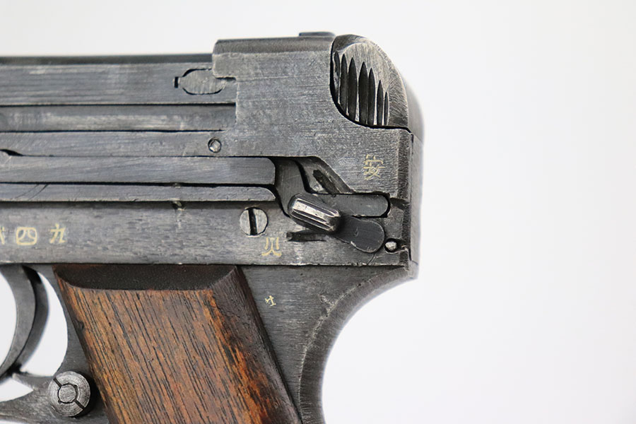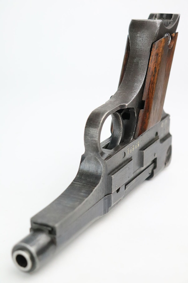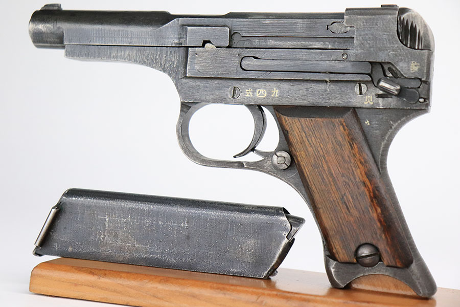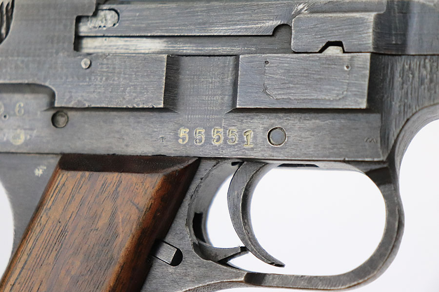1/19/22 – This is a matching and original Type 94 Nambu from June of 1944, including the magazine. Made at Kokubunji Arsenal, it has a rough late war finish that is somewhat tough to rate, as there is a general dullness and some thinning. Very nice late-war slab wood grips with no cracks or chips. Bore has pronounced rifling but some pitting in the grooves.