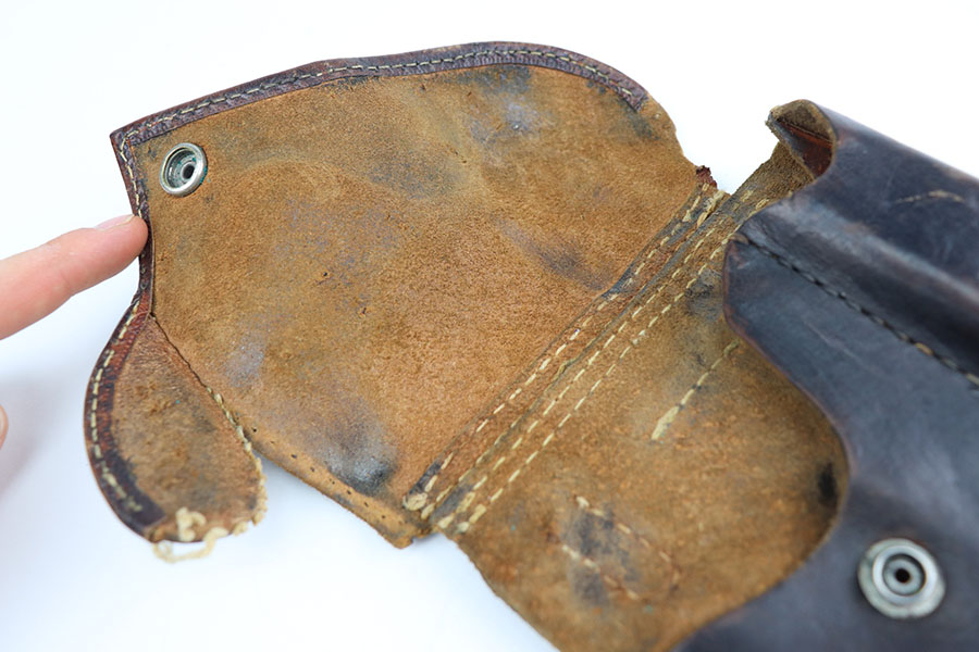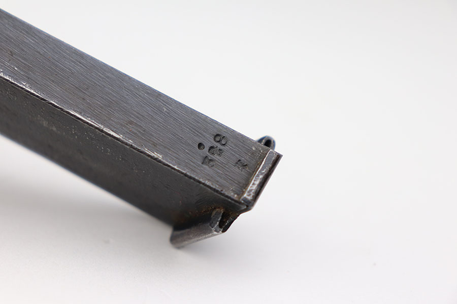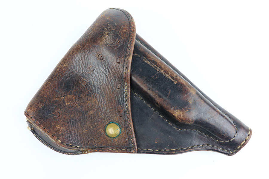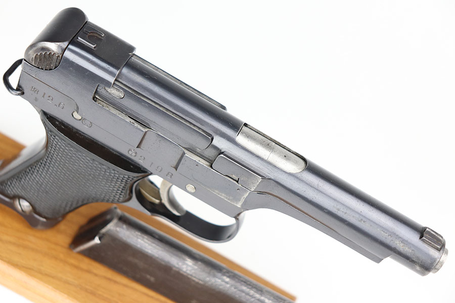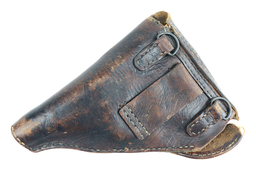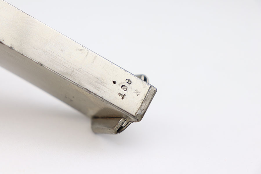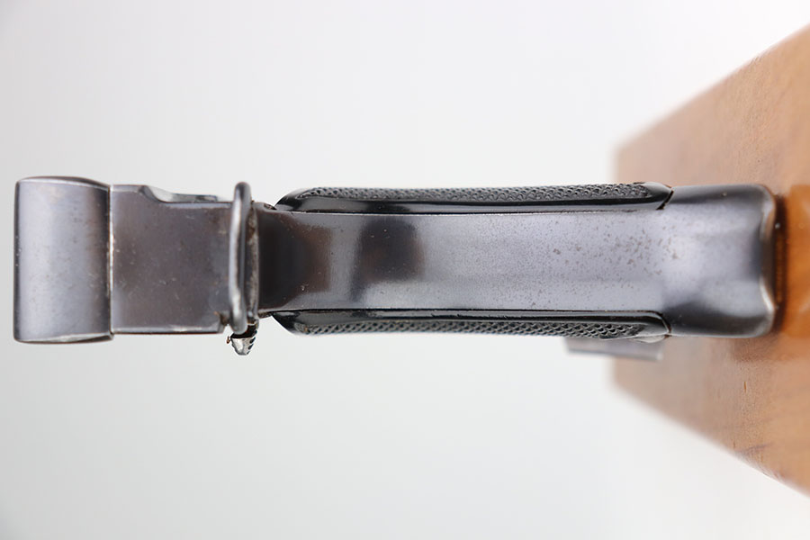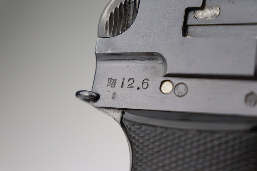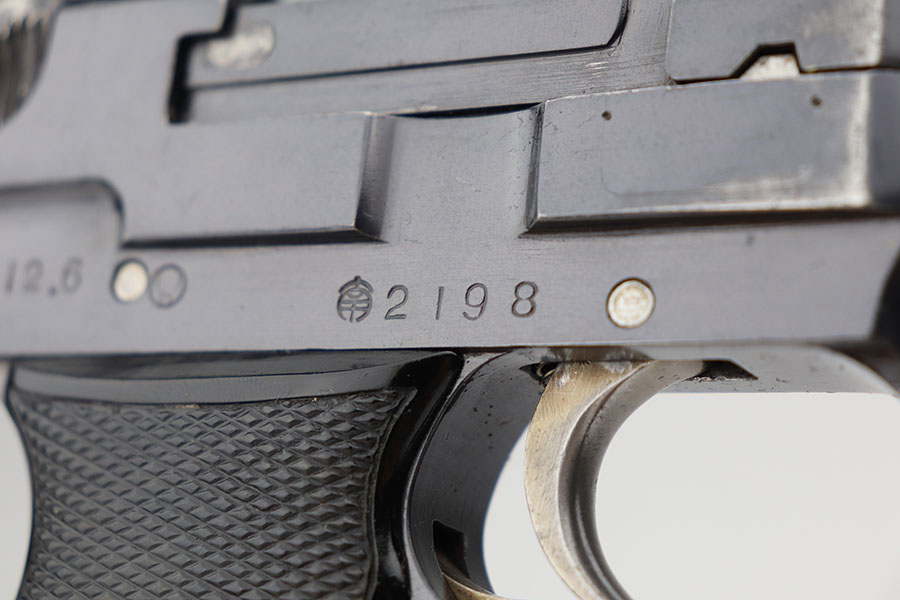 1/26/21 – This is a very nice example of an original Type 94 Nambu rig from June of 1937. All matching with original blue that rates at about 96%. Minor finish loss on muzzle and high edges, and a little more on bottom of front strap. Terrific bore. Both magazines are period original but mismatched. Excellent grips with no major defects. Holster is in fair condition, a couple of stitches are missing and the outer flap as a series of circles imprinted into it, unsure why.