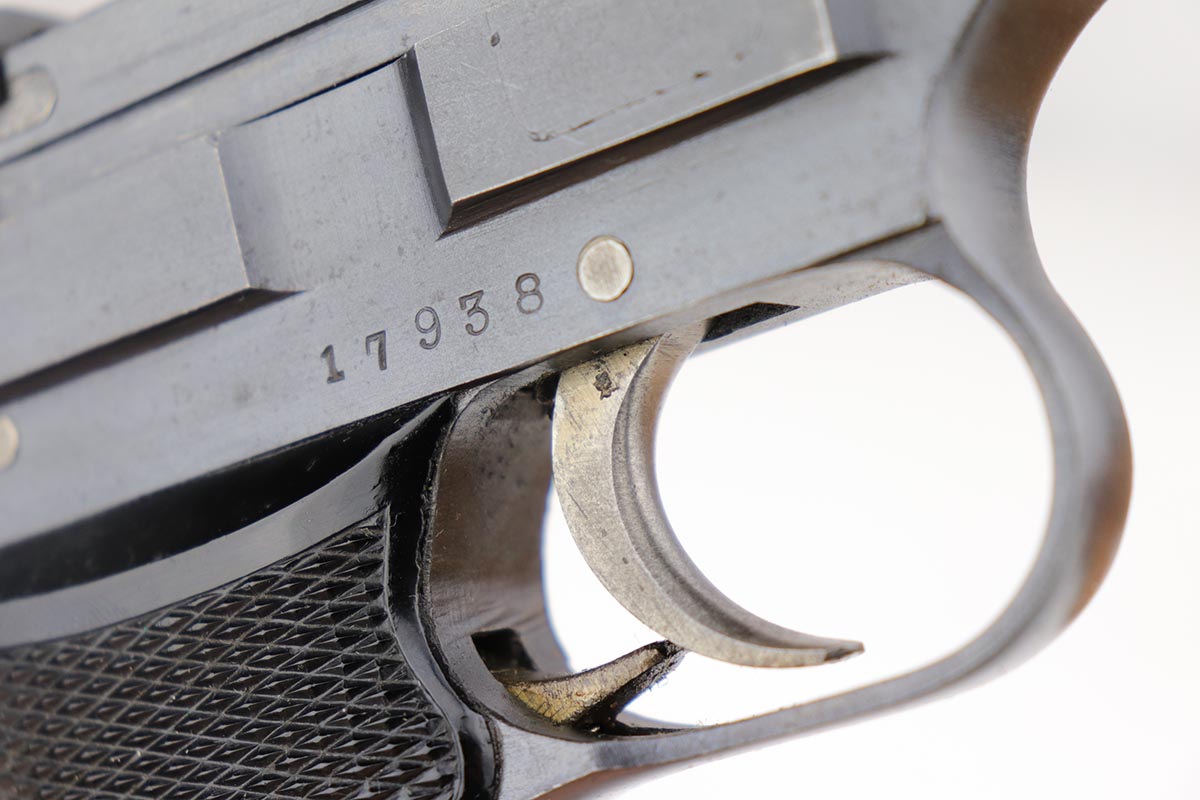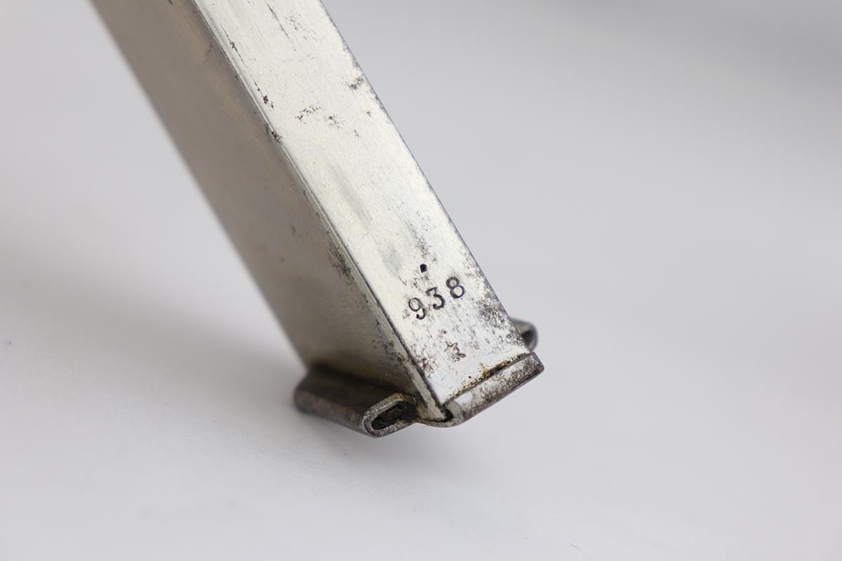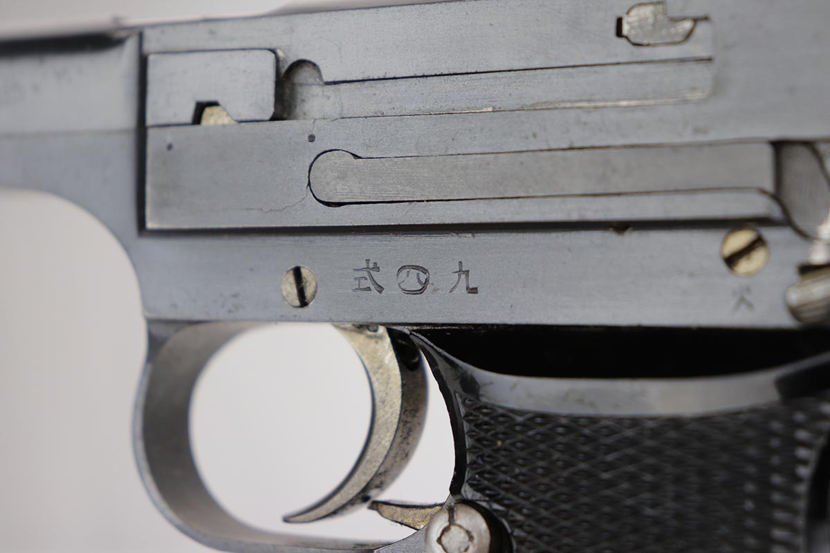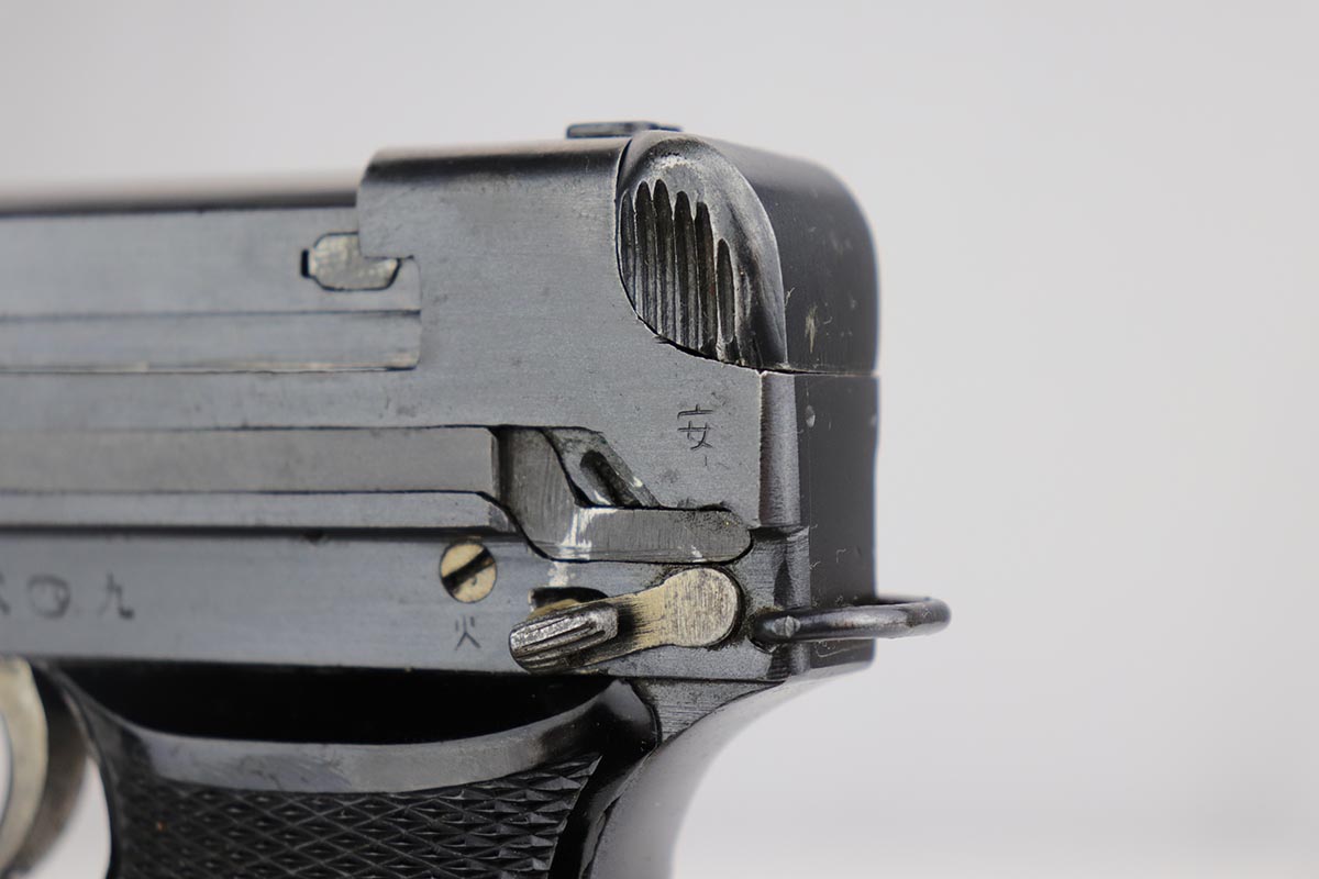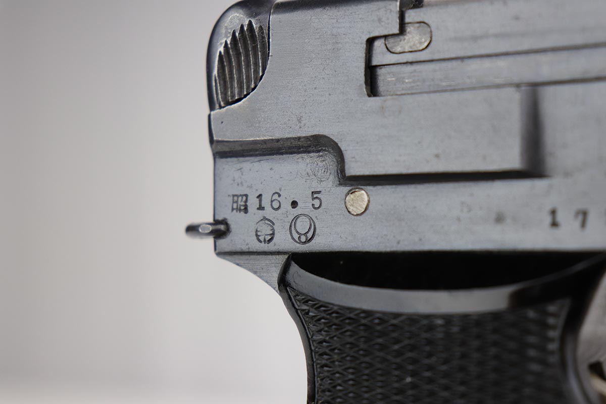 12/19/19 – This is a terrific Japanese Type 94 Nambu rig with one matching magazine, spare magazine and original holster. The pistol was made in May of 1941 at the Kokubunji factory under Nagoya Arsenal Supervision. It has 98+% of the original blue, as there are only minor hints of high edge wear from the holster, but very little bluing loss overall. The pistol does have minor oxidation in a few areas, mainly the straps. Mint bore. Nice grips with a few minor dings or nicks. Spare magazine is a blued variant and mismatched. Holster is in great condition with no major defects, just minor discoloration.
