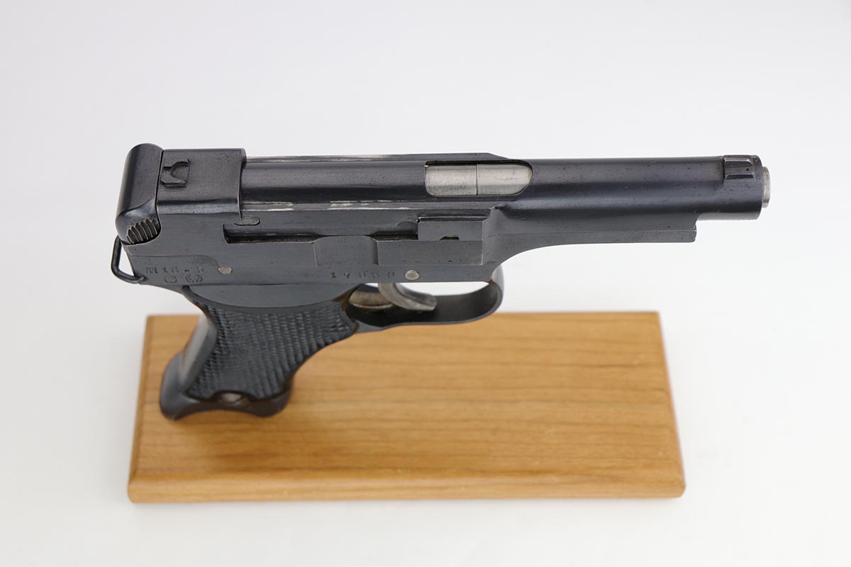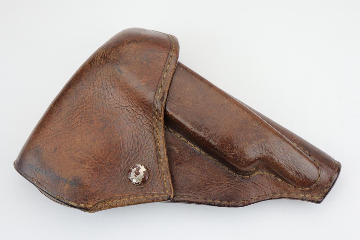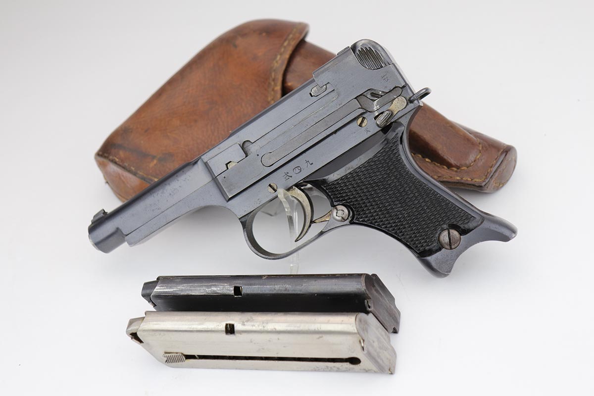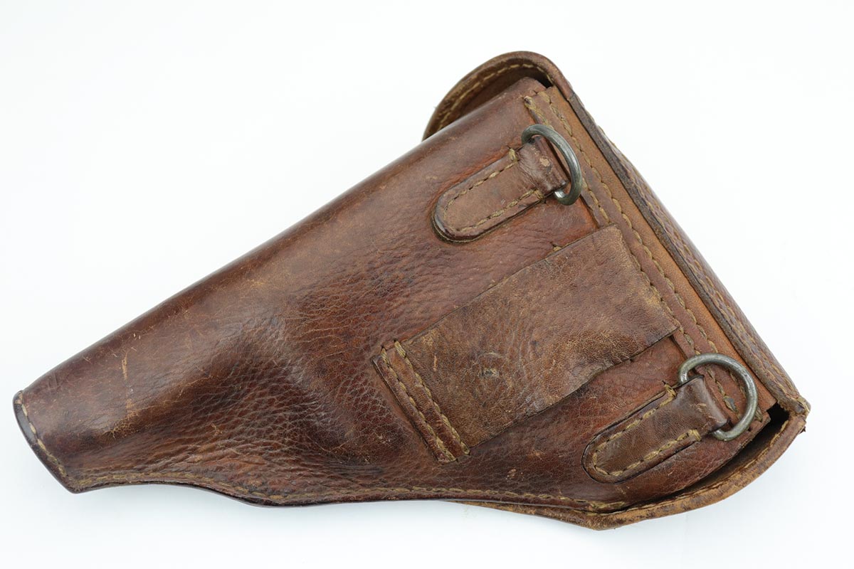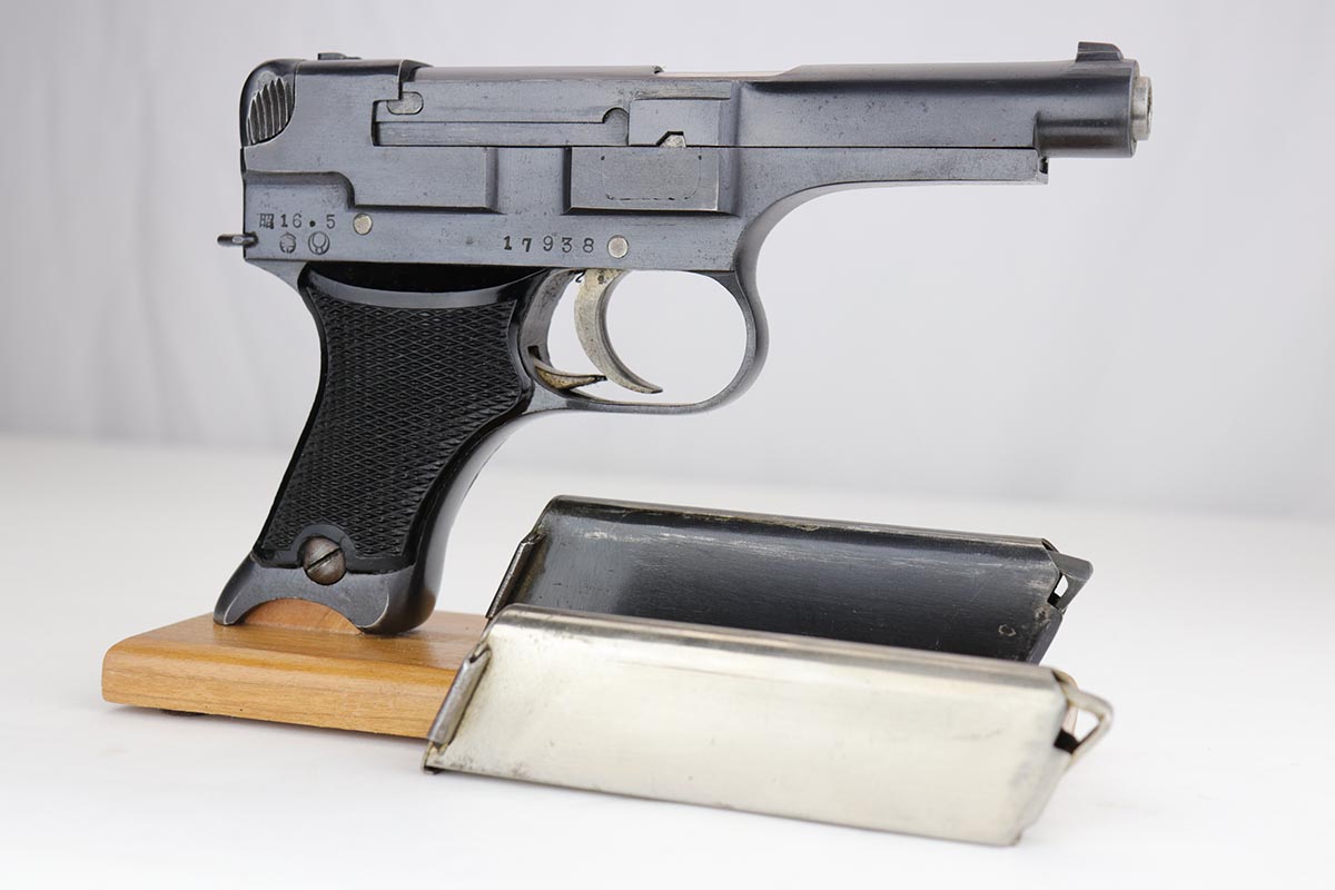 12/19/19 – This is a terrific Japanese Type 94 Nambu rig with one matching magazine, spare magazine and original holster. The pistol was made in May of 1941 at the Kokubunji factory under Nagoya Arsenal Supervision. It has 98+% of the original blue, as there are only minor hints of high edge wear from the holster, but very little bluing loss overall. The pistol does have minor oxidation in a few areas, mainly the straps. Mint bore. Nice grips with a few minor dings or nicks. Spare magazine is a blued variant and mismatched. Holster is in great condition with no major defects, just minor discoloration.