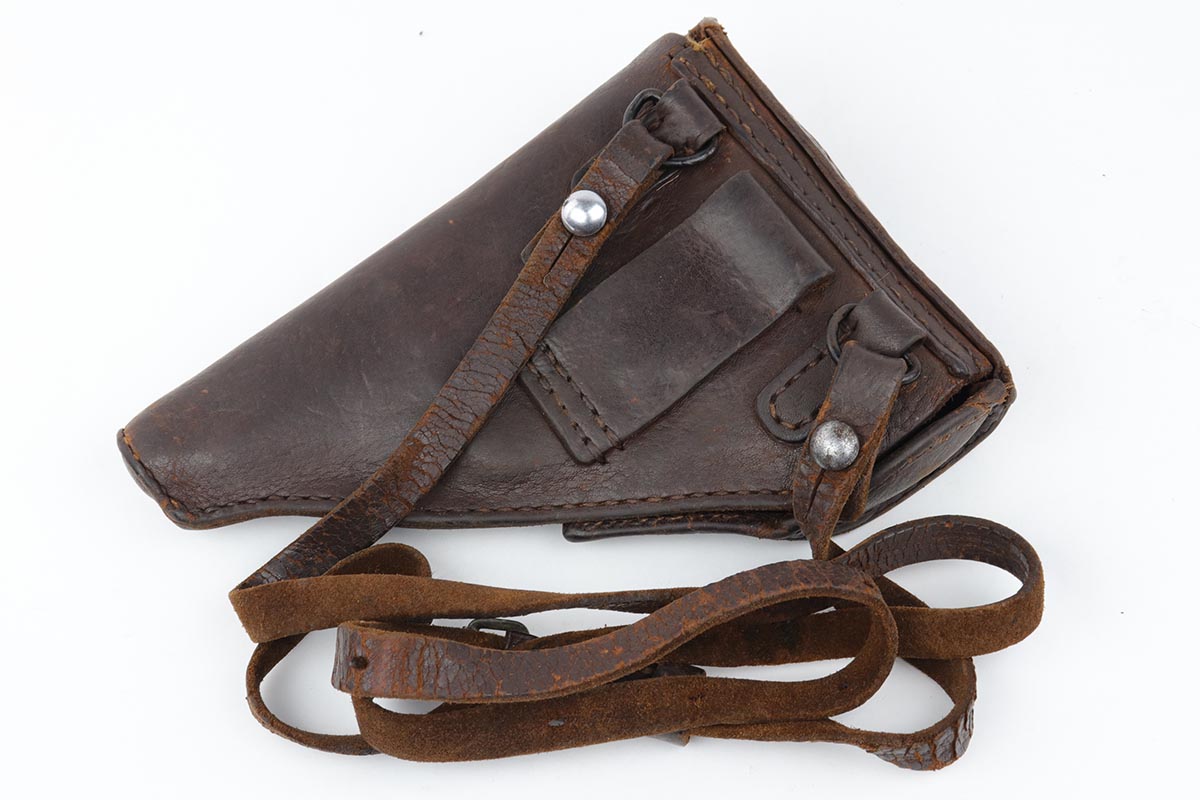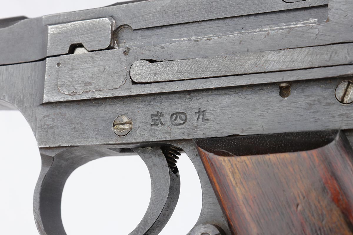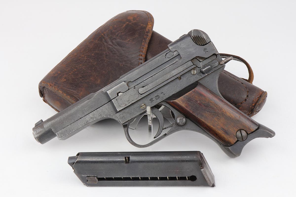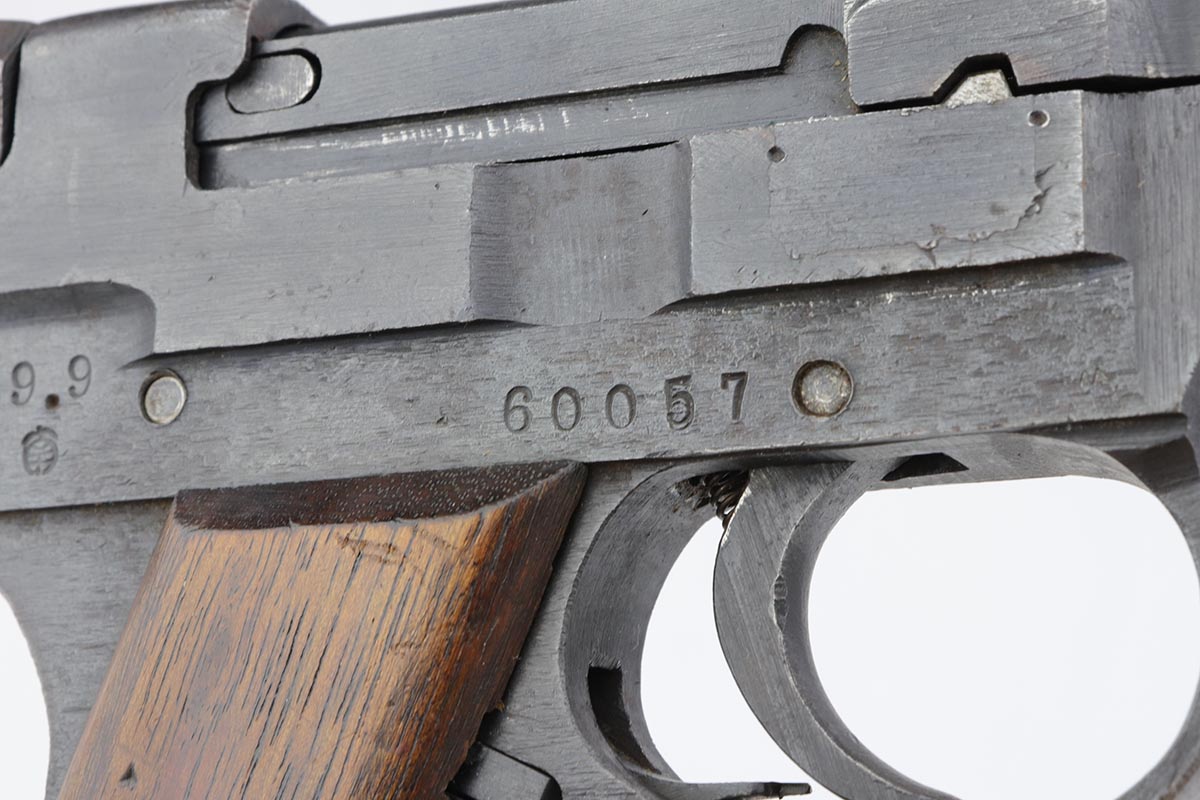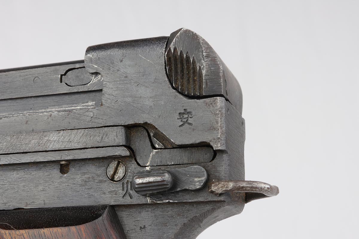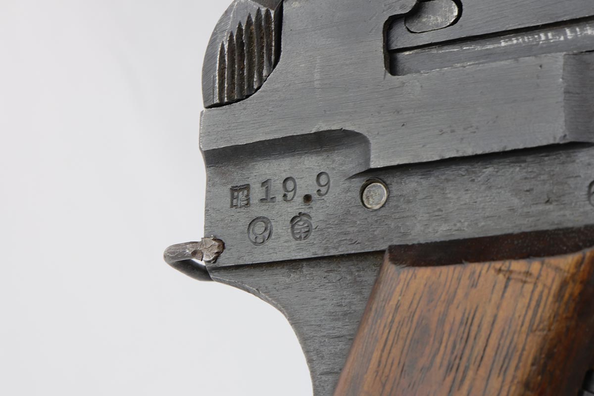 6/13/19 – This is a late-war example of a Type 94 Nambu with its original matching magazine and shoulder holster. The pistol is in near-mint condition, with 98-99% blue remaining. The finish is rough due to late-war practices but has only minor hints of finish loss at the edges. One grip panel is unmarked, the other has a serial written on it but it doesn’t match this pistol. Terrific bore. The pistol is accompanied by the original holster with scarce shoulder strap. The holster shows obvious age and some cracking but no tears or major flaws.