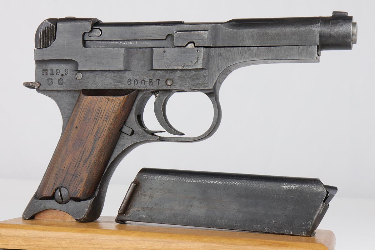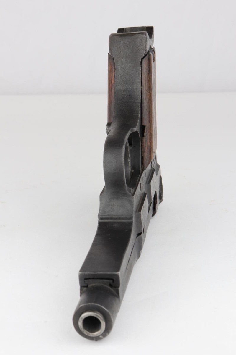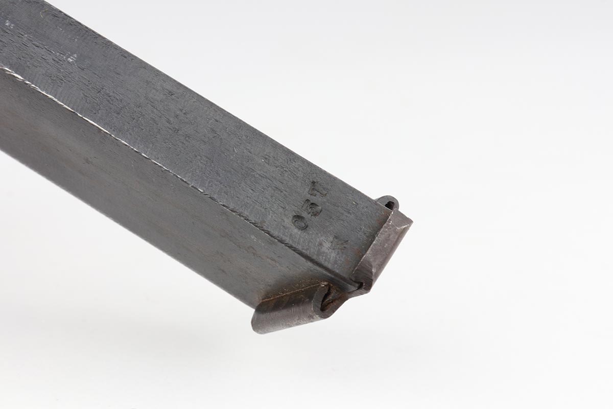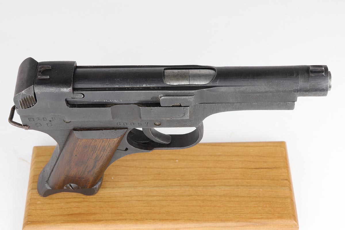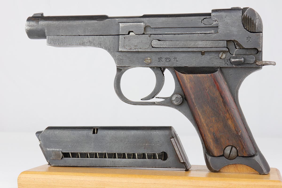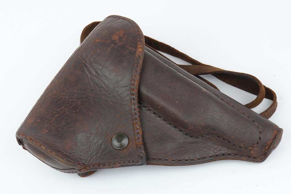 6/13/19 – This is a late-war example of a Type 94 Nambu with its original matching magazine and shoulder holster. The pistol is in near-mint condition, with 98-99% blue remaining. The finish is rough due to late-war practices but has only minor hints of finish loss at the edges. One grip panel is unmarked, the other has a serial written on it but it doesn’t match this pistol. Terrific bore. The pistol is accompanied by the original holster with scarce shoulder strap. The holster shows obvious age and some cracking but no tears or major flaws.