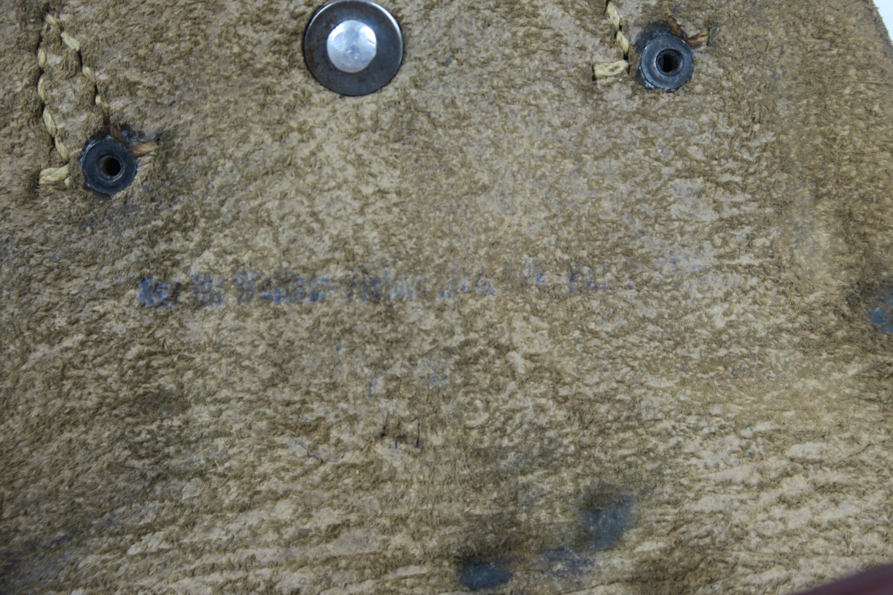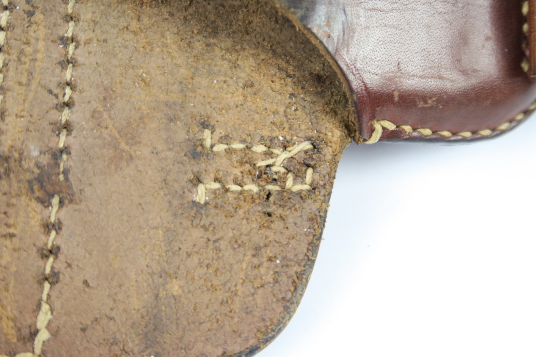 2/16/18 – This is an original WW2 Luftwaffe issued Walther PPK holster. The interior leather of this holster has a light blue ink stamp where you can decipher “Walther” and later the word “PPK” but this is semi-smudged and faint, making it very hard to see. The interior leather is also stamped “hck” with a “41” date stamp. This is considered a “Type 2” dropping holster because the straps are on the exterior. The leather is soft and pliable but overall great condition with no major cracking or flaws. The back of the holster has a few extra stitch holes – which look like someone tried to stitch the belt loop to the body of the holster. Then later someone removed this stitching. Otherwise there’s no notable flaws.