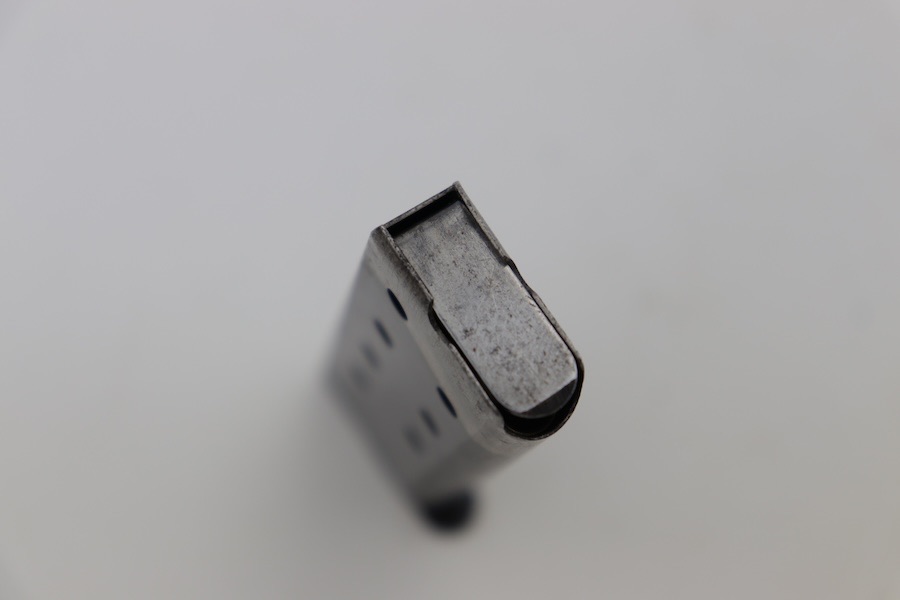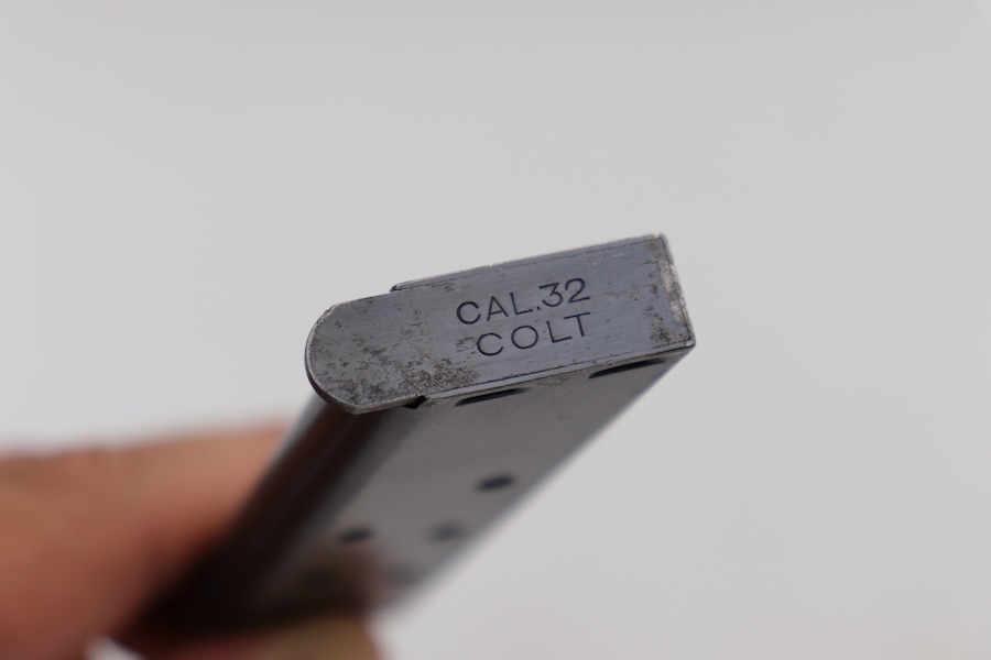 7/11/24 – This is an original and great condition Colt 1903 two-tone magazine that shows little to no actual finish loss other than on the follower. There is one small dent on the left side of the body and the belly. However, these dents do not affect the function. Foot plate is marked “CAL .32 COLT”.