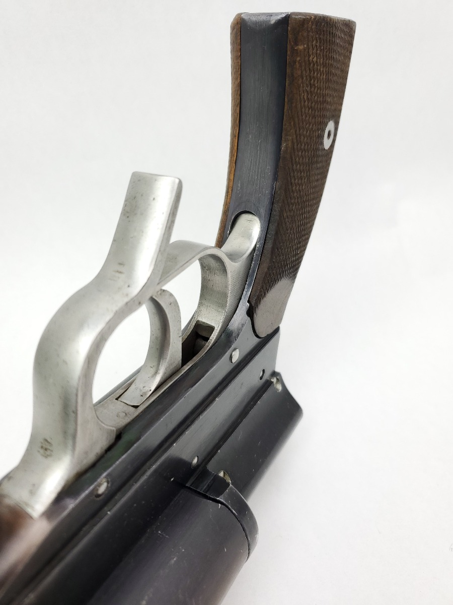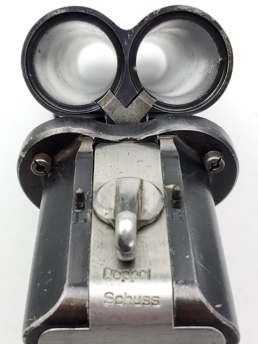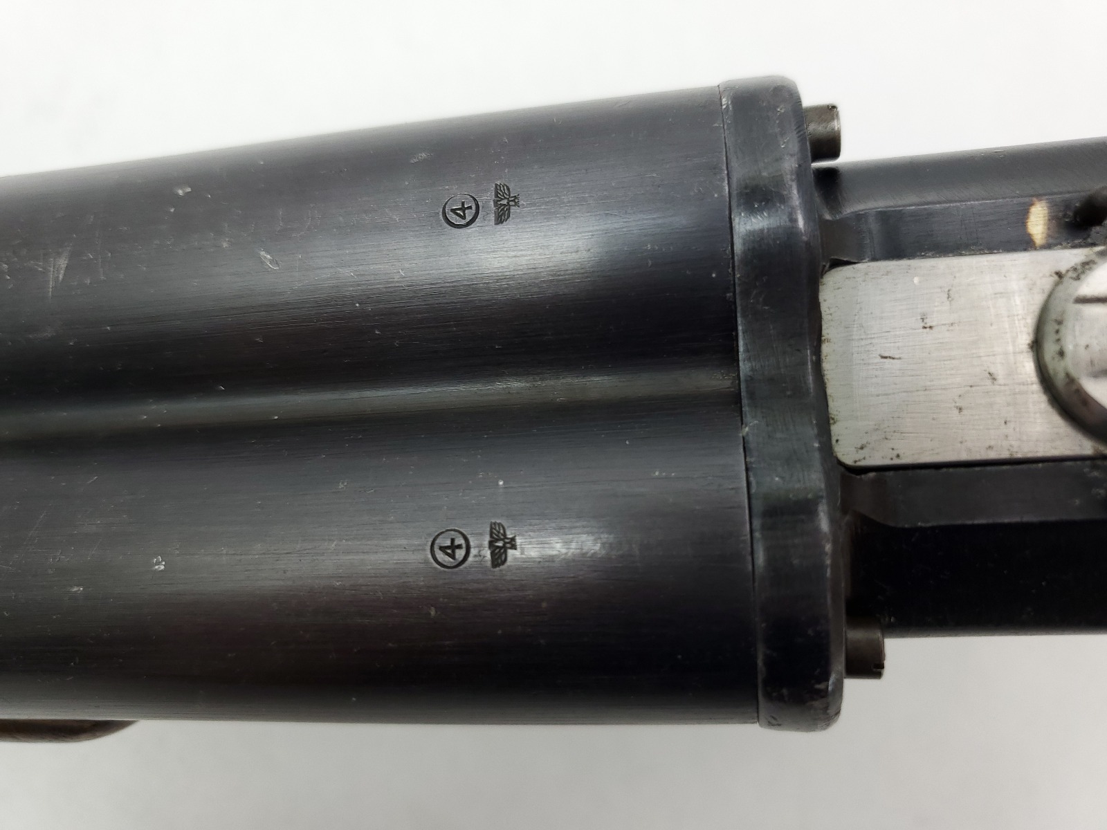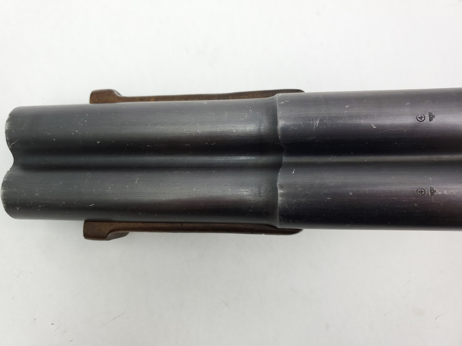 6/23/20 – This is an original WW2 U-Boat Kriegsmarine scarce model SLD – Signal und Leucht Doppelschussmodelce (literally ”signal & light double shot model). The pistol has a pair of 9 1/4” barrels and a 4 3/4” wooden fore-end to give the user a more secure grip when the pistol was fired. This double barrel flare pistol was manufactured in 4 bore and accepted 27mm flares with a variety of signaling and lighting purposes. The left side of frame is waffenamt and has the “eeu” makers mark. It also has a fairly faint “Eagle M” marking. Both barrels have a “4” within a circle and are waffentamt proof stamped. This particular example is in excellent condition and is fully functional. Most of the bluing is in tact, though there is some thinning on the barrels, and some light white specs of wear near the muzzle (as shown in photos). There are also very small white dots throughout the barrels. We assume this is a reaction of the aluminum with the salt air. We saw this similar wear on another example we’ve offered for sale. The wood parts are excellent – just a few light handling marks. The bores are excellent. Fully functional with a functioning safety.