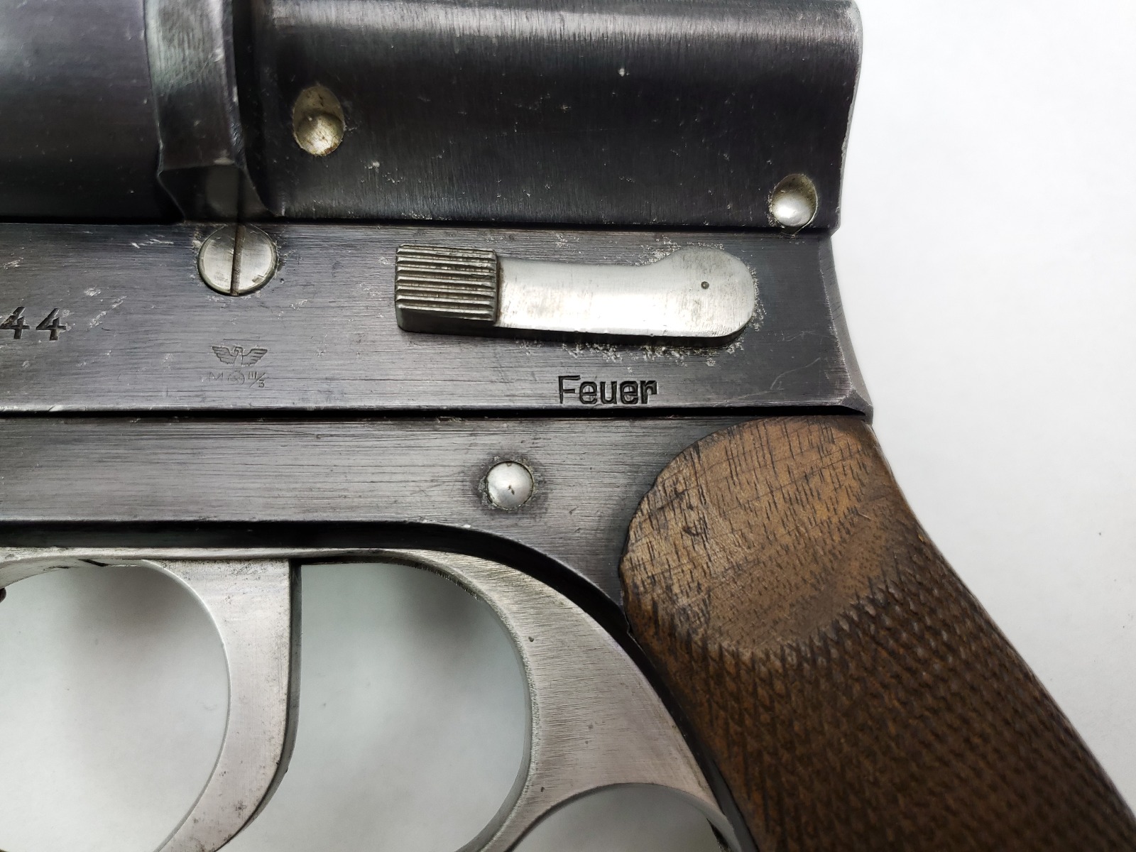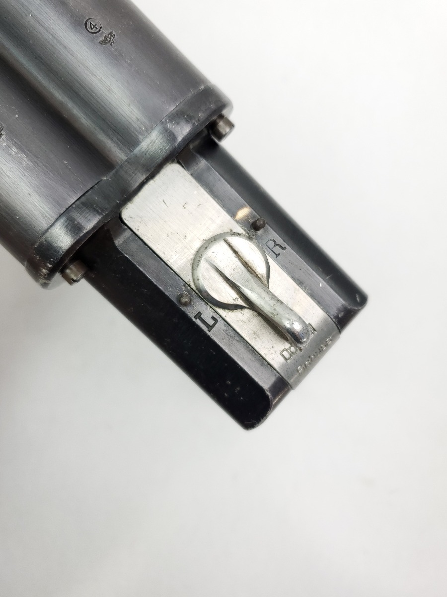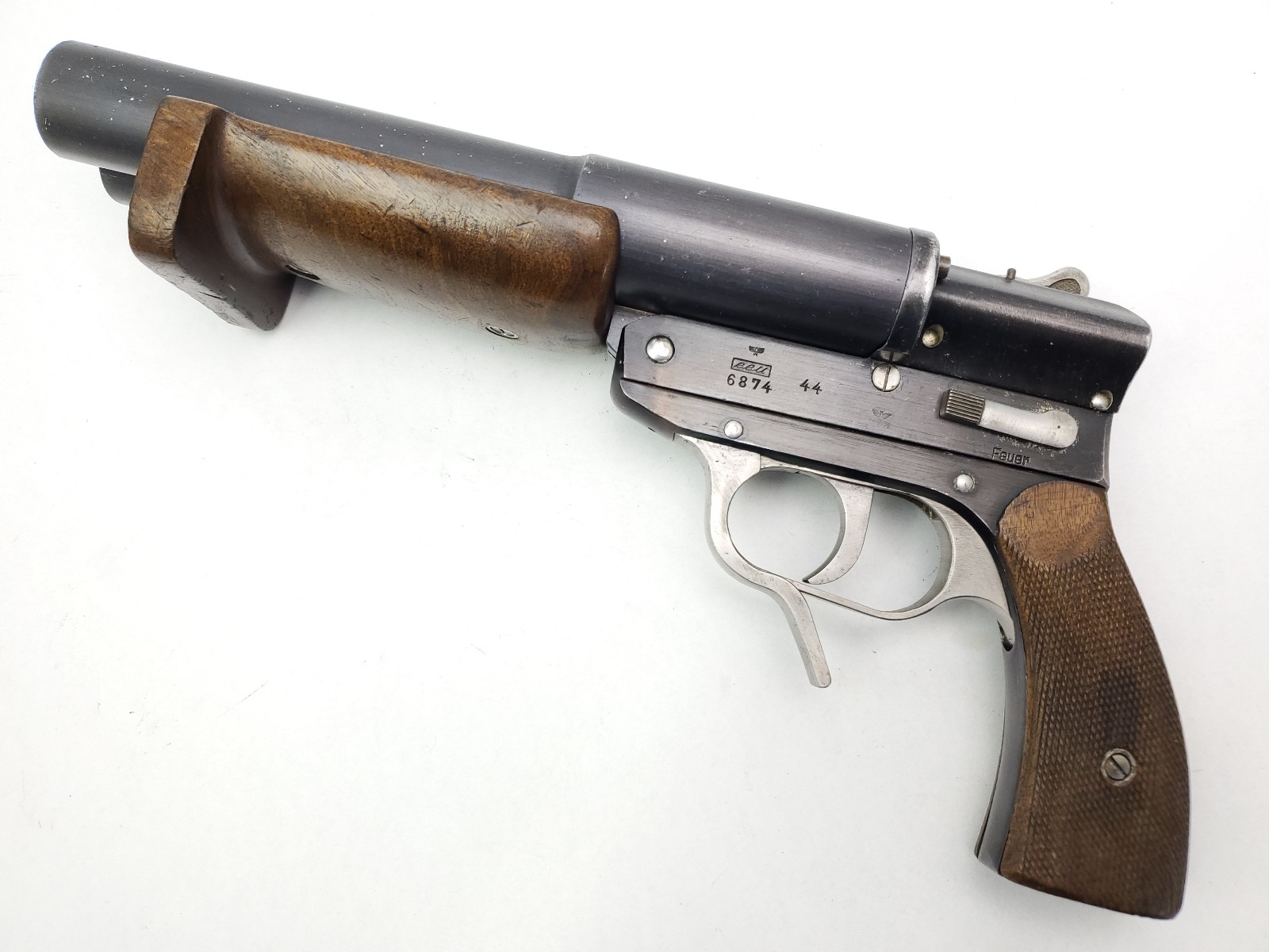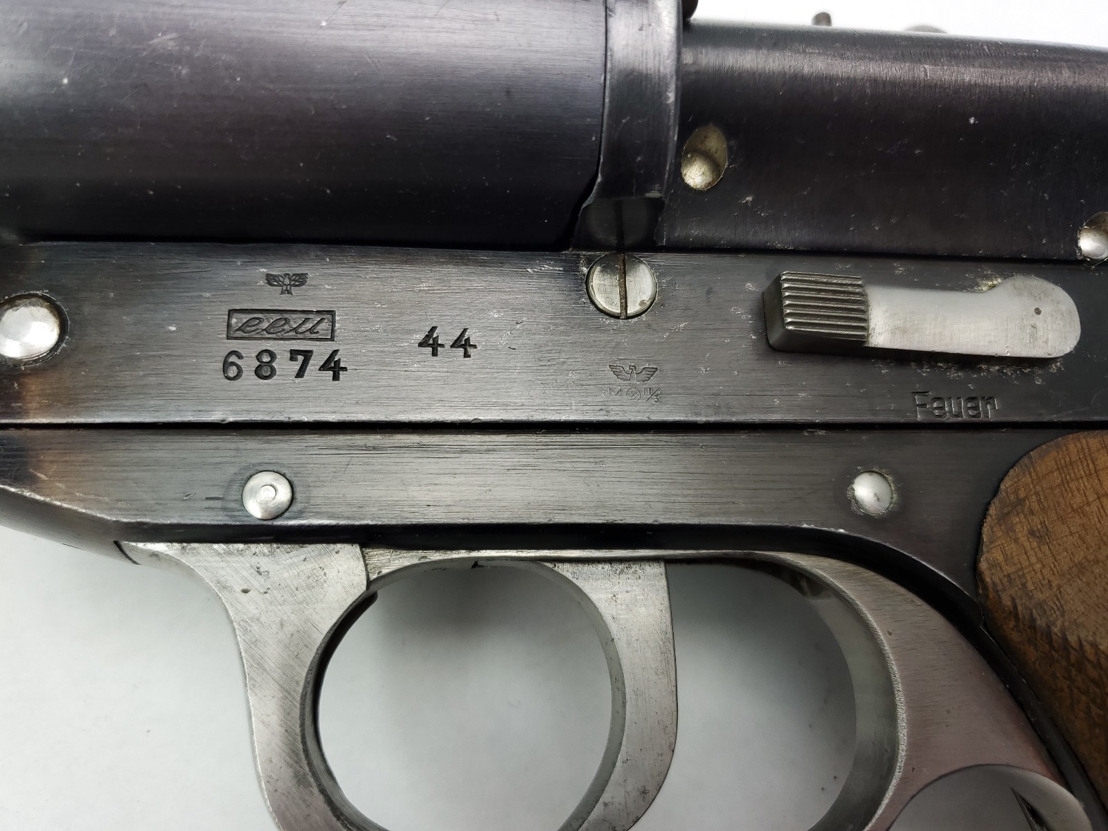 6/23/20 – This is an original WW2 U-Boat Kriegsmarine scarce model SLD – Signal und Leucht Doppelschussmodelce (literally ”signal & light double shot model). The pistol has a pair of 9 1/4” barrels and a 4 3/4” wooden fore-end to give the user a more secure grip when the pistol was fired. This double barrel flare pistol was manufactured in 4 bore and accepted 27mm flares with a variety of signaling and lighting purposes. The left side of frame is waffenamt and has the “eeu” makers mark. It also has a fairly faint “Eagle M” marking. Both barrels have a “4” within a circle and are waffentamt proof stamped. This particular example is in excellent condition and is fully functional. Most of the bluing is in tact, though there is some thinning on the barrels, and some light white specs of wear near the muzzle (as shown in photos). There are also very small white dots throughout the barrels. We assume this is a reaction of the aluminum with the salt air. We saw this similar wear on another example we’ve offered for sale. The wood parts are excellent – just a few light handling marks. The bores are excellent. Fully functional with a functioning safety.