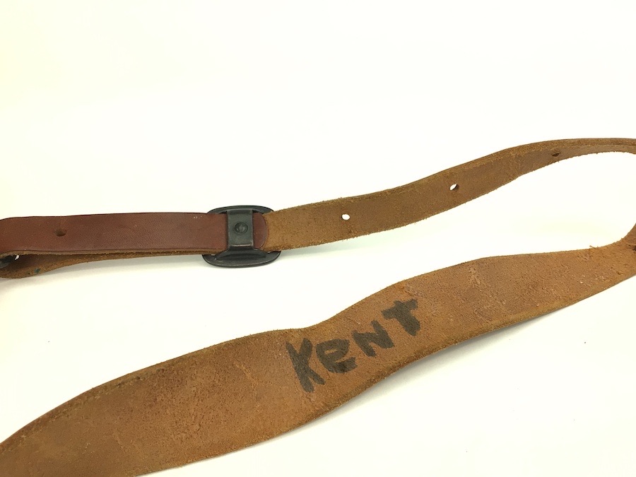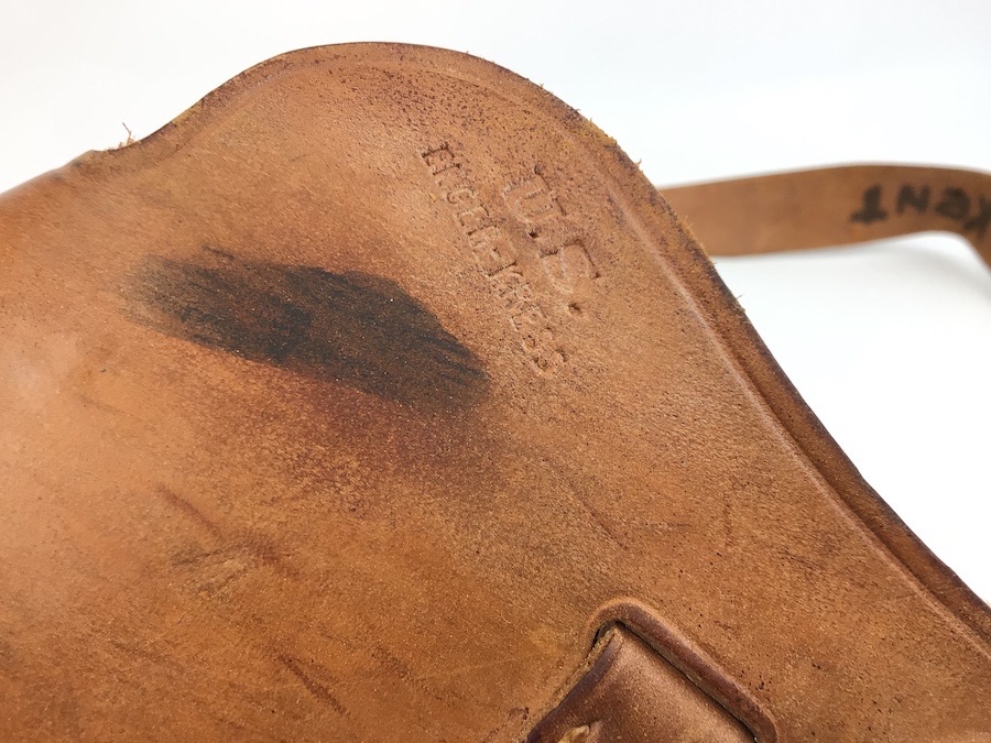 6/8/22 – Original and great condition. WW2 era model 1911A1 shoulder holster made by Enger-Kress. The holster is maker stamped on the back of the leather. The leather is light brown and very good condition, with all original stitching. Minor surface scuffs, but overall very nice. Clean interior leather. Shoulder strap and, buckles and all fasteners are intact and functional. The under side of the strap has been personalized with the name “KENT”.