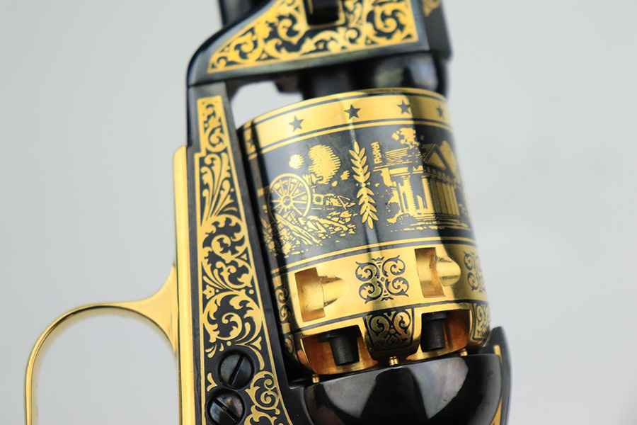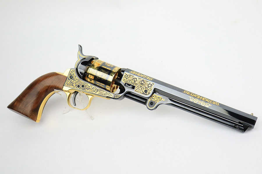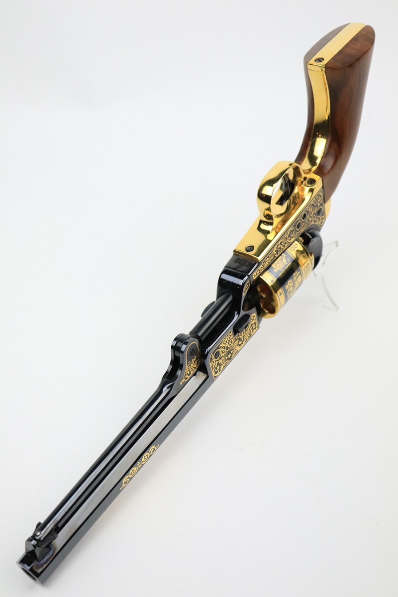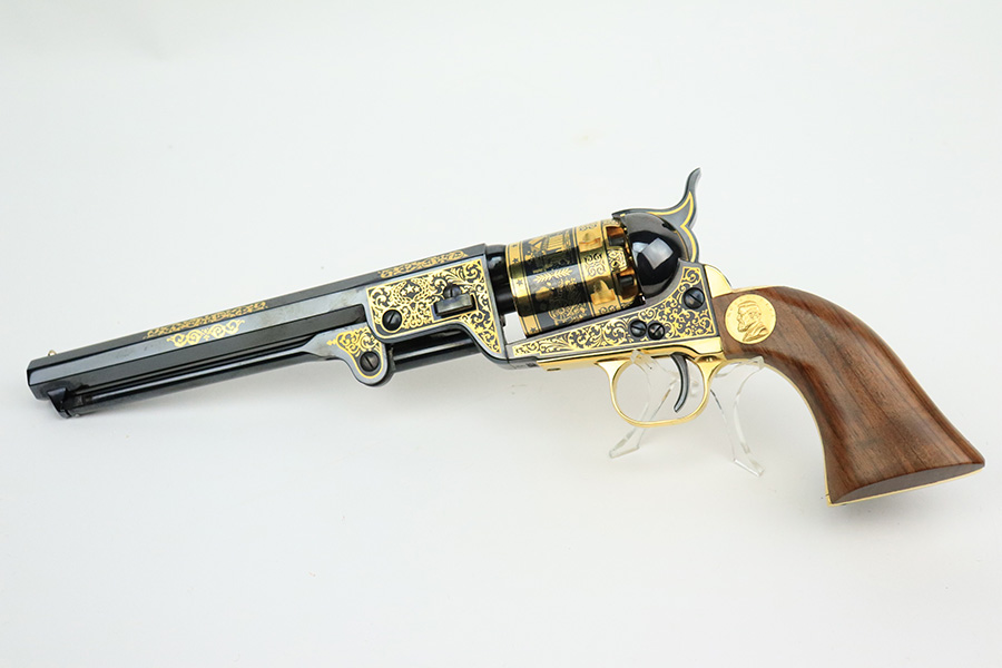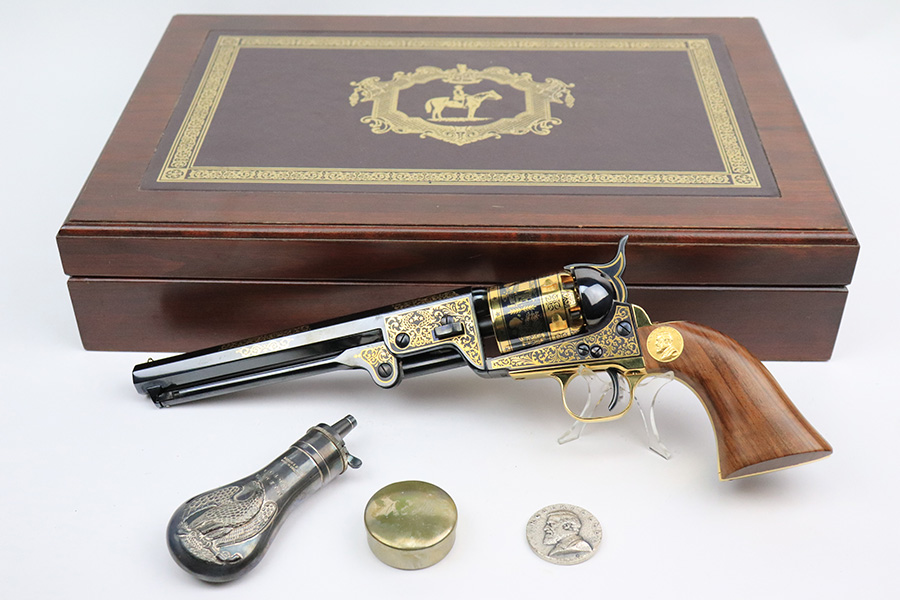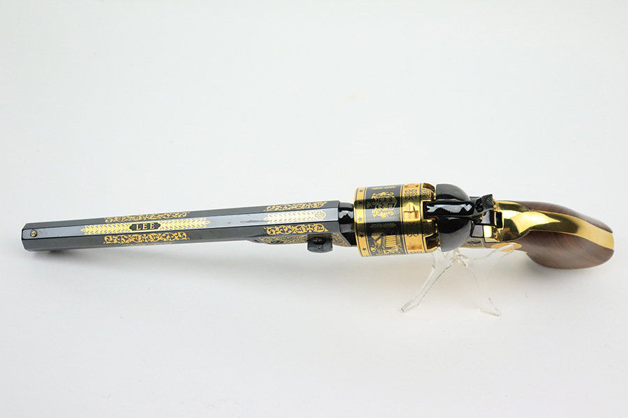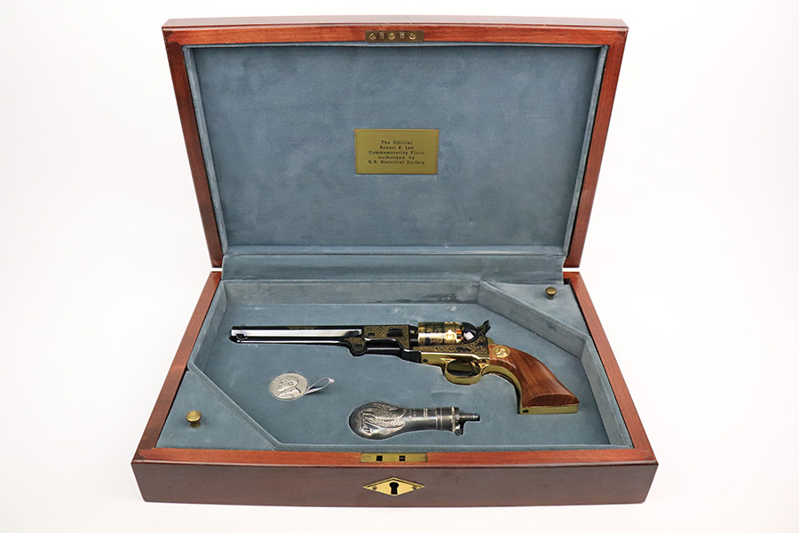 8/26/22 – This is an unfired 1851 Navy that was made by the U.S. Historical Society to commemorate Robert E. Lee. Blued finish with etched gold decorative motifs, smooth walnut grips with gold Robert E. Lee bust medallion in left grip at the frame junction. Top flat of barrel marked LEE with gold leaf decorations, cylinder scene of heroic southern theme in gold as well. Revolver is contained in a gray velvet lined wood casing with gold embossed leather panel on the lid featuring the iconic “Lee on Traveller” image. The listing includes a presentation case with powder tin and coin. These guns were “authorized” by the Williamsburg Firearms Manufactory and were limited to a total issue of 2,500 units that were originally priced at $2,100 when issued circa 1984.