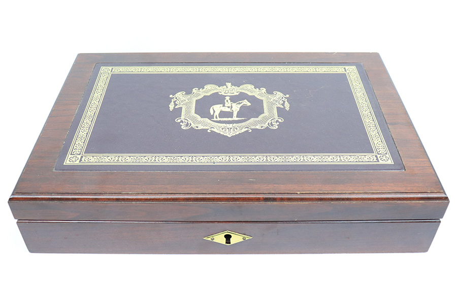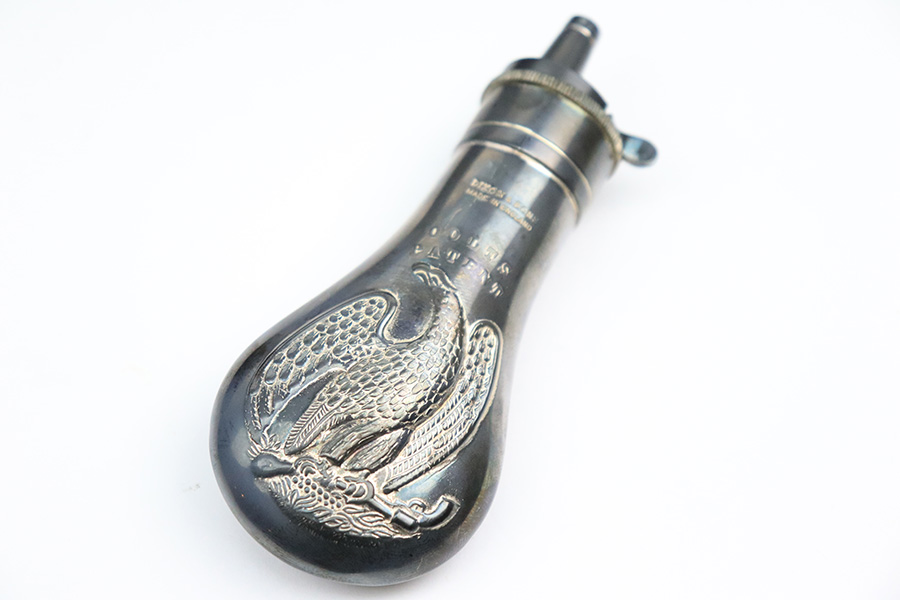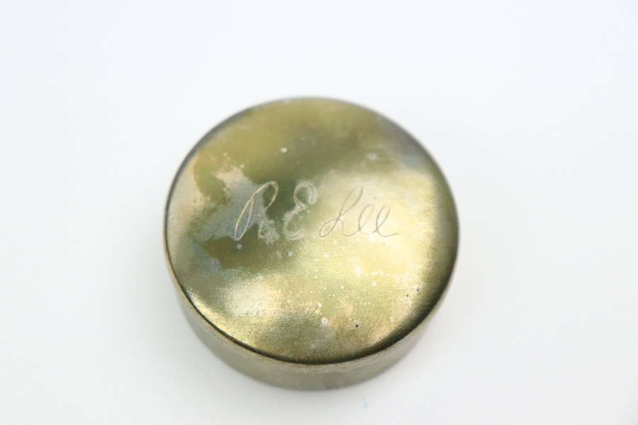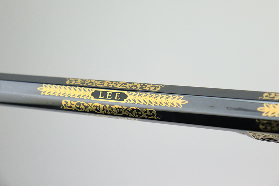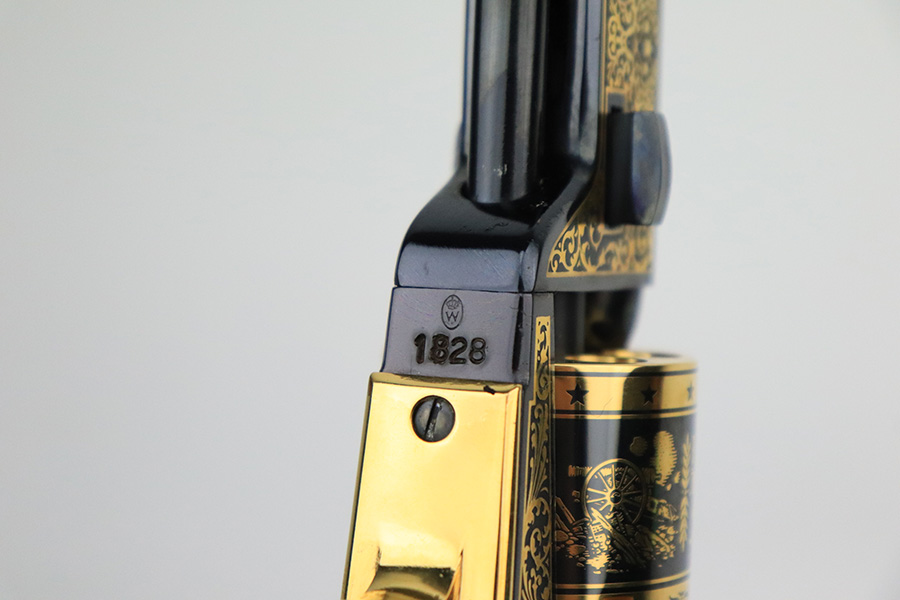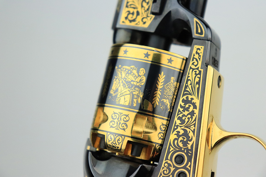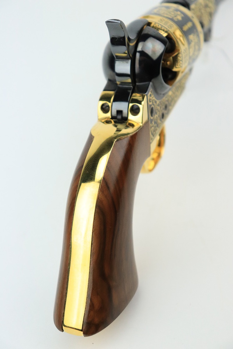 8/26/22 – This is an unfired 1851 Navy that was made by the U.S. Historical Society to commemorate Robert E. Lee. Blued finish with etched gold decorative motifs, smooth walnut grips with gold Robert E. Lee bust medallion in left grip at the frame junction. Top flat of barrel marked LEE with gold leaf decorations, cylinder scene of heroic southern theme in gold as well. Revolver is contained in a gray velvet lined wood casing with gold embossed leather panel on the lid featuring the iconic “Lee on Traveller” image. The listing includes a presentation case with powder tin and coin. These guns were “authorized” by the Williamsburg Firearms Manufactory and were limited to a total issue of 2,500 units that were originally priced at $2,100 when issued circa 1984.