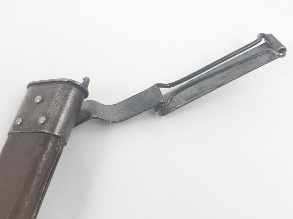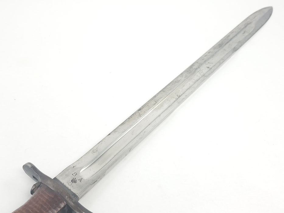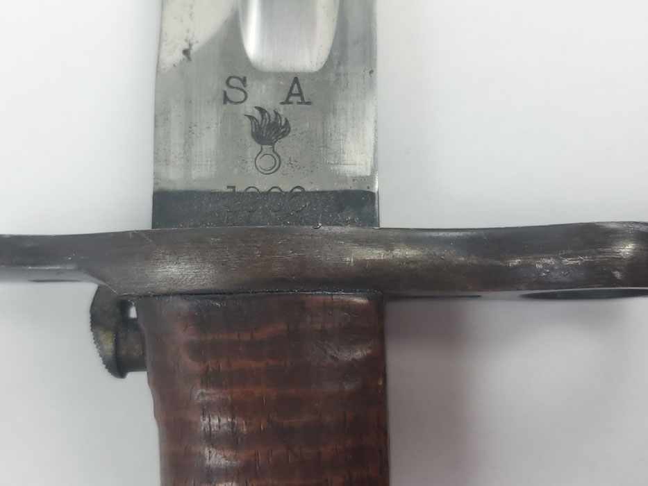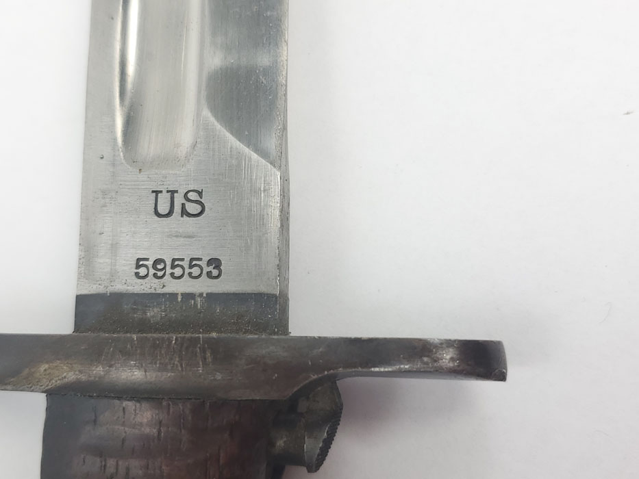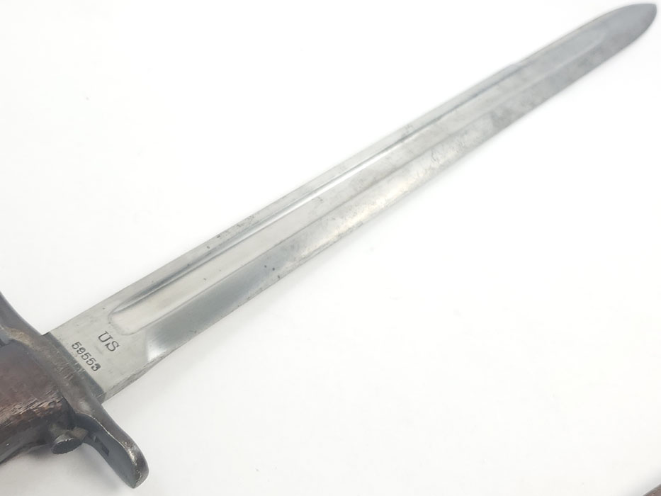 4/24/20 – This is a fairly scarce, all original and early WW1 era model 1903 bayonet with the original scabbard and hanger. The blade is marked “S A” for Springfield armory with a flaming bomb. The reverse is marked US 59553. The blade is overall in great condition with minor oxidation and no signs of sharpening. The wood handle is excellent with only one very minor scuff. The stretched brown leather is excellent as well, but the exterior layer is splitting at the seam on the toe of the scabbard – see photos. This is a stitching issue and not a leather issue. Otherwise this piece has no major flaws.