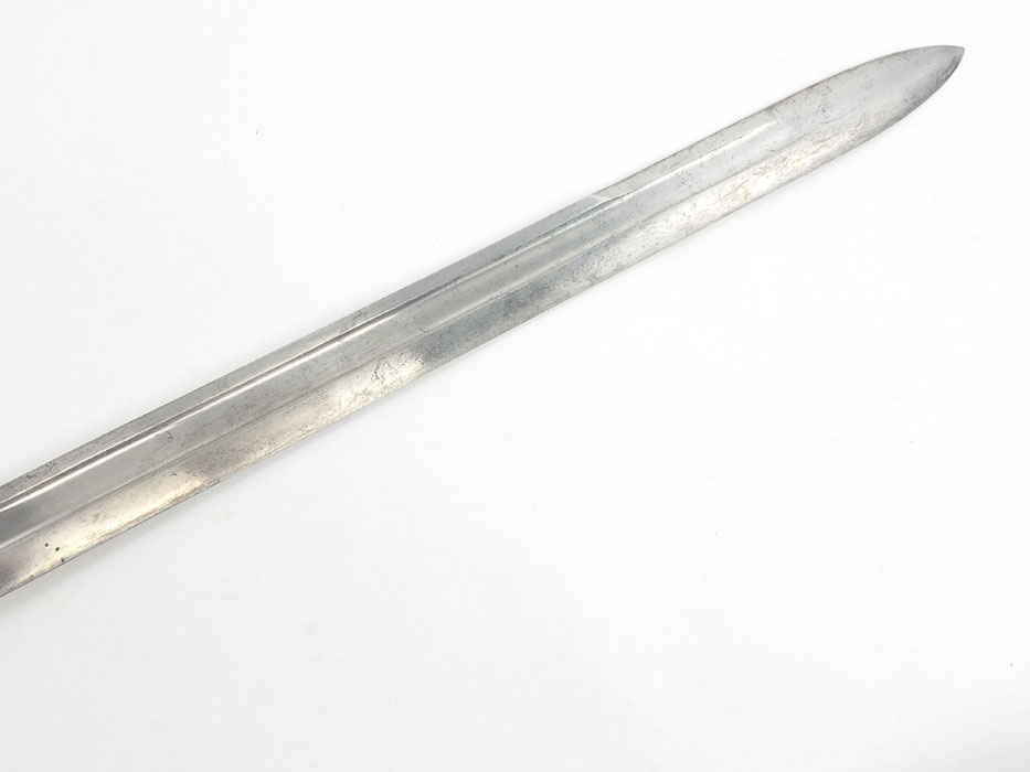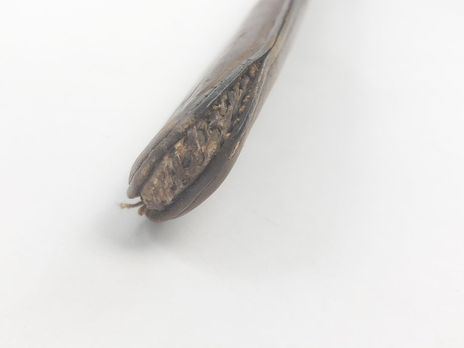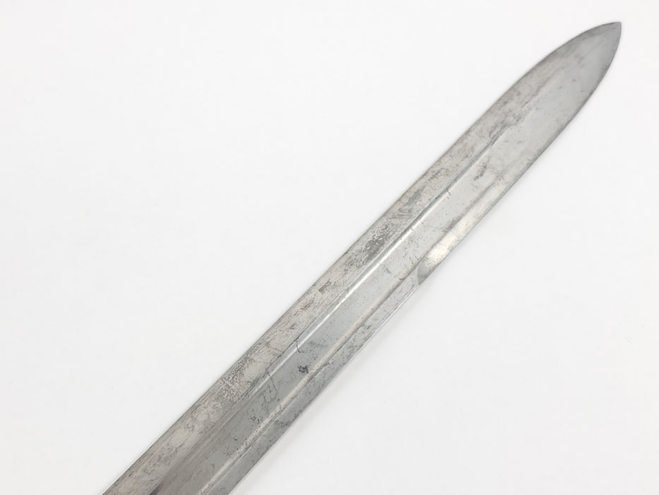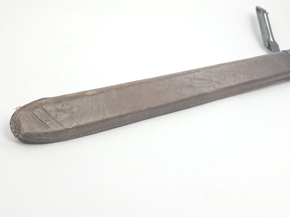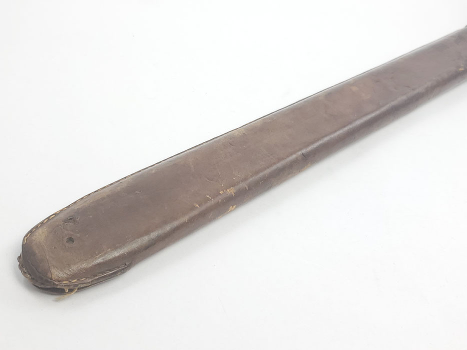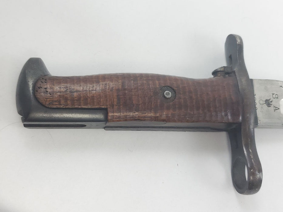 4/24/20 – This is a fairly scarce, all original and early WW1 era model 1903 bayonet with the original scabbard and hanger. The blade is marked “S A” for Springfield armory with a flaming bomb. The reverse is marked US 59553. The blade is overall in great condition with minor oxidation and no signs of sharpening. The wood handle is excellent with only one very minor scuff. The stretched brown leather is excellent as well, but the exterior layer is splitting at the seam on the toe of the scabbard – see photos. This is a stitching issue and not a leather issue. Otherwise this piece has no major flaws.