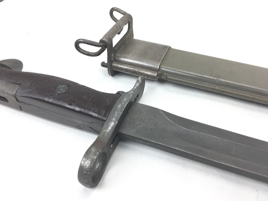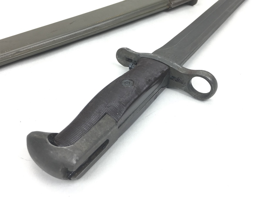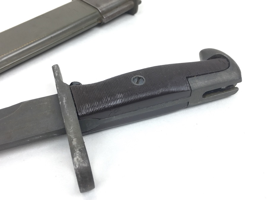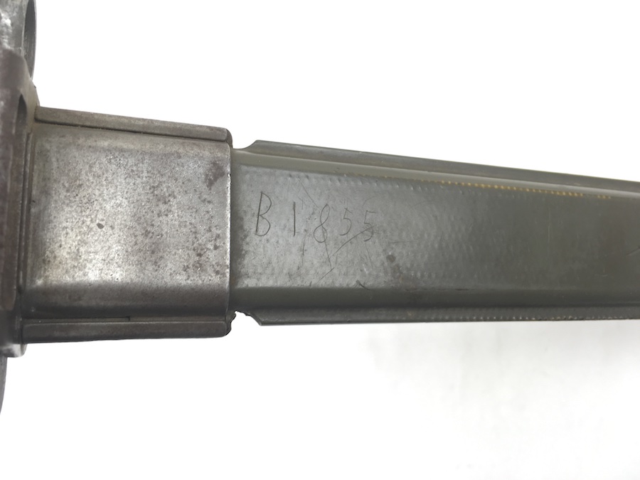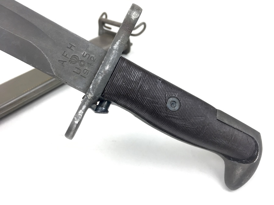 7/8/19 – This is a very good condition U.S. M1942 bayonet for the M1 Garand Rifle. Includes the correct WWII Issue M3 fiberglass scabbard. This 16″ bayonet has the early and desirable brown colored grips. Tight & secure with no cracks or chips. The blade ricasso is maker marked A. F. H. (American Fork & Hoe of Geneva Ohio) above “U.S.” and the Ordnance flaming bomb. Date stamped 1942. The original finish on the blade is about 98% with minor scabbard wear and no evidence of sharpening. The scabbard is marked with the ordinance bomb and has some minor high edge wear. Personalized on the back “B1855” But, otherwise, very good condition with no breaks. Nice piece of US military history.