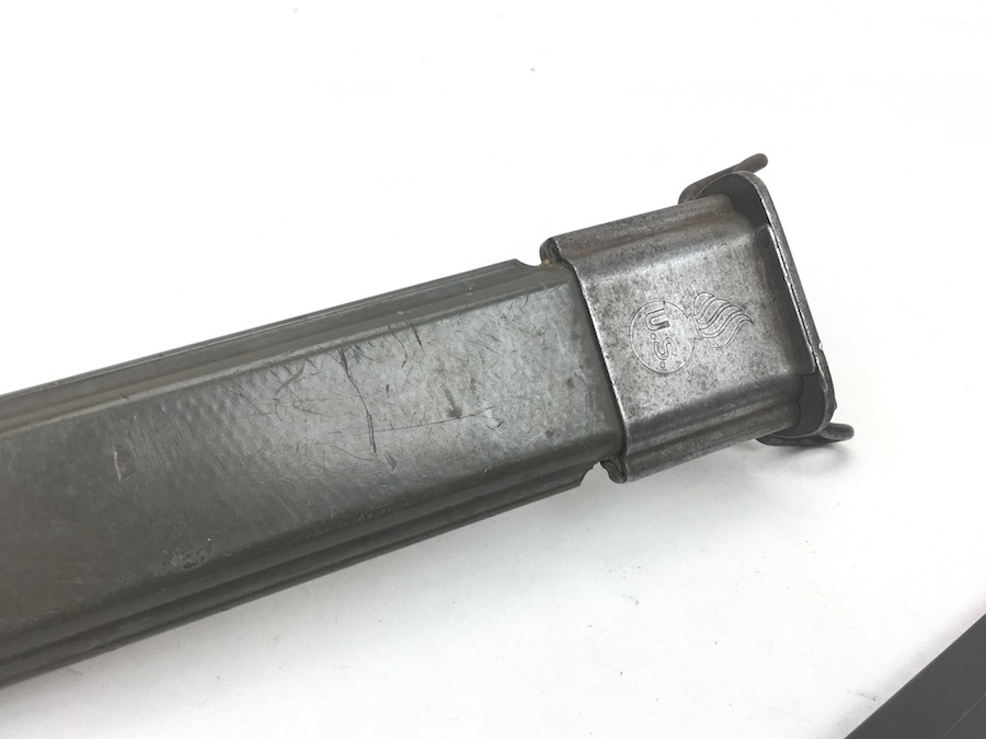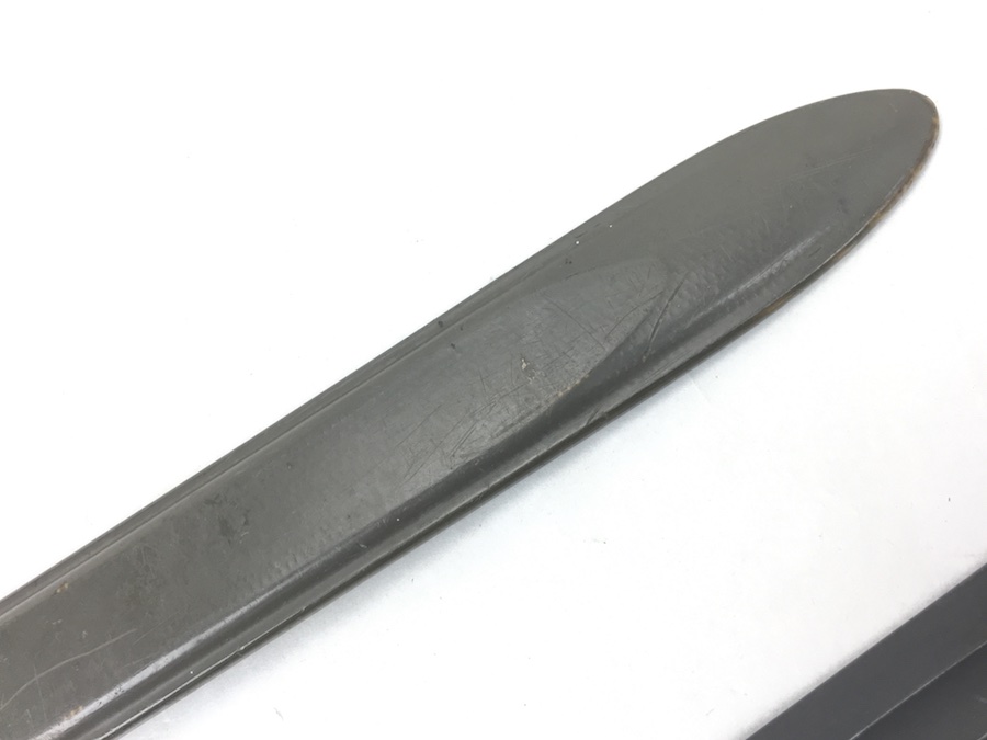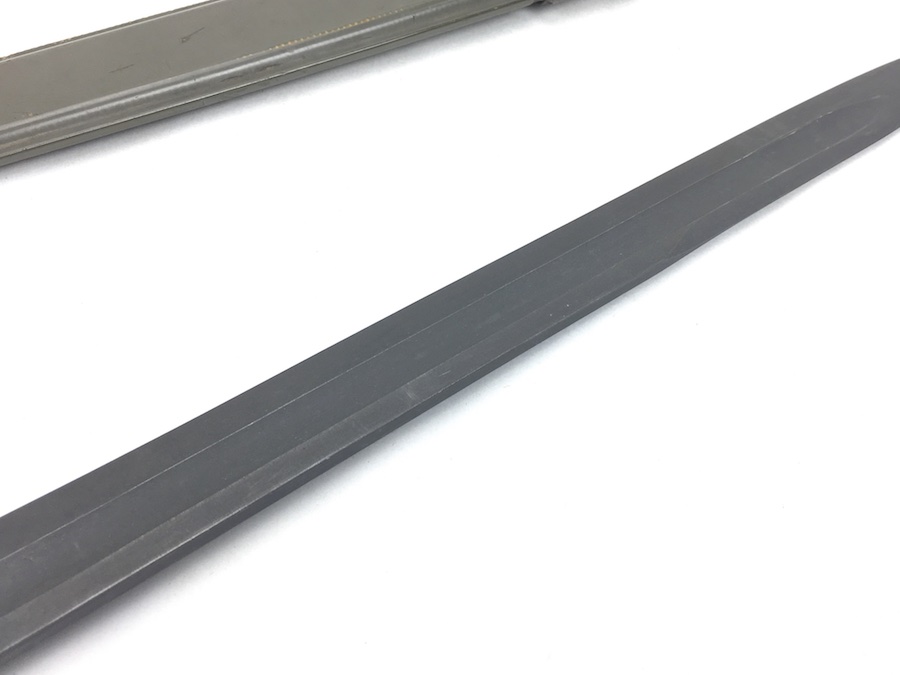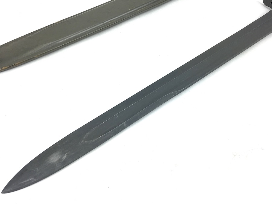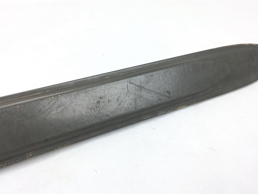 7/8/19 – This is a very good condition U.S. M1942 bayonet for the M1 Garand Rifle. Includes the correct WWII Issue M3 fiberglass scabbard. This 16″ bayonet has the early and desirable brown colored grips. Tight & secure with no cracks or chips. The blade ricasso is maker marked A. F. H. (American Fork & Hoe of Geneva Ohio) above “U.S.” and the Ordnance flaming bomb. Date stamped 1942. The original finish on the blade is about 98% with minor scabbard wear and no evidence of sharpening. The scabbard is marked with the ordinance bomb and has some minor high edge wear. Personalized on the back “B1855” But, otherwise, very good condition with no breaks. Nice piece of US military history.