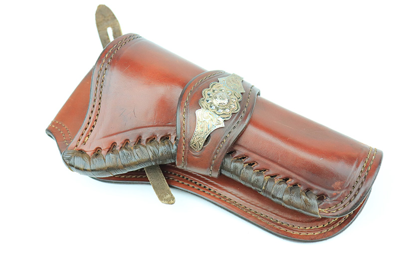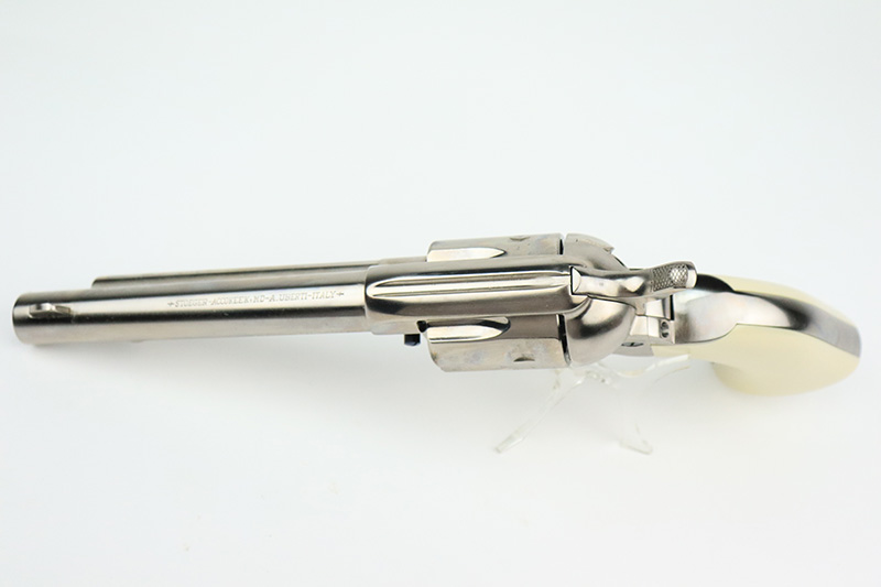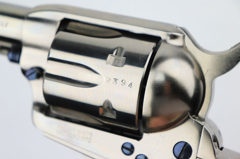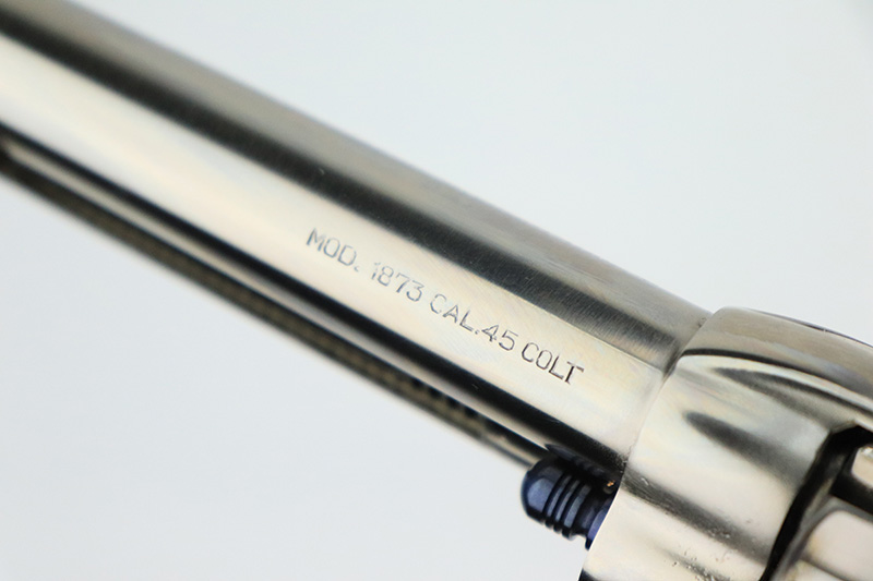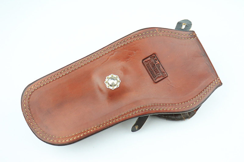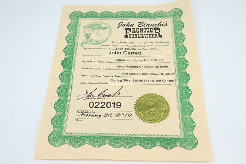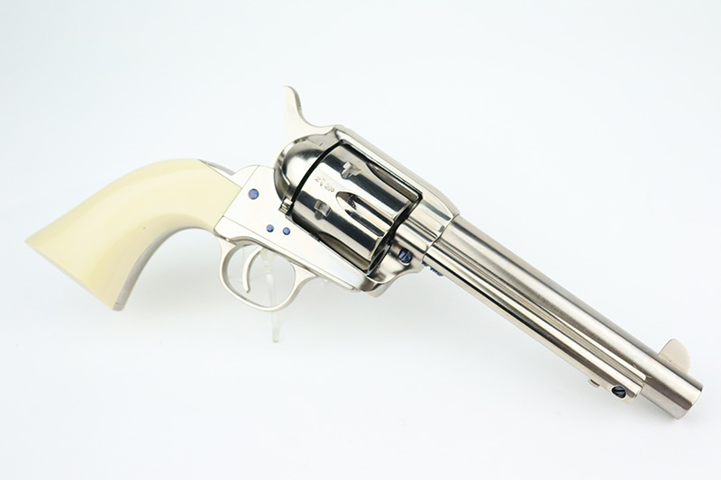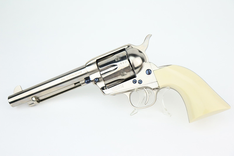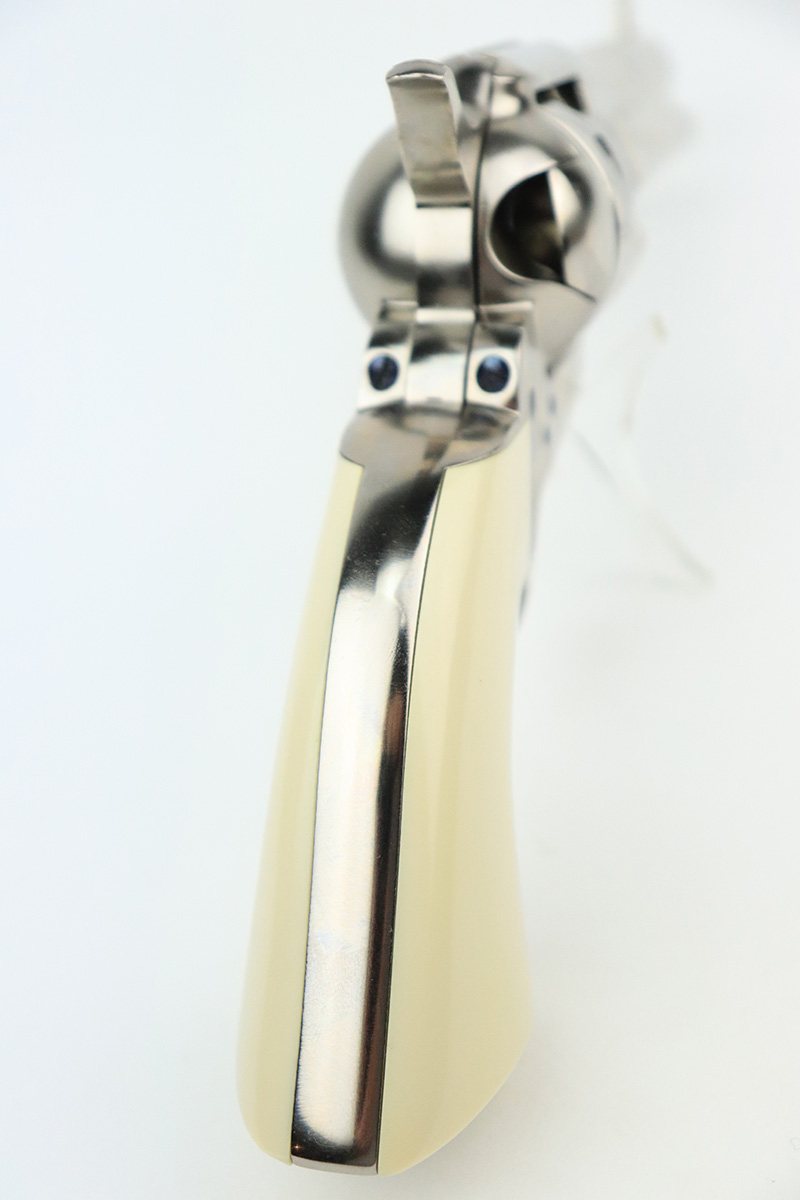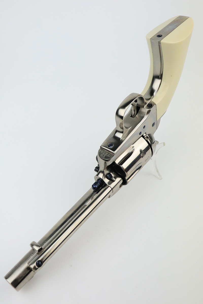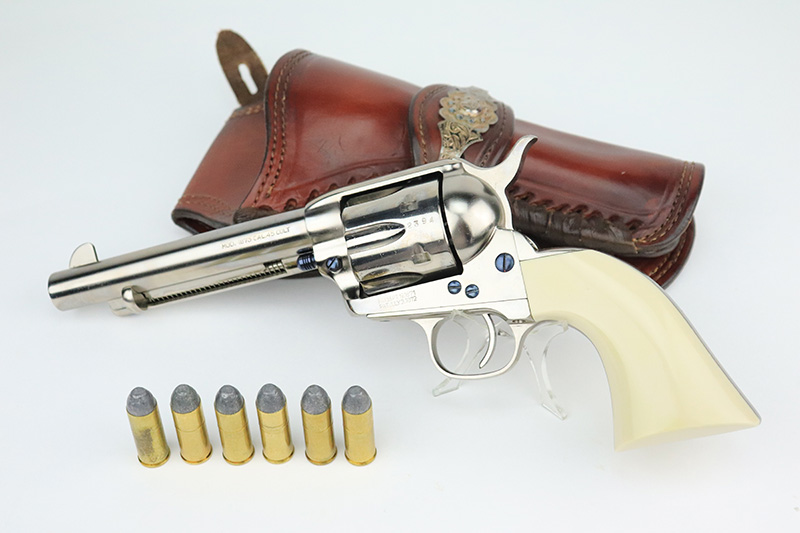 11/1/22 – This is a mint Uberti 1873 Cattleman Cody revolver with holster and ammo. It is factory nickel finish with faux ivory grips. Like new condition, only test fired. Barrel is 5.5in and chambered for .45c. The listing comes with a Bianchi American Legacy Model #1896 leather holster, which has double row, hand stamped borders and a superb holster emblem. Also comes with 85rds of loose Winchester Super X .45c ammo and a COA for the holster.