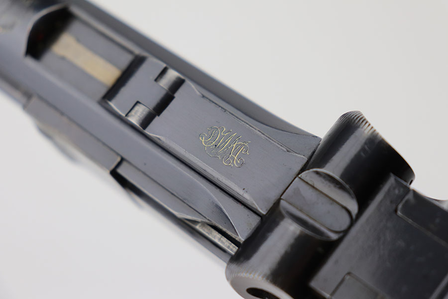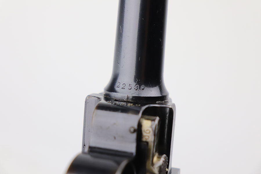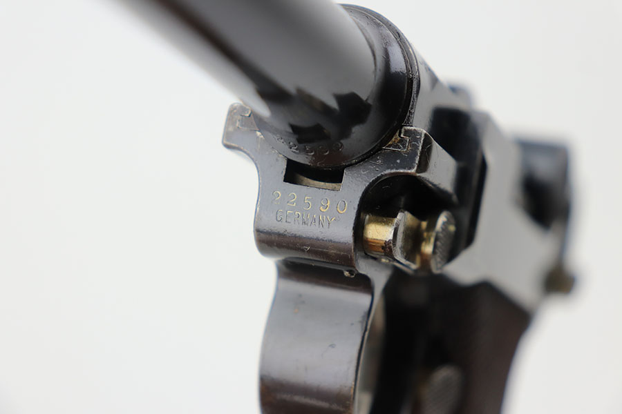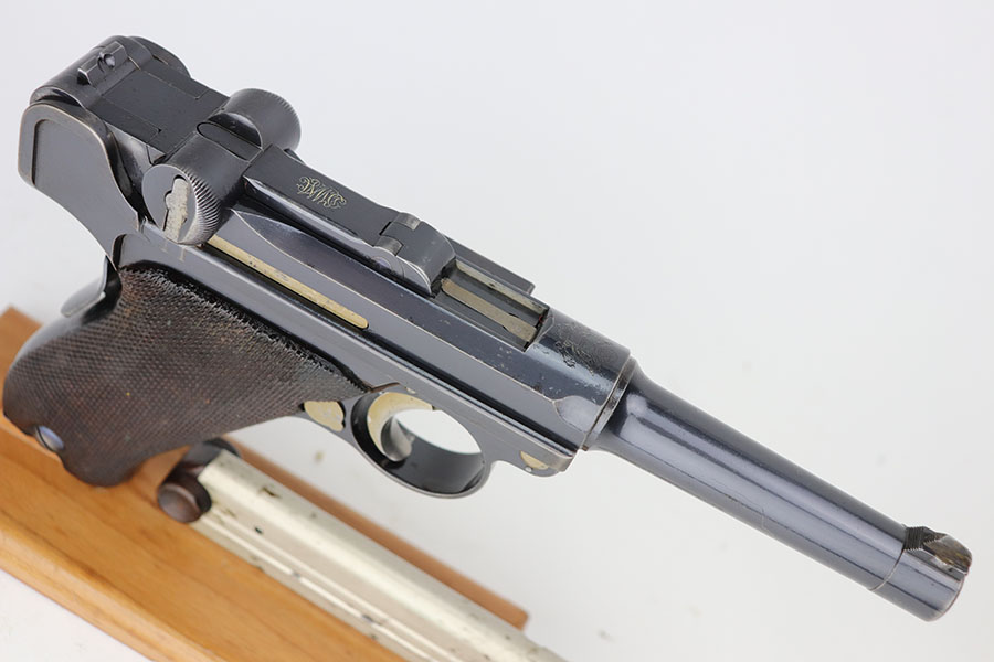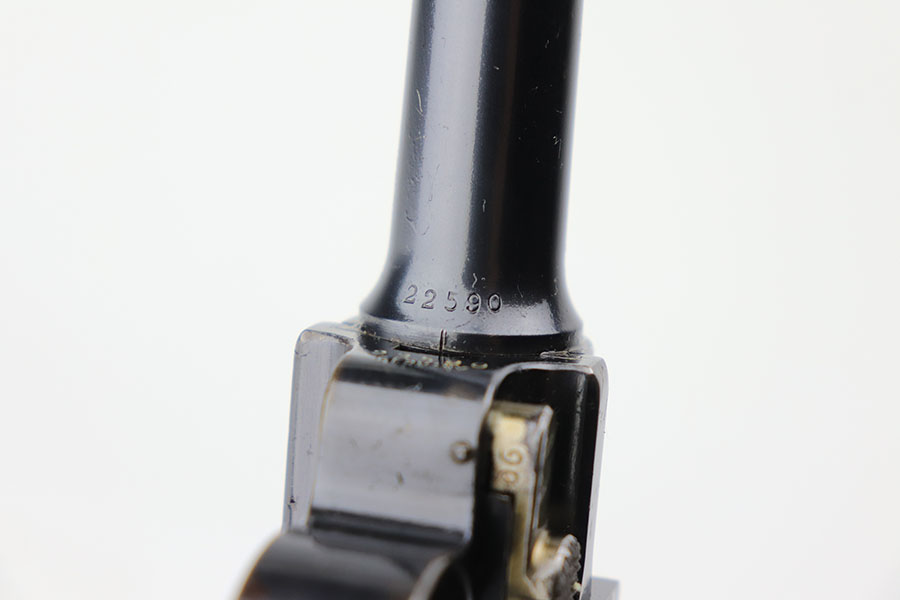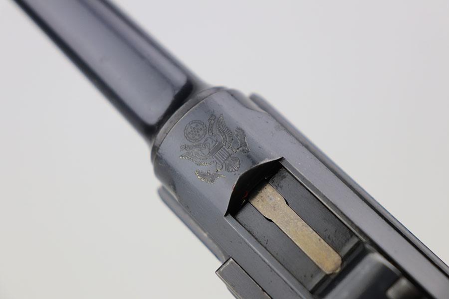 2/21/22 – This is a very desirable early Model 1902 “American Eagle” Luger pistol that is in excellent condition. These are rare with the fat barrel, as only 600-700 were ever produced in total, all for commercial sales in the United States. This model was a continuation of the earlier 1902 commercial Luger however these were specifically intended for the U.S. market, and these were the first 9mm chambered Lugers. This pistol has the short old style frame with leaf springs and no stock lug, recessed breech block, dished toggles with toggle lock and grip safety. The barrel extension is also the short old model with the top of the chamber area roll marked with the prominent “American Eagle” crest, with the front toggle correctly marked with the “DWM” logo. The bluing on this one rates at about 95%, with minor high edge wear on the muzzle and sideplate. There is also some patina on the grip frame, and the left side of the pistol has a few very minor areas of pinpricking. Original straw rates at around 90%. The grips show minor smoothing and handling wear but no cracks or chips. Both are marked internally with an asterisk, which we have seen specifically on other Fat Barrel examples but unsure the exact significance. Blank wood bottom magazine with a small crack in the base. Bore shows some use but has strong rifling and no pitting.