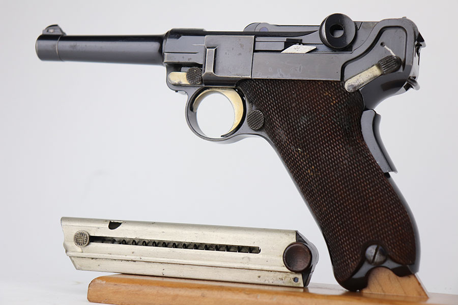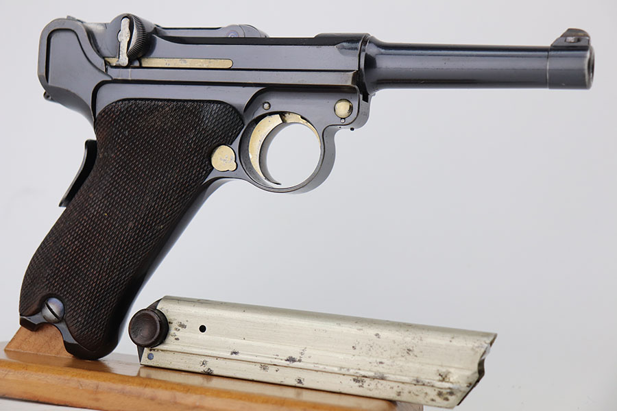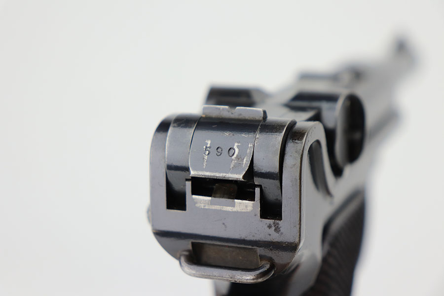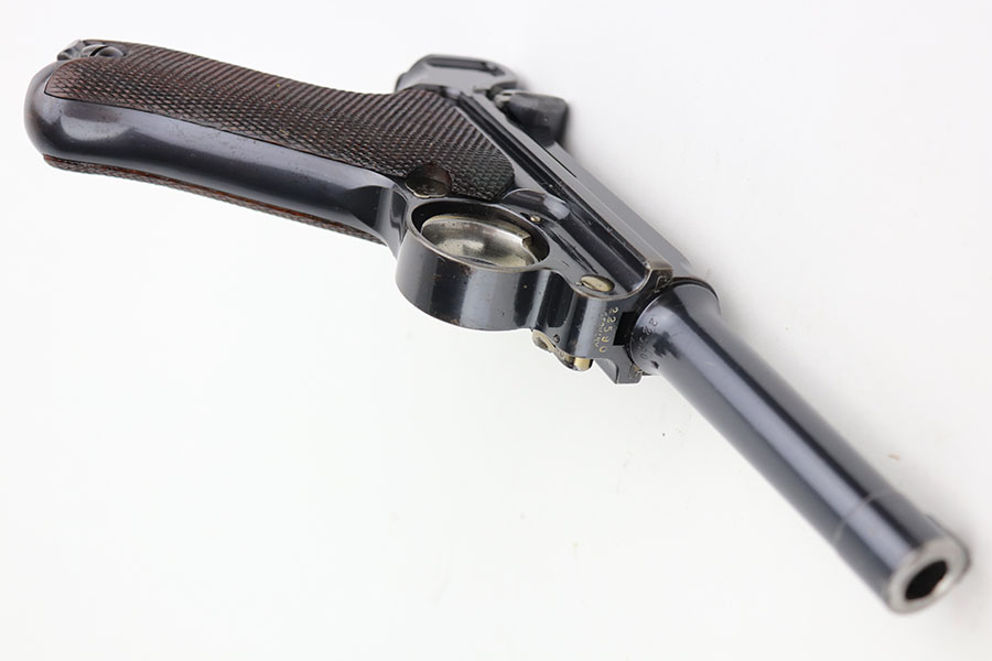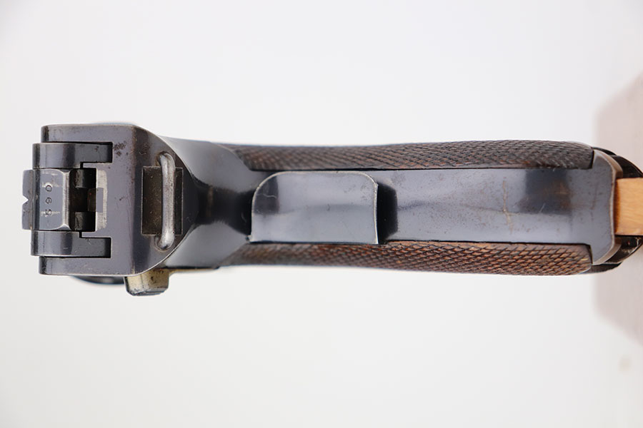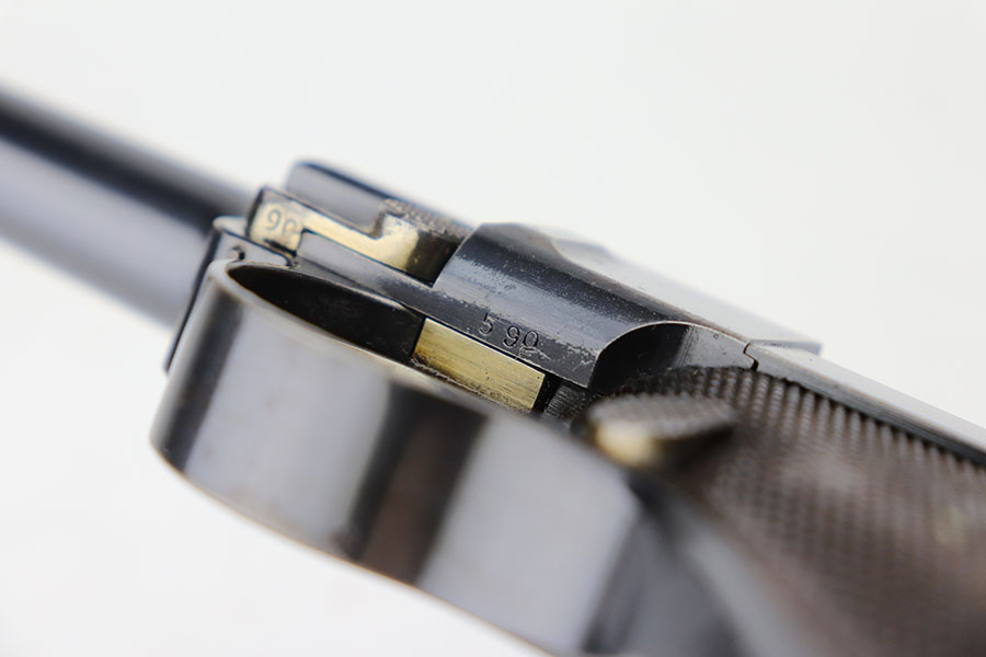 2/21/22 – This is a very desirable early Model 1902 “American Eagle” Luger pistol that is in excellent condition. These are rare with the fat barrel, as only 600-700 were ever produced in total, all for commercial sales in the United States. This model was a continuation of the earlier 1902 commercial Luger however these were specifically intended for the U.S. market, and these were the first 9mm chambered Lugers. This pistol has the short old style frame with leaf springs and no stock lug, recessed breech block, dished toggles with toggle lock and grip safety. The barrel extension is also the short old model with the top of the chamber area roll marked with the prominent “American Eagle” crest, with the front toggle correctly marked with the “DWM” logo. The bluing on this one rates at about 95%, with minor high edge wear on the muzzle and sideplate. There is also some patina on the grip frame, and the left side of the pistol has a few very minor areas of pinpricking. Original straw rates at around 90%. The grips show minor smoothing and handling wear but no cracks or chips. Both are marked internally with an asterisk, which we have seen specifically on other Fat Barrel examples but unsure the exact significance. Blank wood bottom magazine with a small crack in the base. Bore shows some use but has strong rifling and no pitting.
