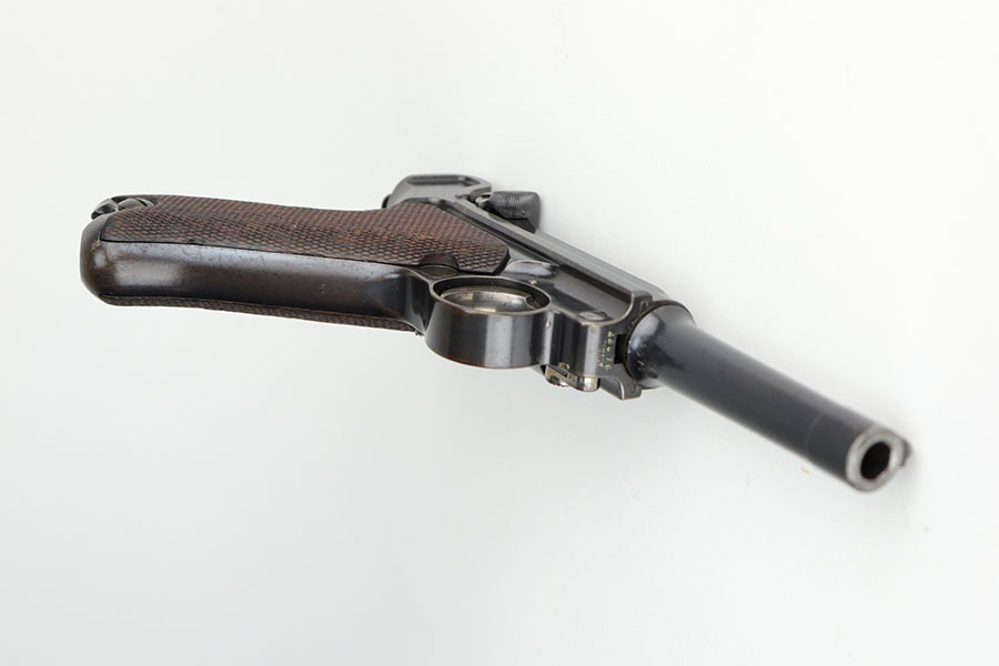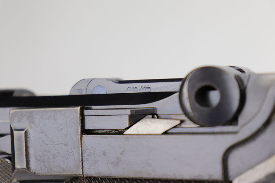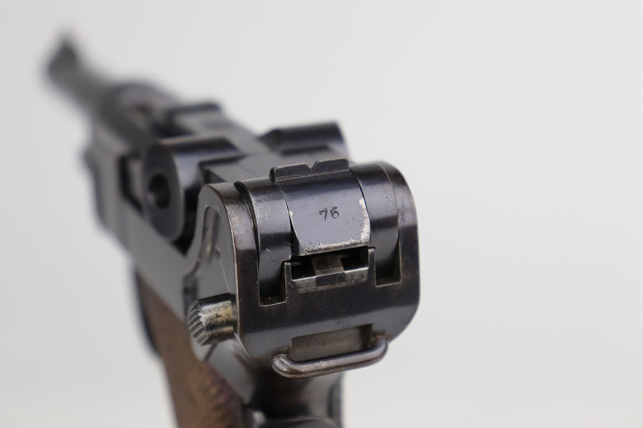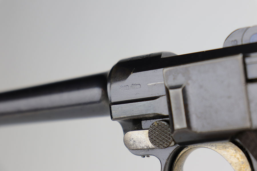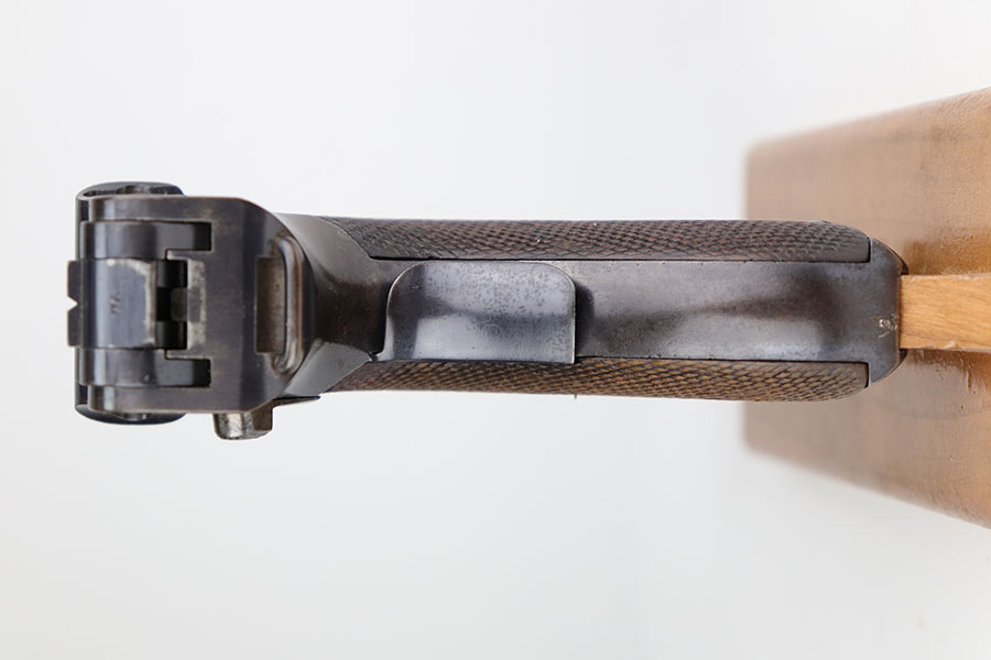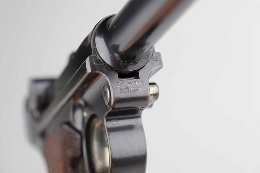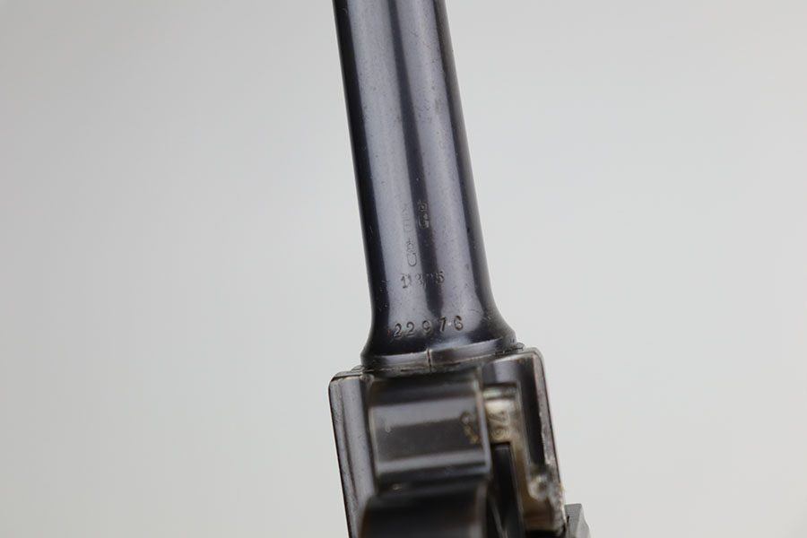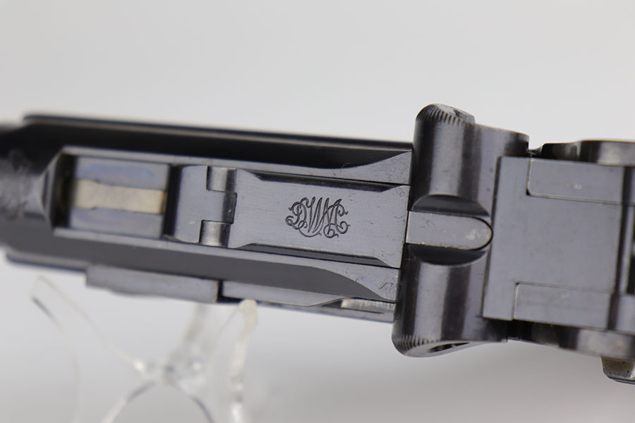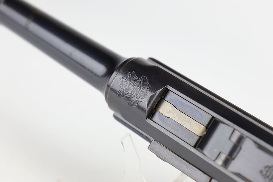 12/2/20 – This is a very desirable early Model 1902 “American Eagle” Luger pistol that is in very good condition. These are rare with the fat barrel, as only 600-700 were ever produced in total, all for commercial sales in the United States. This model was a continuation of the earlier 1902 commercial Luger however these were specifically intended for the U.S. market. This pistol has the short old style frame with leaf springs and no stock lug, recessed breech block, dished toggles with toggle lock and grip safety. The barrel extension is also the short old model with the top of the chamber area roll marked with the prominent “American Eagle” crest, with the front toggle correctly marked with the “DWM” logo. The bluing on this one is somewhat hard to rate as there is very little actual bluing loss, but patina throughout. Original straw rates at over 50%. The grips show smoothing and handling wear but no cracks or chips. Both are marked internally with an asterisk but unsure the significance. Wood bottom magazine with Germany export marking on the base. Bore has pronounced rifling but freckling and frost throughout.