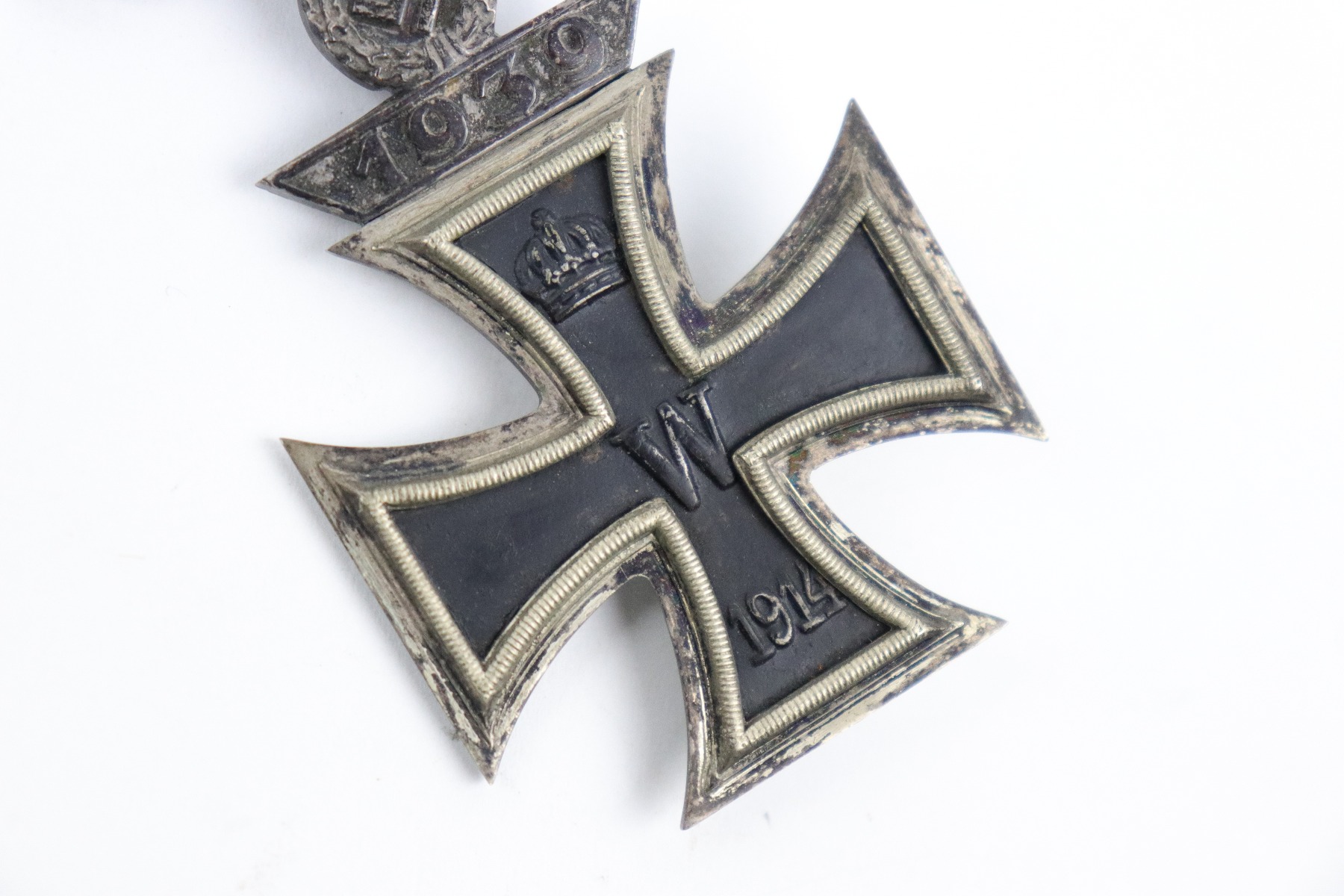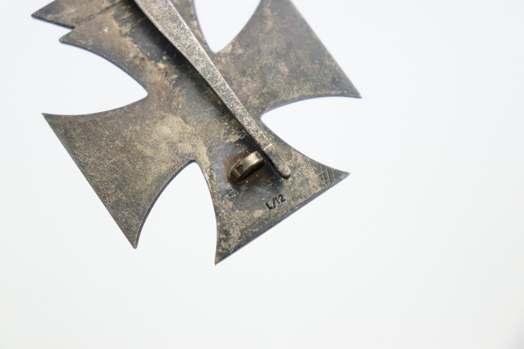 8/18/20 – This is an ultra-rare, WW1, German, double iron cross, 1st class award. One is dated 1914 (WW1) and the other is dated 1939 (WW2). It was issued to a veteran of both World Wars. The bottom Iron Cross. was made for the veteran by C.E. Juncker (L/12 makers marked on the reverse) likely in the early 1940s after receiving a 1939 Iron Cross. Both pieces have heavy patina and are great examples of this rare variation.