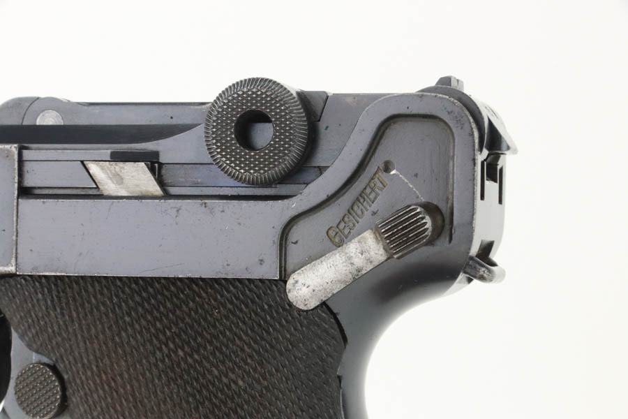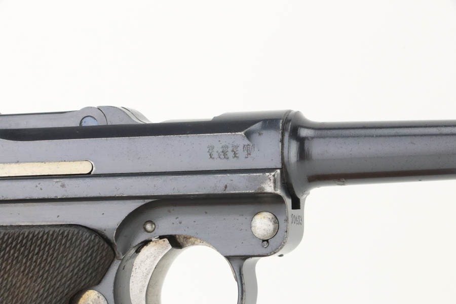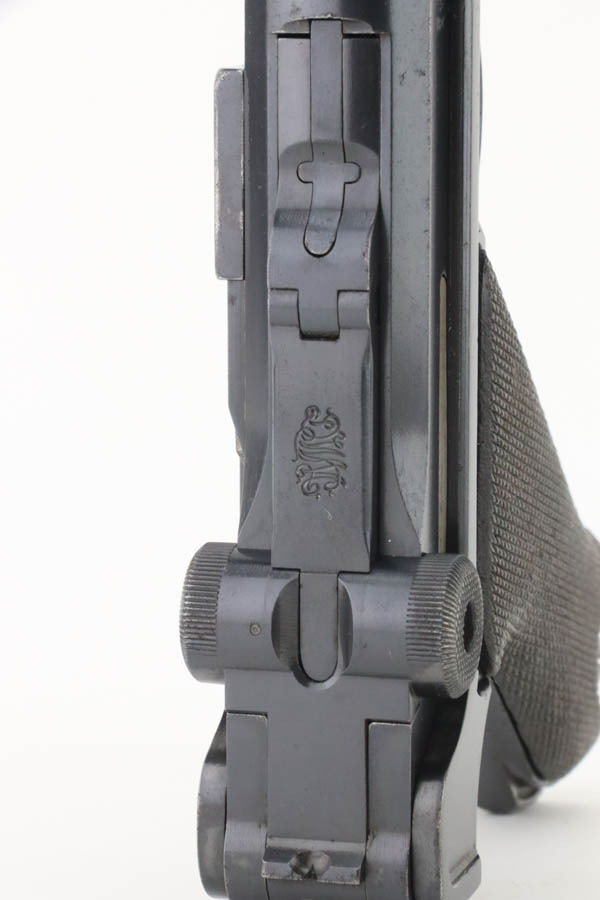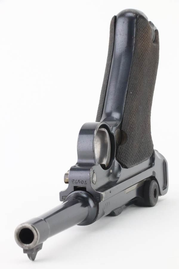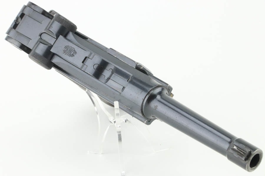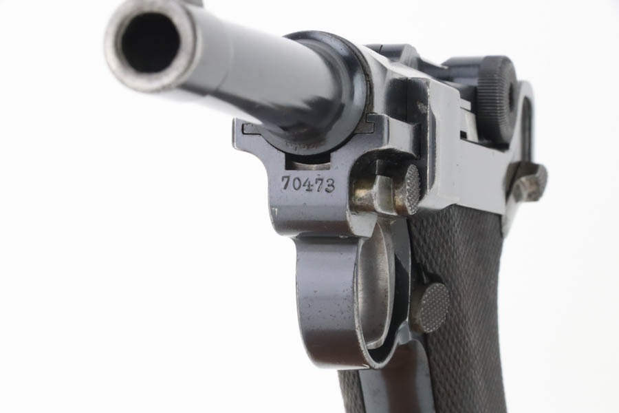 11/5/24 – This is an ultra rare DWM Model 1914 Commercial Army Luger. Only 100 of this variation made in the 69100 – 71000 serial. They can be identified by their blank chamber and unique triple Crown/X imperial proofs on the right side of the slide. The 1914 Commercial Army model was made specifically for contract military sales to the German Army. With the introduction to the 1908 models, the German Army found renewed interest and need for the Pistole Parabellum. This was the landmark model the gave the Luger it’s military designation, P.08. These 100 Lugers were taken from commercial production. This one is all matching and in excellent condition. It’s original finish rates about 96% with just minor high edge wear. Very light freckling on the grip straps. Fitted with mismatched grips, both numbered “54”. Comes with a mismatched magazine – the hold-open doesn’t work properly with this magazine. The bore has good rifling with very light pin-pricking throughout.