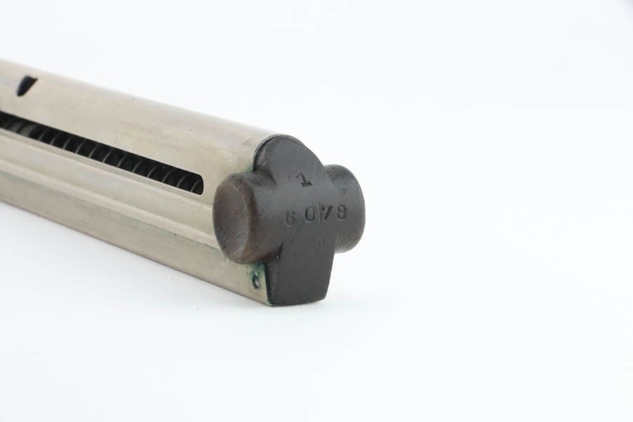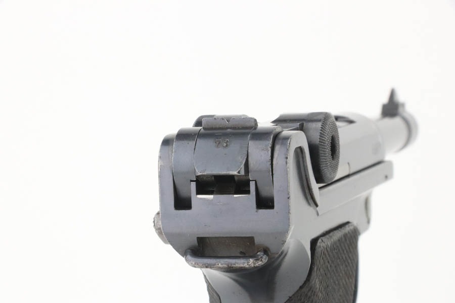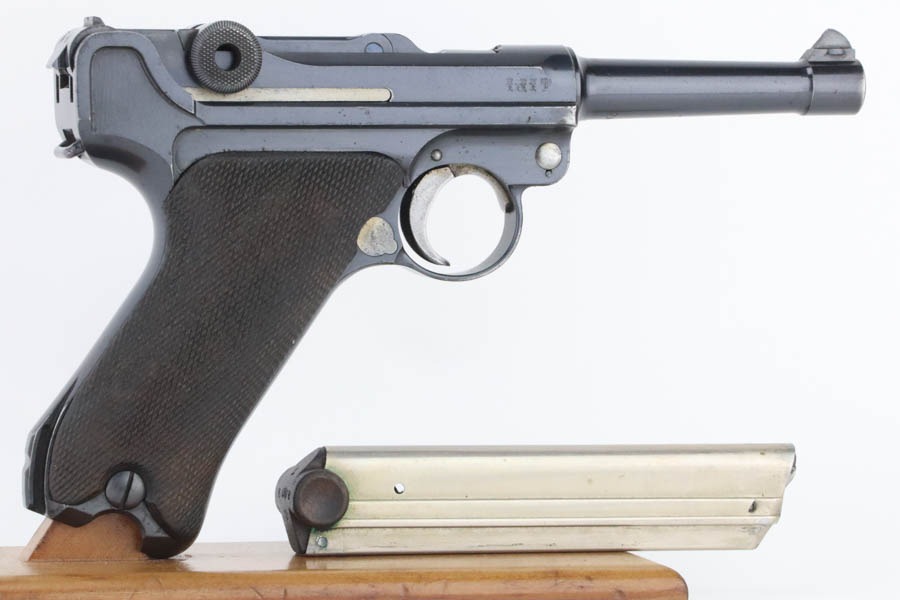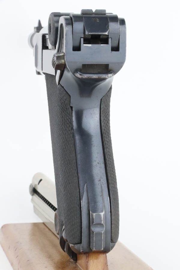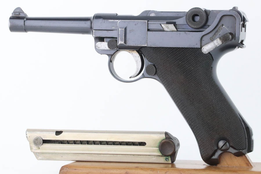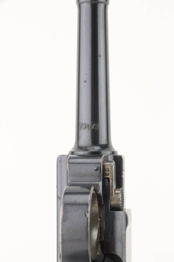 11/5/24 – This is an ultra rare DWM Model 1914 Commercial Army Luger. Only 100 of this variation made in the 69100 – 71000 serial. They can be identified by their blank chamber and unique triple Crown/X imperial proofs on the right side of the slide. The 1914 Commercial Army model was made specifically for contract military sales to the German Army. With the introduction to the 1908 models, the German Army found renewed interest and need for the Pistole Parabellum. This was the landmark model the gave the Luger it’s military designation, P.08. These 100 Lugers were taken from commercial production. This one is all matching and in excellent condition. It’s original finish rates about 96% with just minor high edge wear. Very light freckling on the grip straps. Fitted with mismatched grips, both numbered “54”. Comes with a mismatched magazine – the hold-open doesn’t work properly with this magazine. The bore has good rifling with very light pin-pricking throughout.