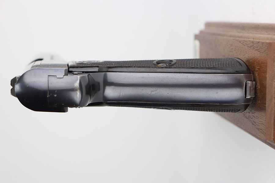 7/26/21 – This is one of the finest known examples of the super rare Walther Model 6, one of only 1,000 produced. The Model 6 was an attempt by Walther to develop a service pistol for the armed forces in the standard military caliber of 9mm Luger. The design was refused due to weak mechanics, so very few were ever military accepted. Some officers did buy their own model 6 on the commercial market, and carried them as their service pistol. This particular example is all original and has about 97% of the original blue remaining. There’s standard high edge wear, and a few thin surface scratches on the underside of the frame. The original grips have minor handling wear but no cracks. Rare, original magazine is included. Bore is shiny and clean. This listing also includes the custom display stand in the photos.