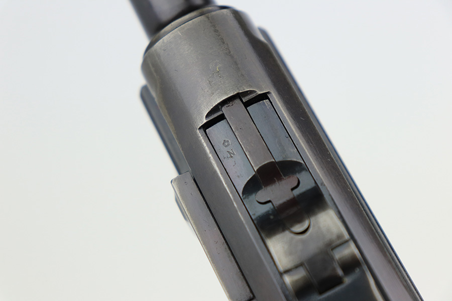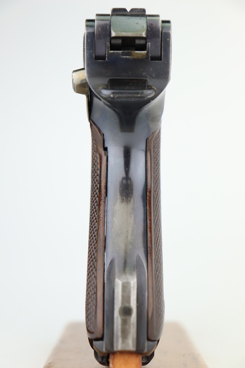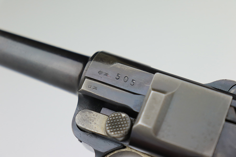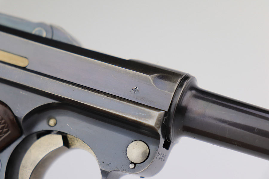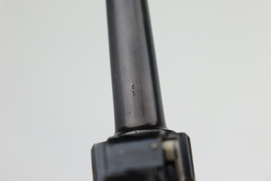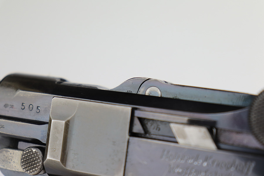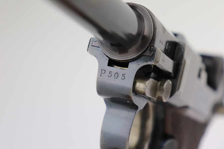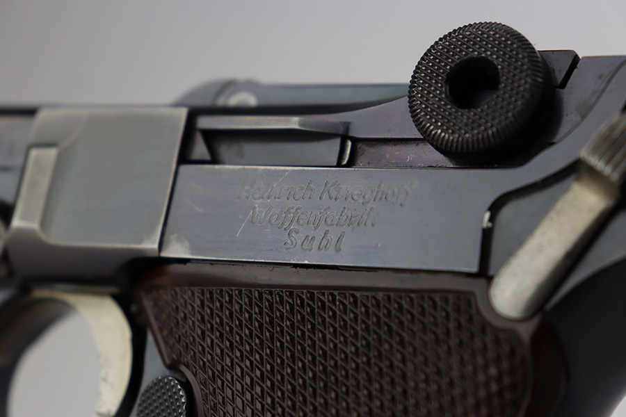 3/6/23 – This is an extremely hard to find P Code Series Krieghoff Luger, with Heinrich Krieghoff frame inscription! In 1935-36, about 10,000 excellent Krieghoff lugers were supplied to the Luftwaffe, but a little more than 1,000 or so were rejected by the Luftwaffe inspectorate on technicalities such as excessive headspace. These otherwise flawless guns were sound enough to be sold for commercial use, and received a P-prefix before the serial number on the frame. The rejection stamp on this one can be seen as a five-pointed star on the right side of the receiver. The left side of the frames on these pistols were inscribed “Heinrich Krieghoff Waffenfabrik Suhl”, and this correct marking can also be found on the pistol listed above. This particular pistol has retained roughly 80% of its original finish. There is noticeable wear on both grip straps and along the whole left side of the gun. A few very light scratches here and there. Fitted with proper reddish Krieghoff grips and comes with a blank wood bottom magazine. Mint bore.
