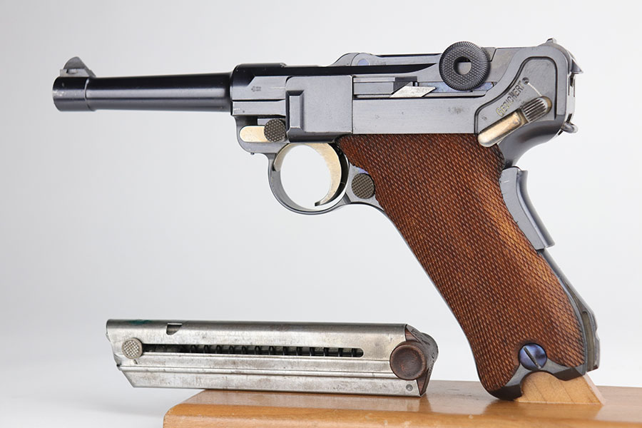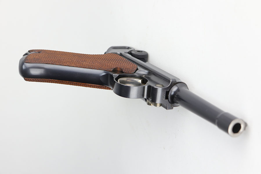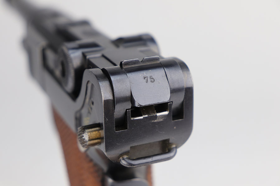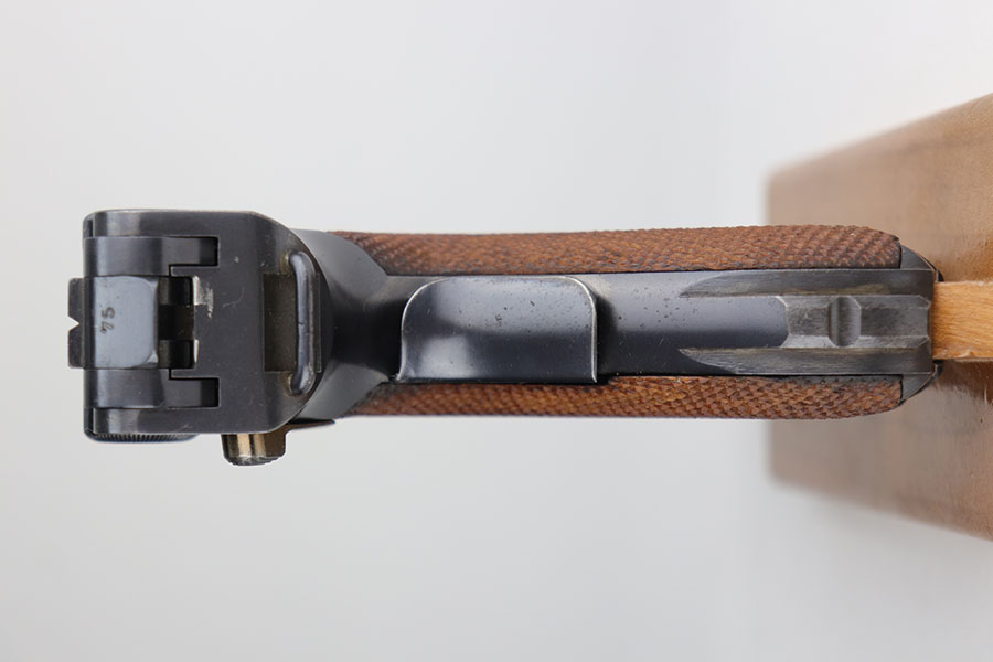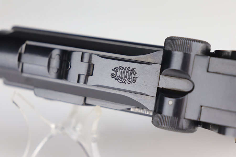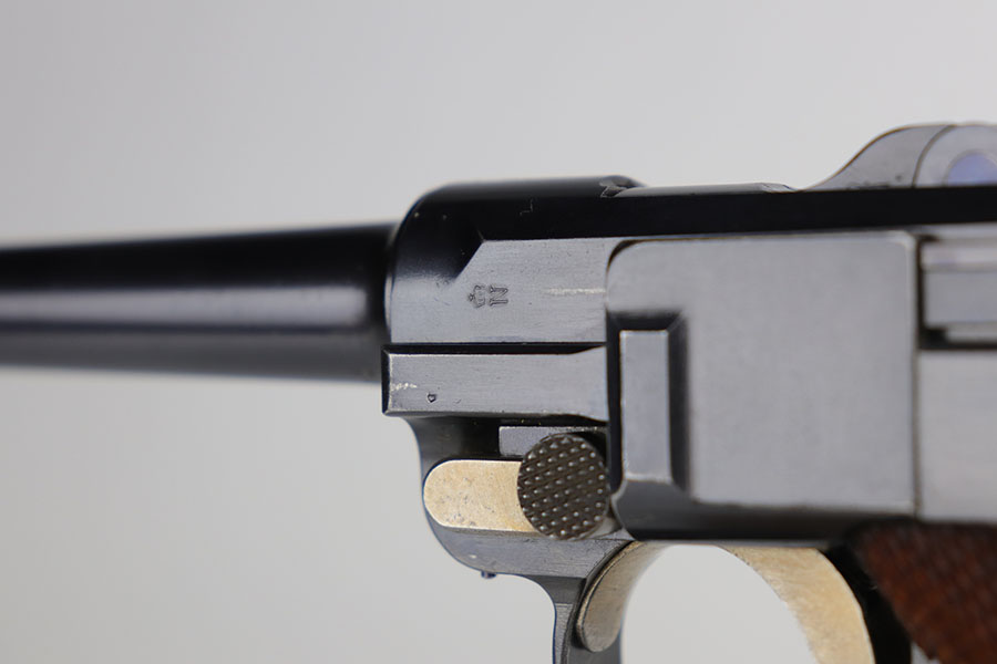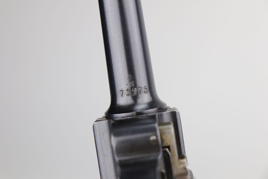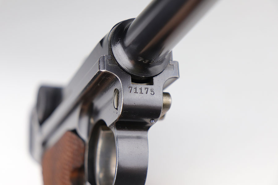 9/21/20 – These later DWM model 1913 Lugers are really an enigma within the Luger community and generally fall within a very narrow serial number range, generally accepted as being in the 71,000-72,000 range however with so few examples even seen it is very difficult to quantify that serial number range as being definitive. It is readily accepted however that the 1914 Commercial Lugers started with serial number in the 71,500 range so this pistol was clearly produced before that model supporting that this is a very rare 1913 Commercial Luger. The key aspects in determining a true Model 1913 commercial is that it is manufactured with the five digit commercial serial number, generally associated with this model, it has no stock lug, which indicates it’s a pre-1914 model and it has the easily identifiable, old style 1906 pattern frame that utilized a grip safety. Interestingly, this model has the stock lug AND the grip safety, where as the 1914 would only have the stock lug. This is the first we’ve encountered of the ultra rare 1913 variation, so we are unsure if this is an even more rare transitional model between the two. The finish appears original and excellent with just a bit of muzzle wear on the left side, and a tiny bit of freckling on the right side of the receiver. Rare, original magazine with marking ‘Cal 9m/m’ on the bottom. The grips are minty and fit very well but left panel is not numbered and right panel is mismatched. The only previous auction sale I could find for the 1913 variation sold for over $20k at Rock Island in 2012, though that one did not have the stock lug.