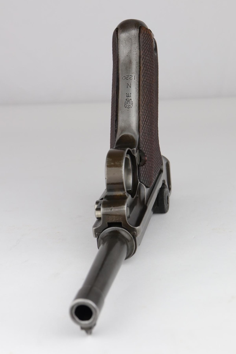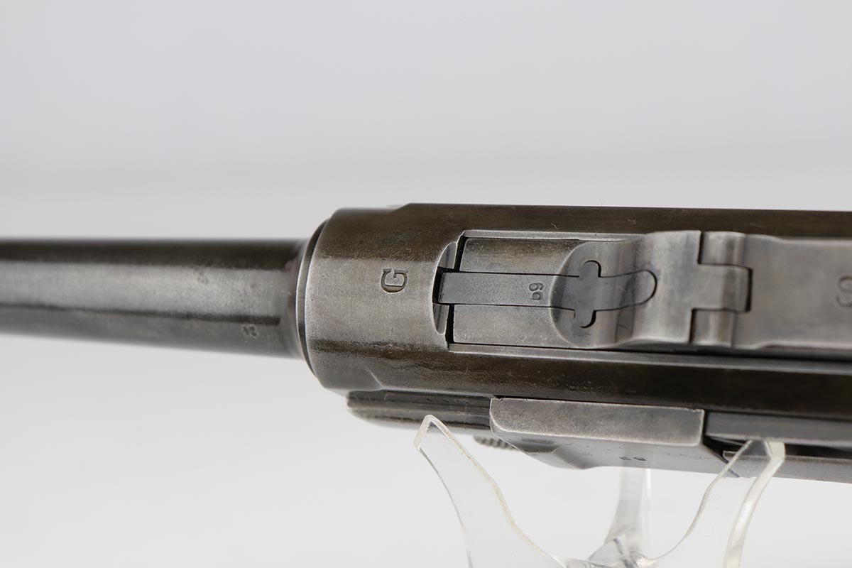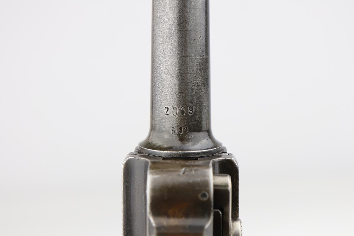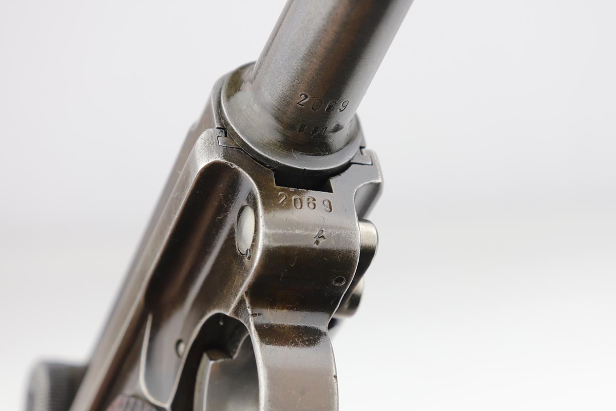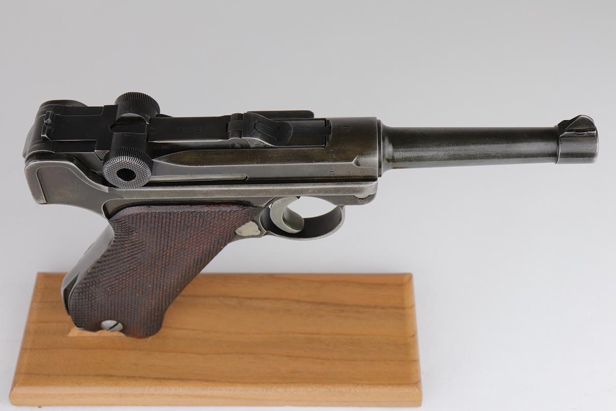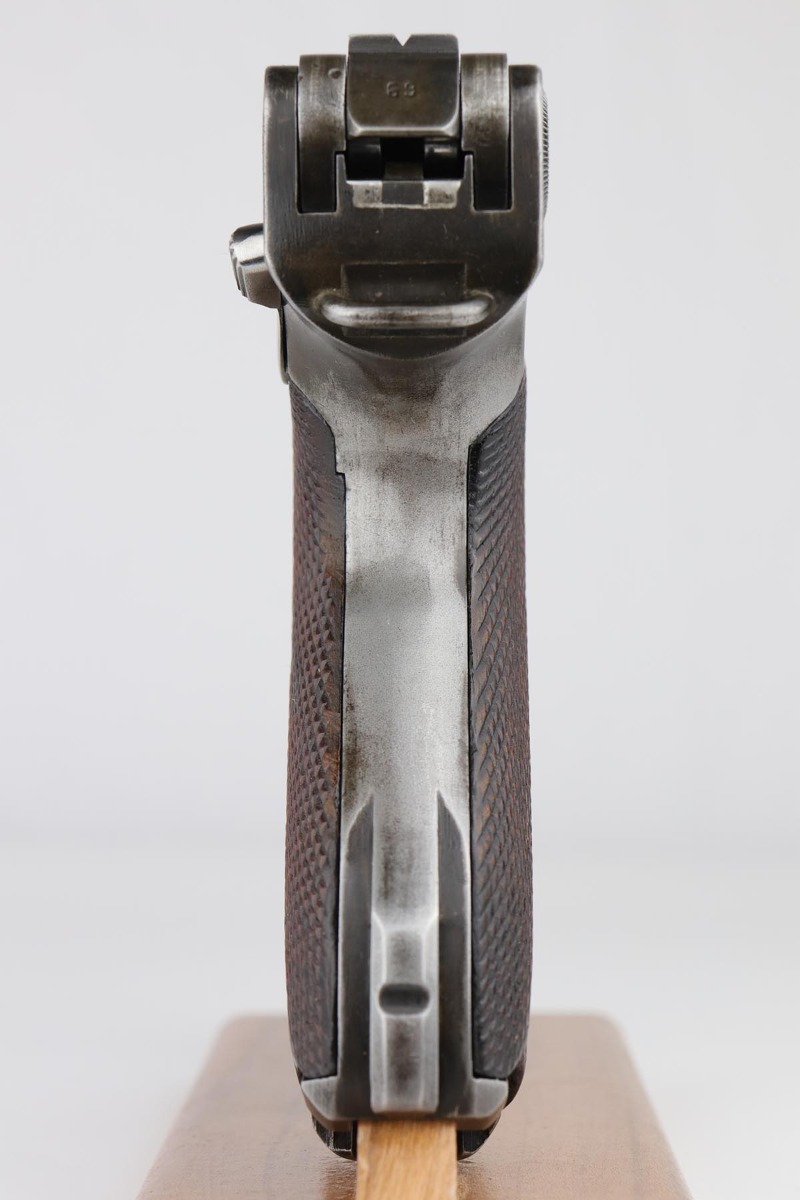 6/18/19 – This is a super rare Navy G Date Luger, one of only about 700 produced, according to Jan Still’s Axis Pistols. This pistol is N property marked and Jan Still states that most of the G Date Lugers were N property marked. It has the correct Type 2 Navy marking on the strap. The original finish is about 50% with general thinning throughout but especially thin straps. There is some minor freckling on the muzzle, but no major pitting. All parts are matching including the grips. The magazine is period correct but numbered to a different Luger. Excellent bore.