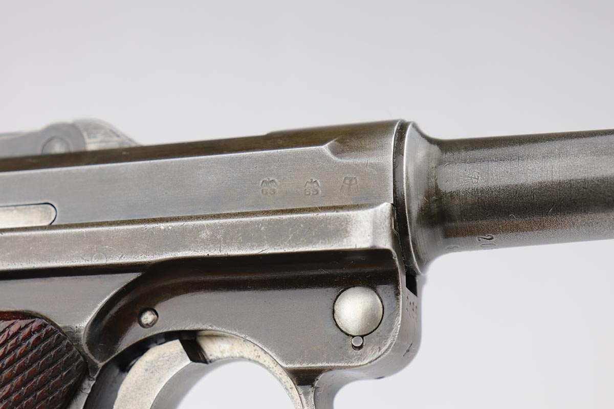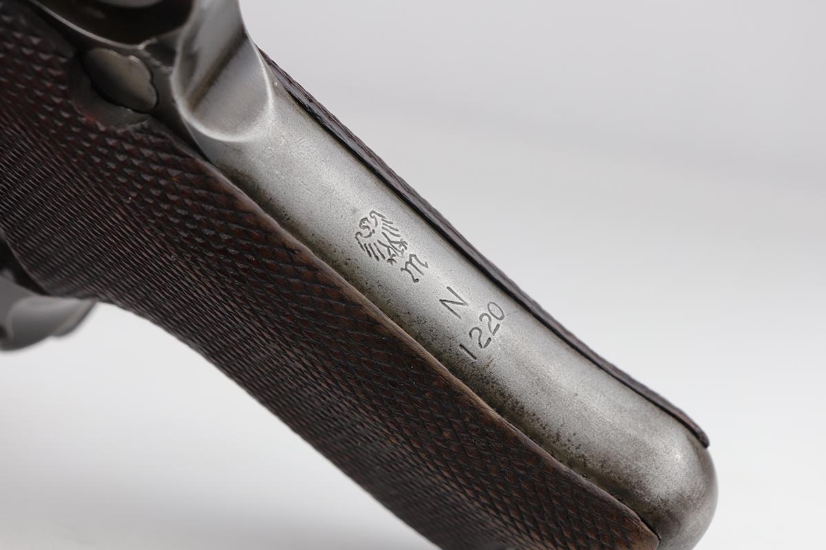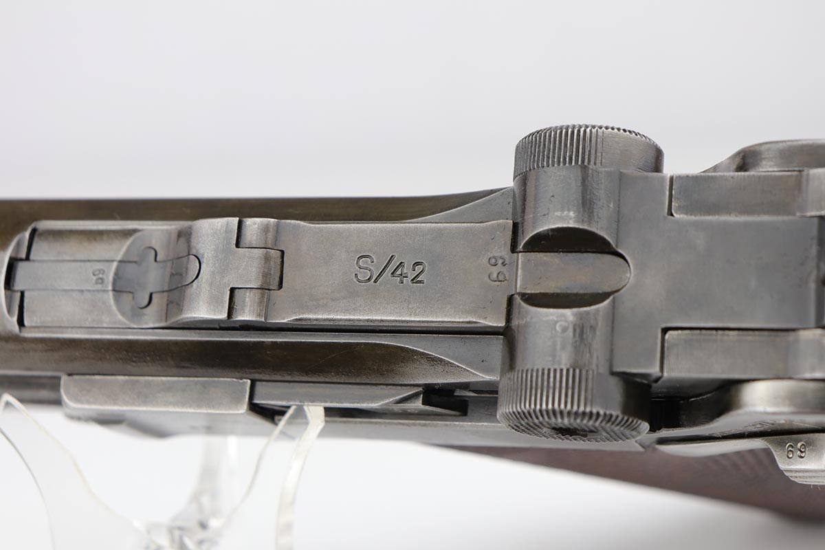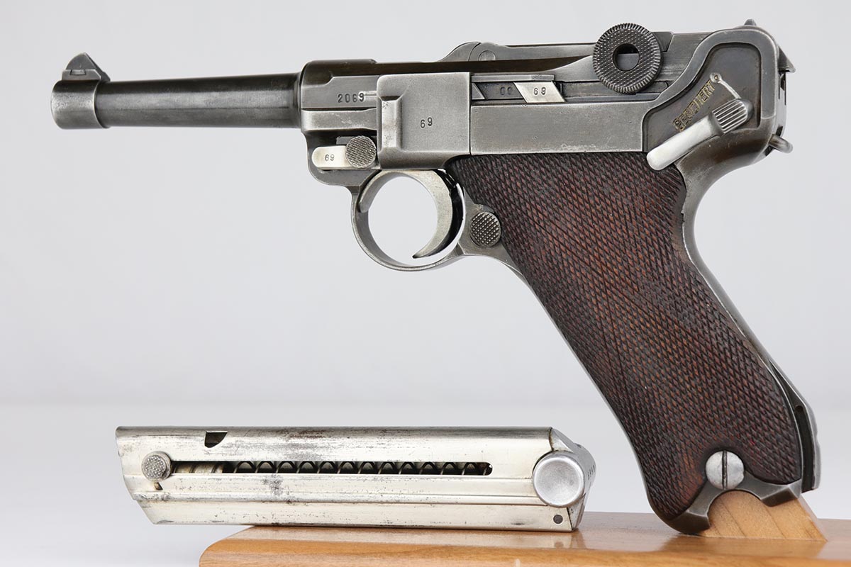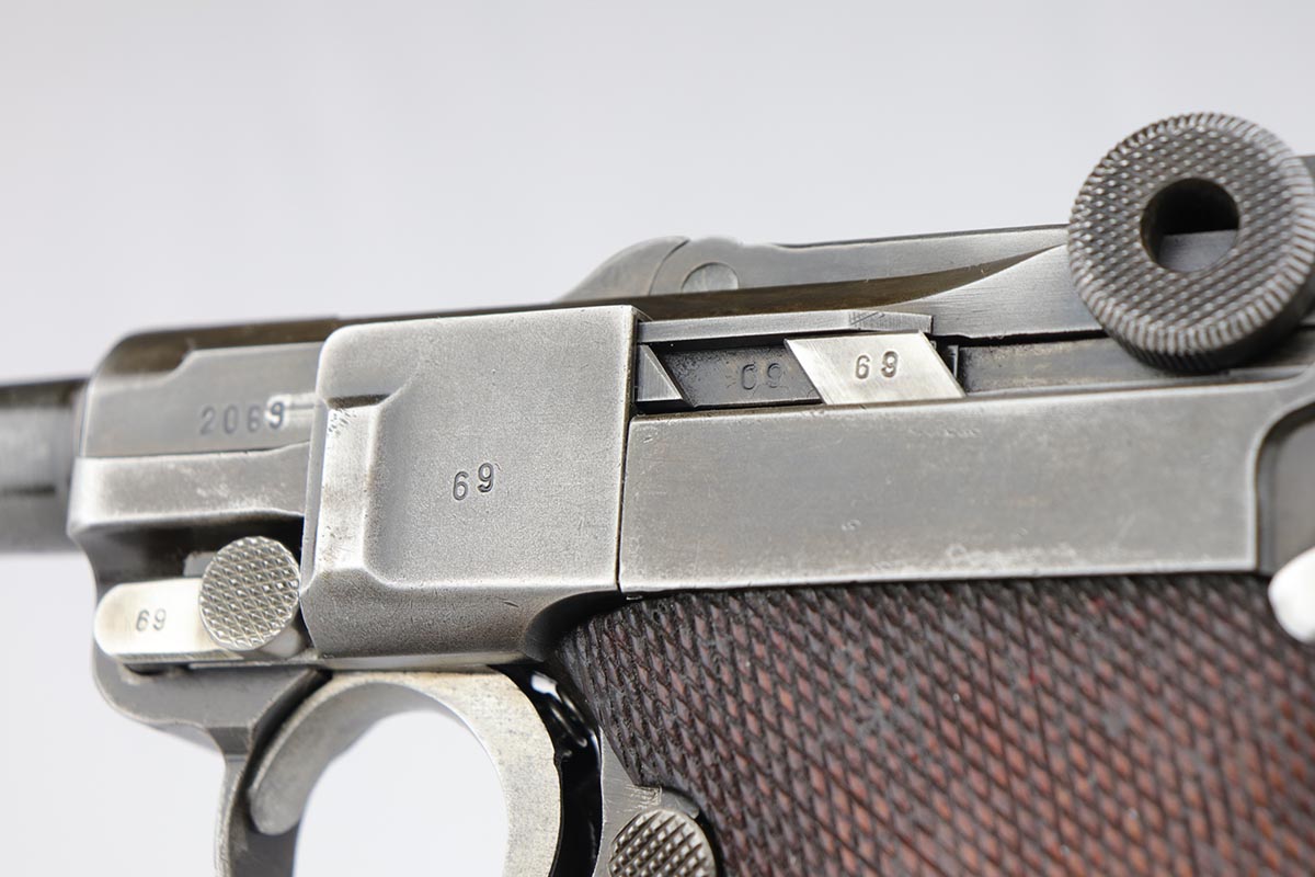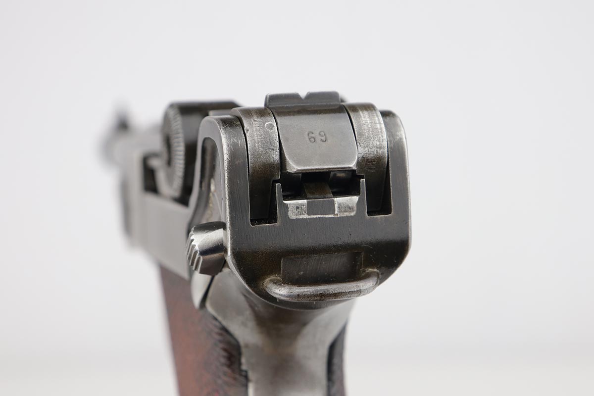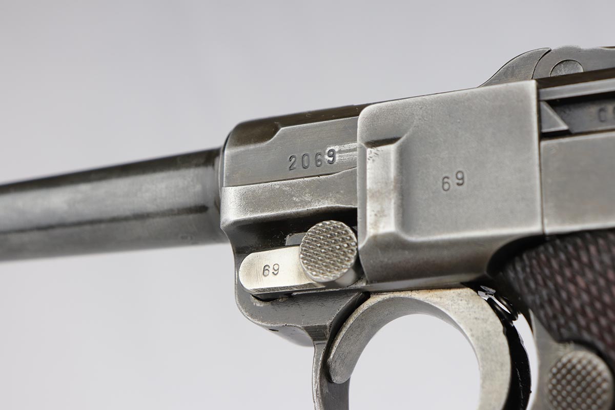 6/18/19 – This is a super rare Navy G Date Luger, one of only about 700 produced, according to Jan Still’s Axis Pistols. This pistol is N property marked and Jan Still states that most of the G Date Lugers were N property marked. It has the correct Type 2 Navy marking on the strap. The original finish is about 50% with general thinning throughout but especially thin straps. There is some minor freckling on the muzzle, but no major pitting. All parts are matching including the grips. The magazine is period correct but numbered to a different Luger. Excellent bore.