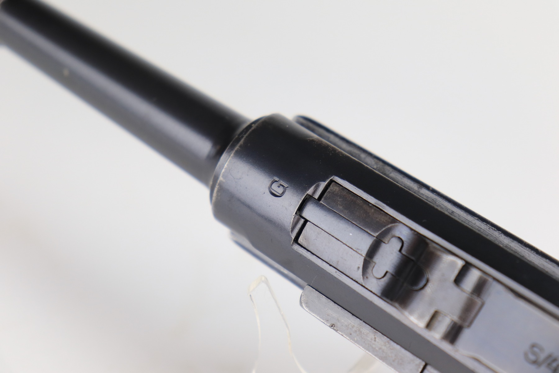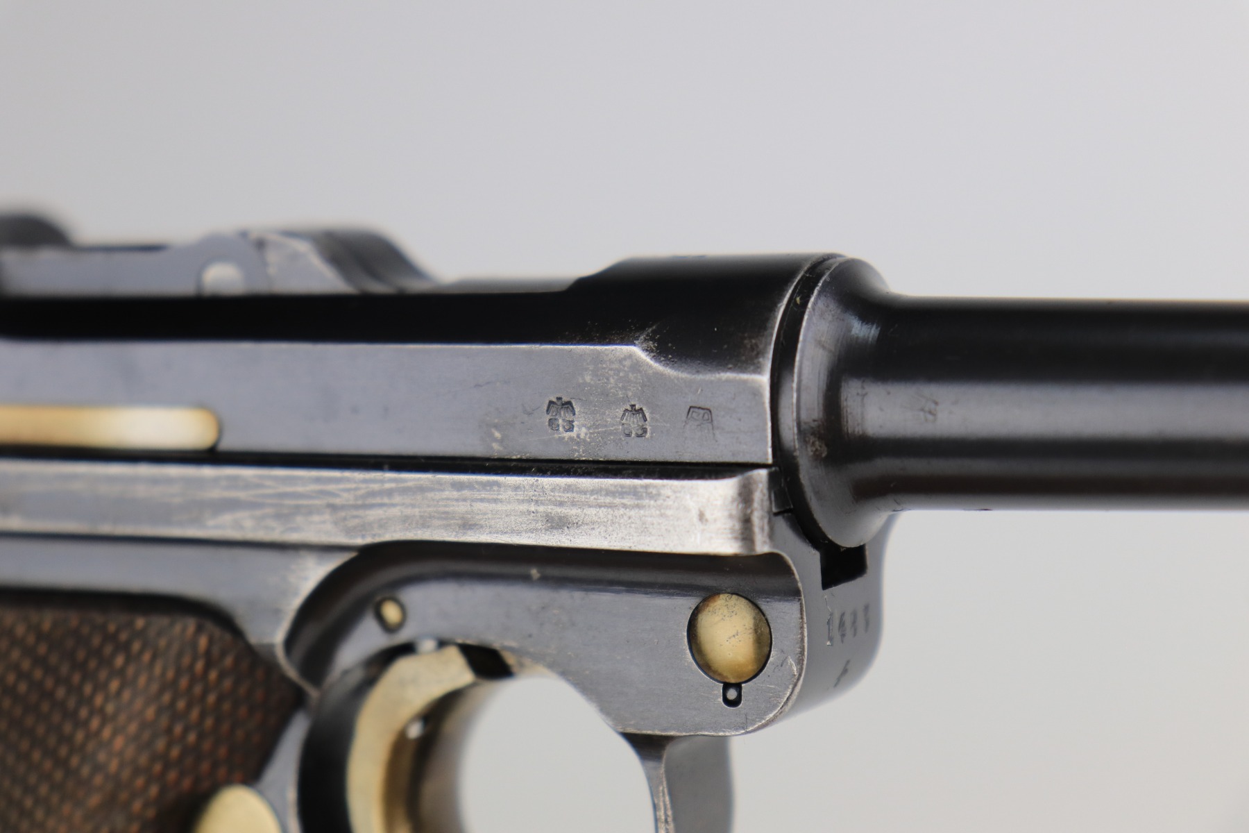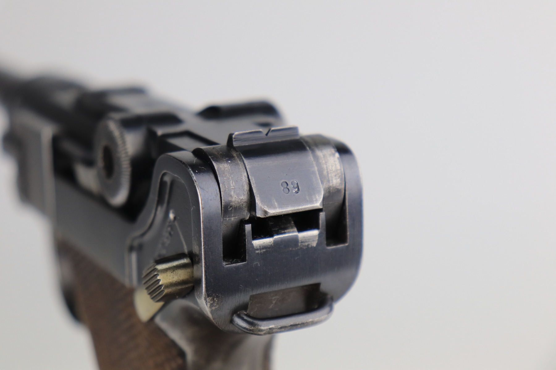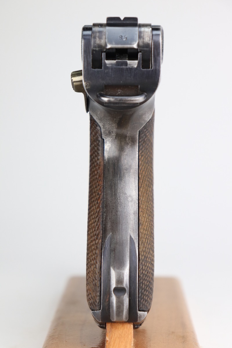 1/8/21 – This is a super rare Navy G Date Luger, one of only about 700 produced, according to Jan Still’s Axis Pistols. This pistol is N property marked and Jan Still states that most of the G Date Lugers were N property marked. It has the correct Type 2 Navy marking on the strap. (A 1935 Navy Eagle acceptance) The gun retains about 85 – 88% of its original finish. There is spotty wear on both straps and minor wear around the muzzle, side plate, and high edges of the frame. It comes with excellent un-numbered grips and a mismatched , period correct magazine. The bore is excellent – shiny with strong rifling. Unfortunately the rear toggle is numbered 89 as seen in a photo. AND the front breech toggle as well as the firing pin are not numbered. Likely these are replacement parts. But in spite of the negative issues, this gun is a nice looking collectors piece.